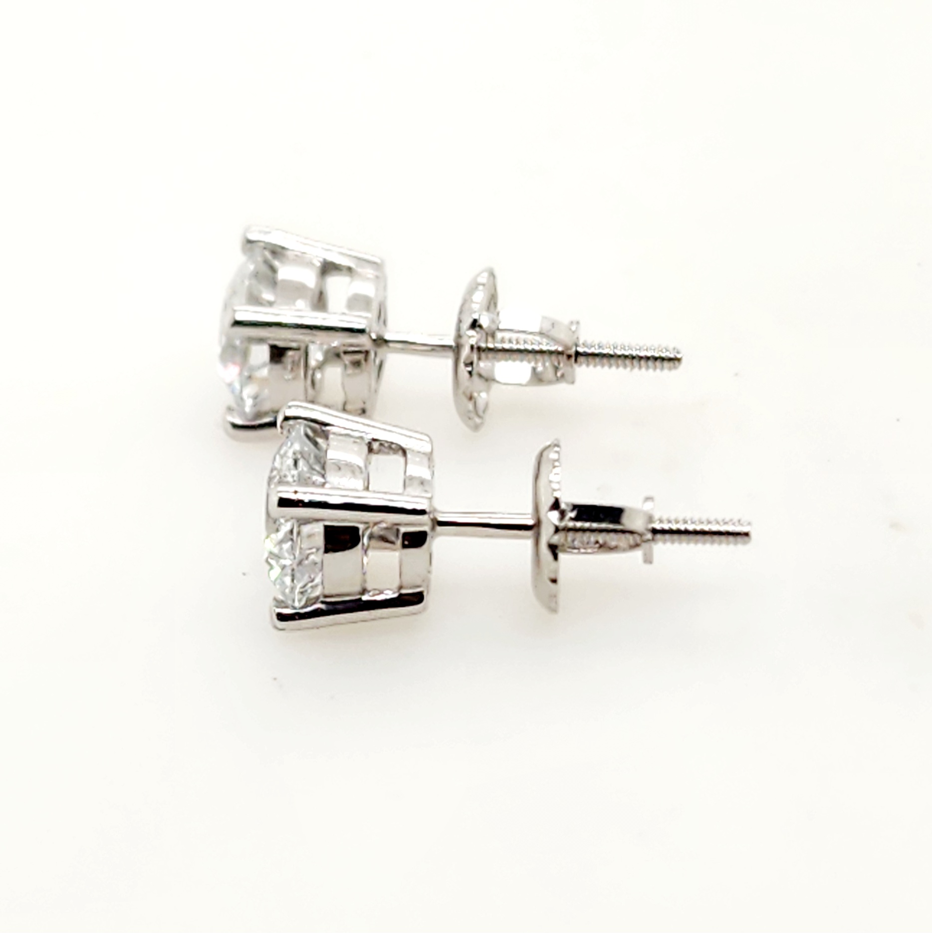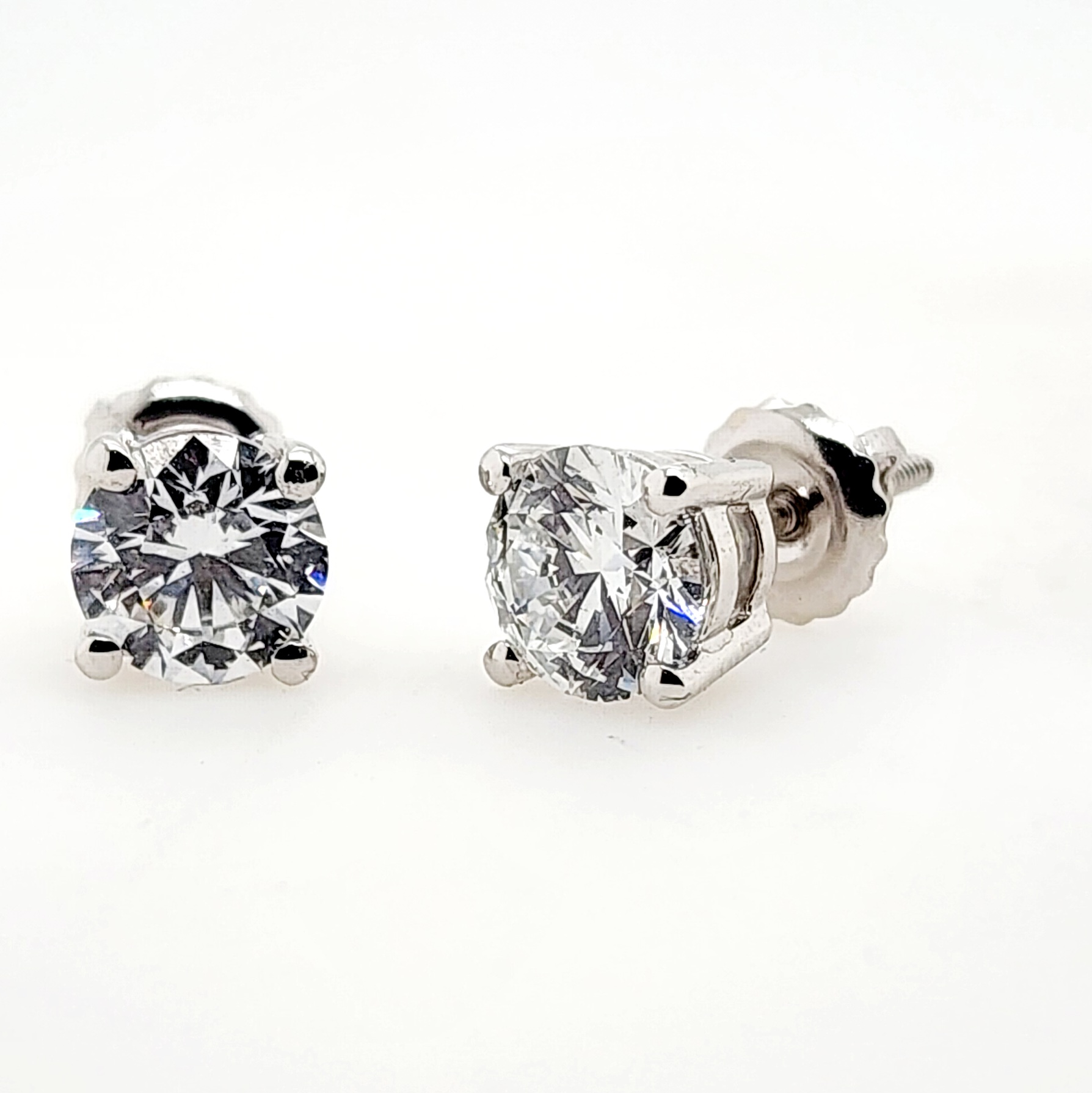 These radiant lab grown diamond stud earrings feature a 4-prong basket setting in a glistening 14k white gold metal. The studs include dazzling round-cut lab grown diamonds with a total weight of 1.50 ct. and are available with screw back butterflies.