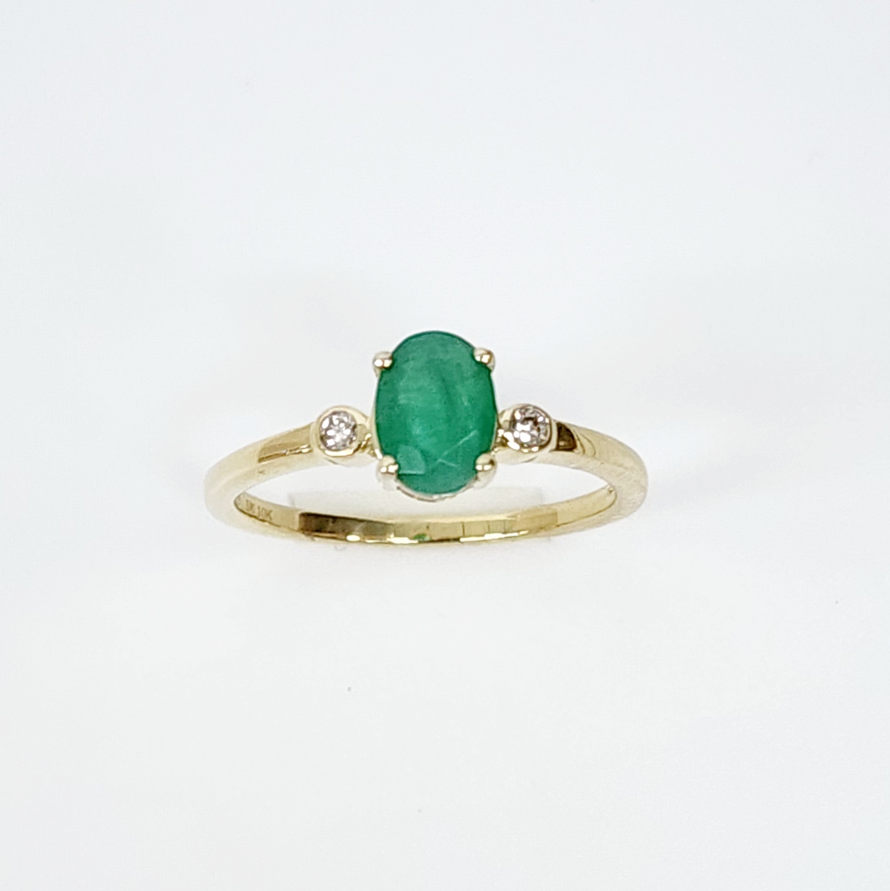 The band, crafted from lustrous 10K yellow gold, is polished to perfection, providing a warm and timeless backdrop that enhances the contrast between the vibrant emerald and dazzling diamonds. This elegant design balances simplicity with sophistication, making it a perfect choice for a special occasion, whether as a cherished gift or a treasured addition to any fine jewelry collection.