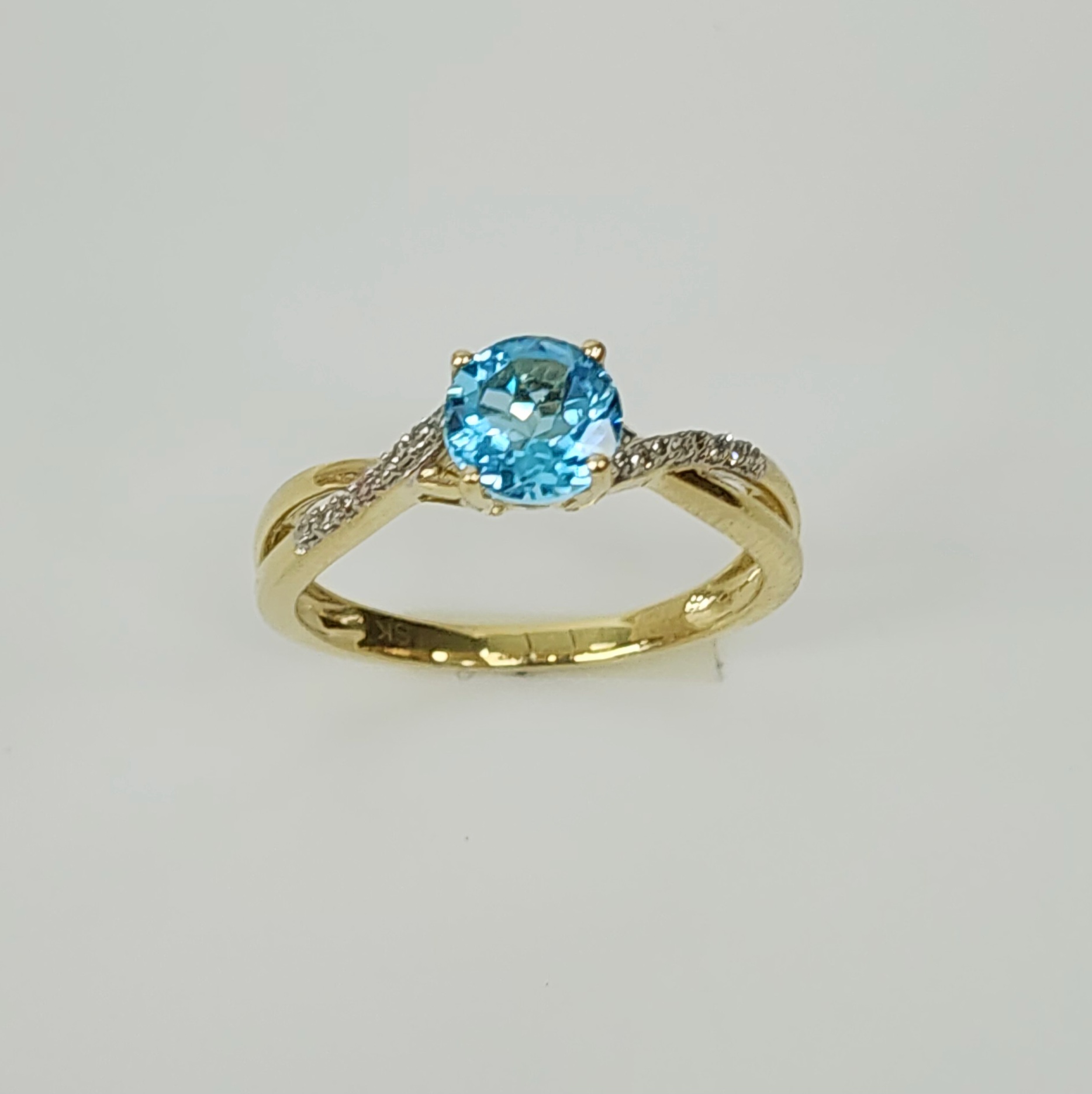 Polished to perfection, the rich yellow gold band provides a warm and luxurious contrast to the cool blue topaz and the shimmering diamonds. The crossover design symbolizes unity and elegance, making this ring not only a statement piece but also a meaningful gift for a loved one. Whether for a special occasion or an addition to a fine jewelry collection, this breathtaking ring is a true testament to superior craftsmanship and timeless beauty.