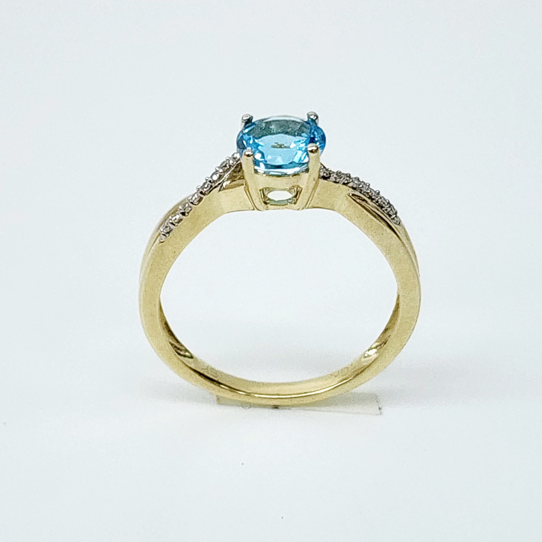 Enhancing the beauty of the topaz, a graceful crossover design adorns the shoulders of the ring, featuring a series of dazzling brilliant-cut white diamonds. These sparkling accents, with a total weight of 0.05 carats, are meticulously set in a secure four-claw setting, allowing maximum light reflection for an exquisite shimmer from every angle.