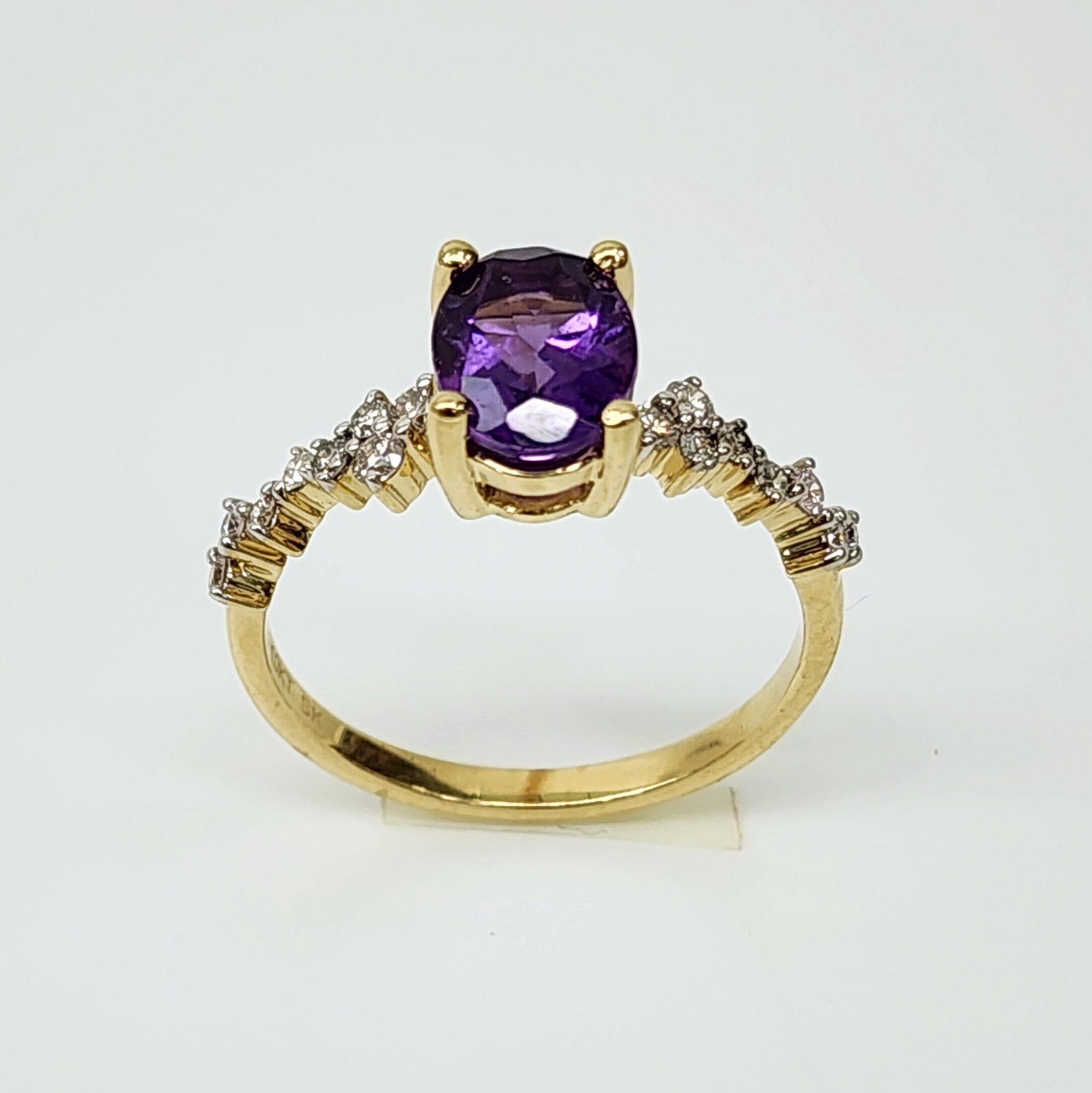 Adding to its elegance, a dazzling arrangement of natural diamonds is artfully scattered along the shank on both sides of the center stone. These carefully placed round diamonds, totaling 0.25 carats, create a sparkling contrast against the deep purple amethyst, lending a luxurious and sophisticated touch to the design.