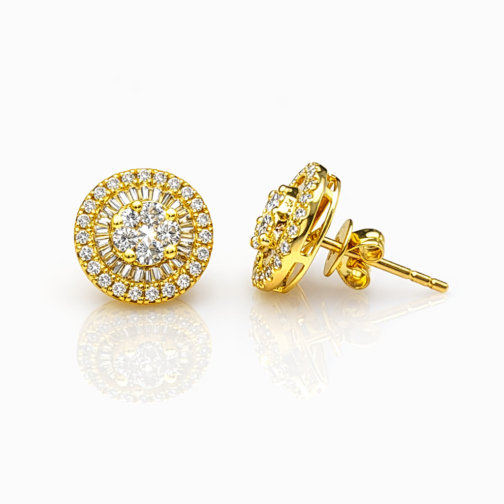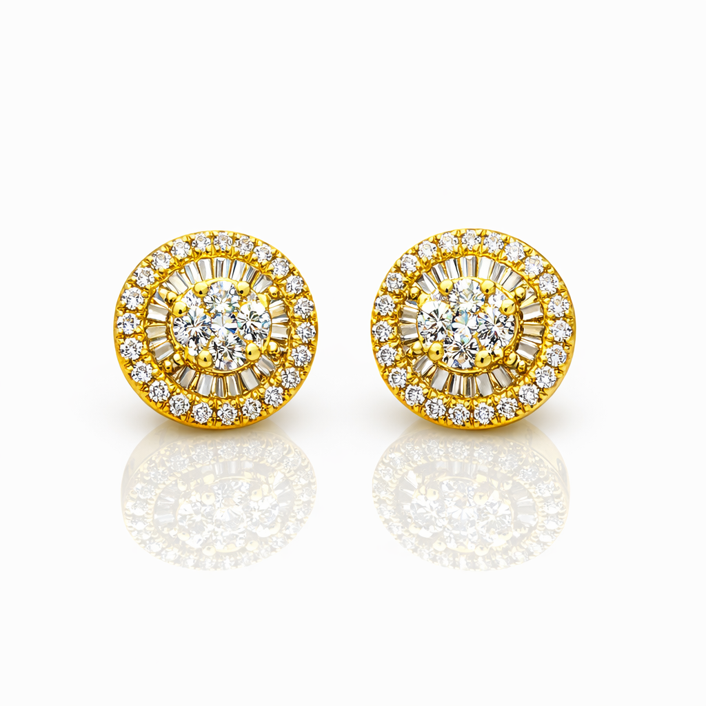 At the centre, a clustered arrangement of round diamonds is securely claw set, framed by a radiant row of baguette diamonds that adds a distinctive “sunburst” effect. Surrounding this is a shimmering halo of round diamonds, giving the earrings a beautiful layered sparkle and premium finish.