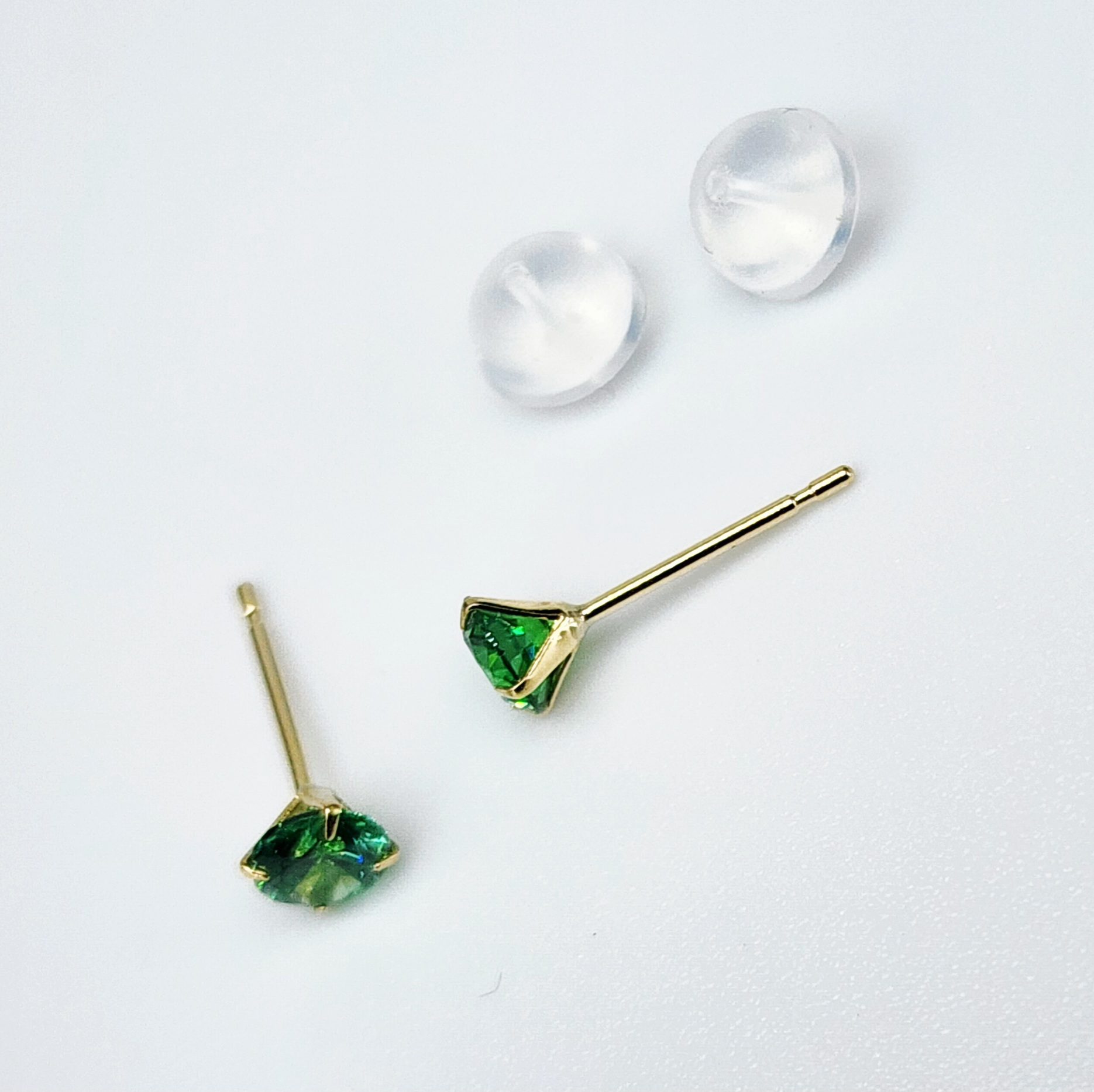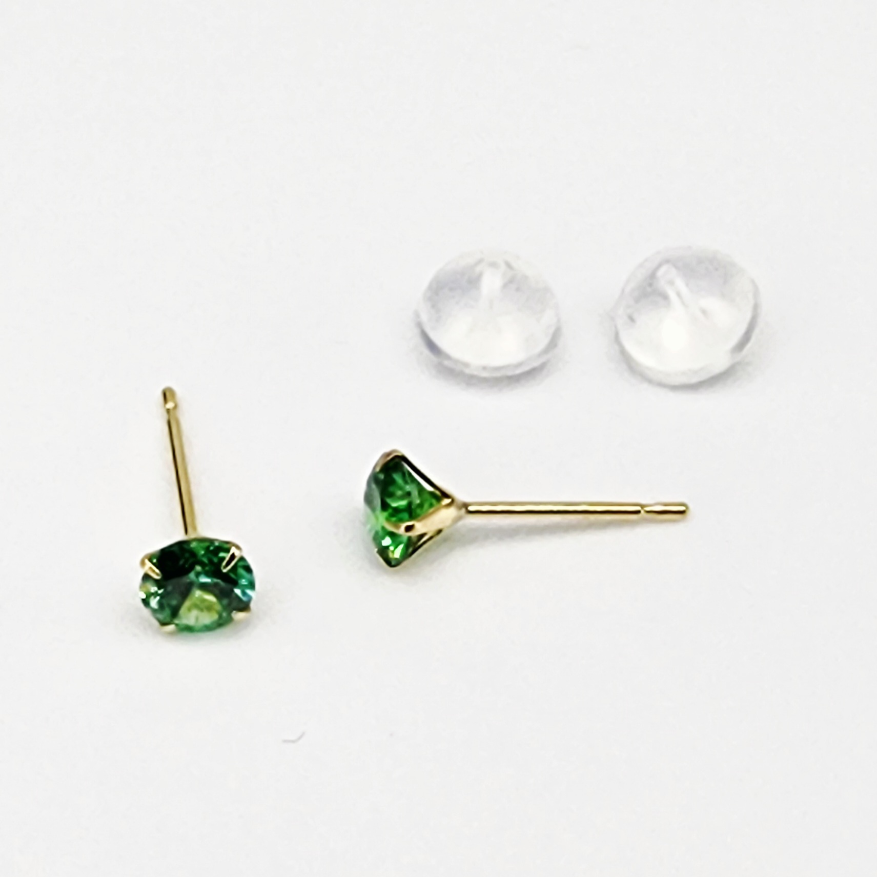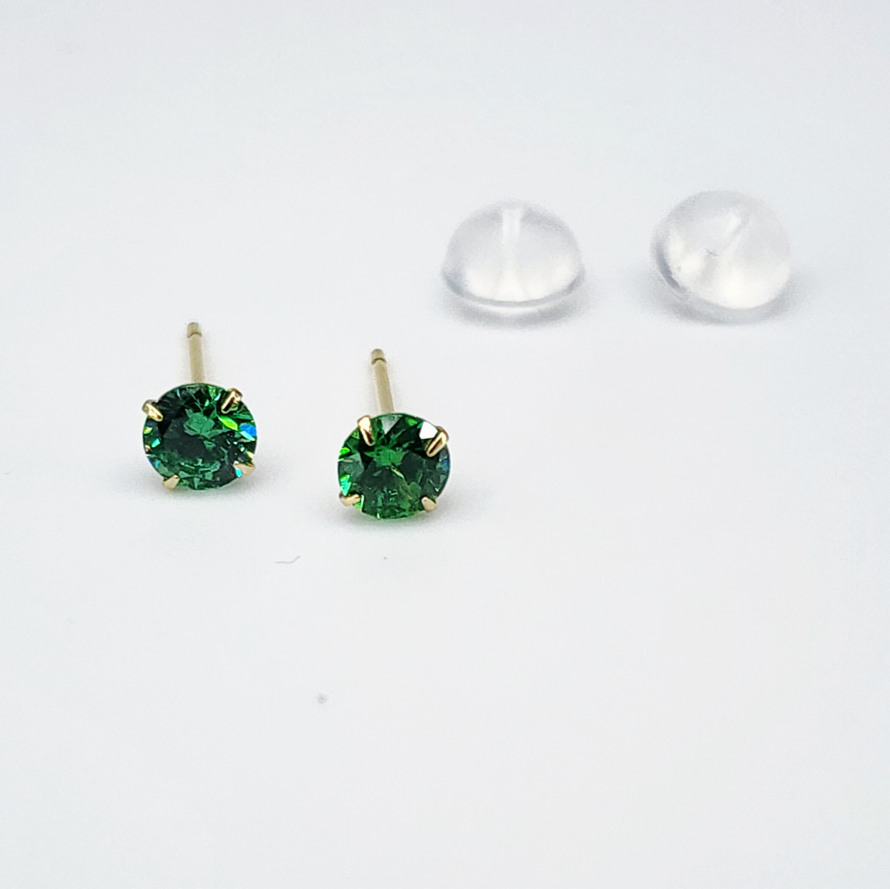 Crafted in luxurious 18ct yellow gold, these elegant stud earrings feature a 4mm round emerald-green cubic zirconia, securely held in a classic four-claw setting. Designed for everyday comfort and peace of mind, they come with silicone backs for added security. Perfect for adding a subtle pop of colour and sophistication to any look.
