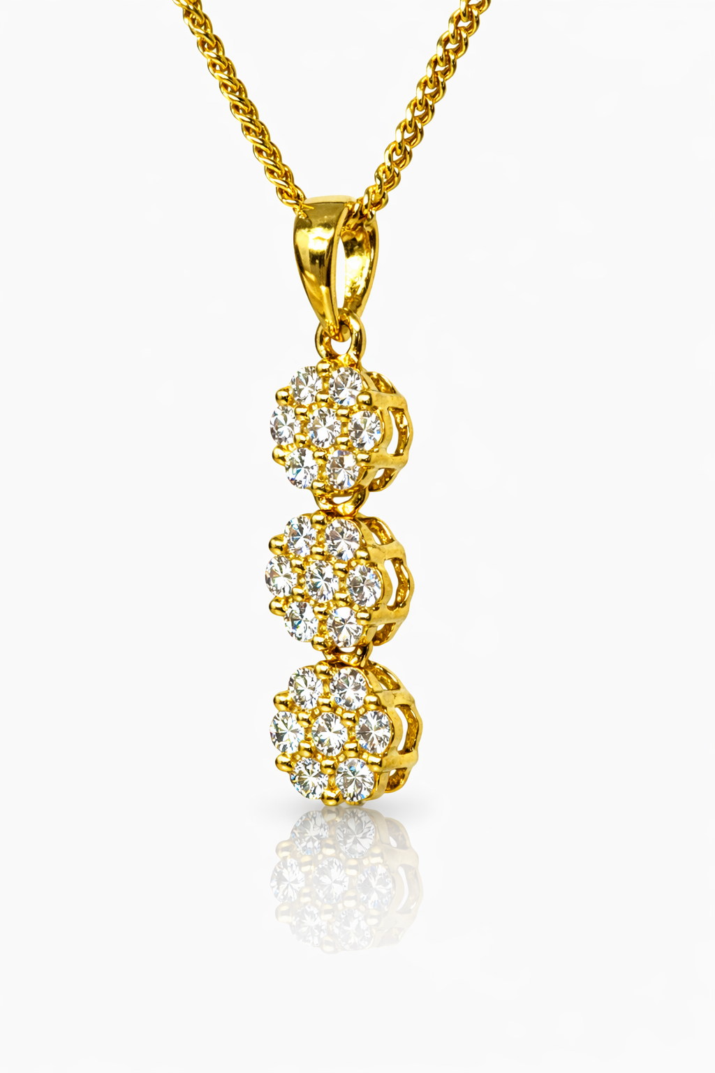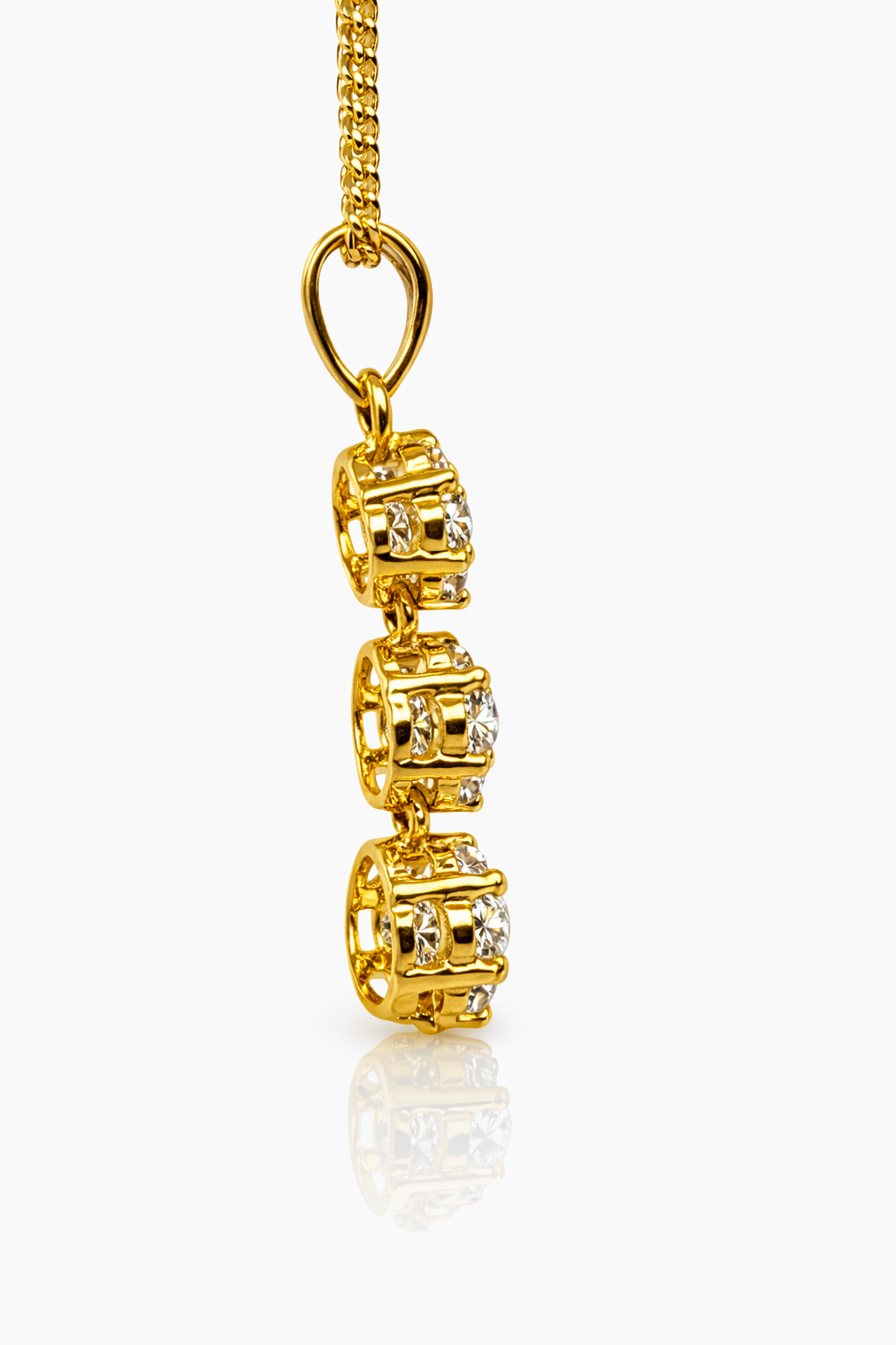 Add timeless sparkle to your everyday look with this elegant 18ct yellow gold diamond triple cluster pendant. Featuring three perfectly matched round clusters arranged in a vertical drop, this pendant delivers beautiful movement and brilliant shine ideal for layering or wearing as a standalone statement.
