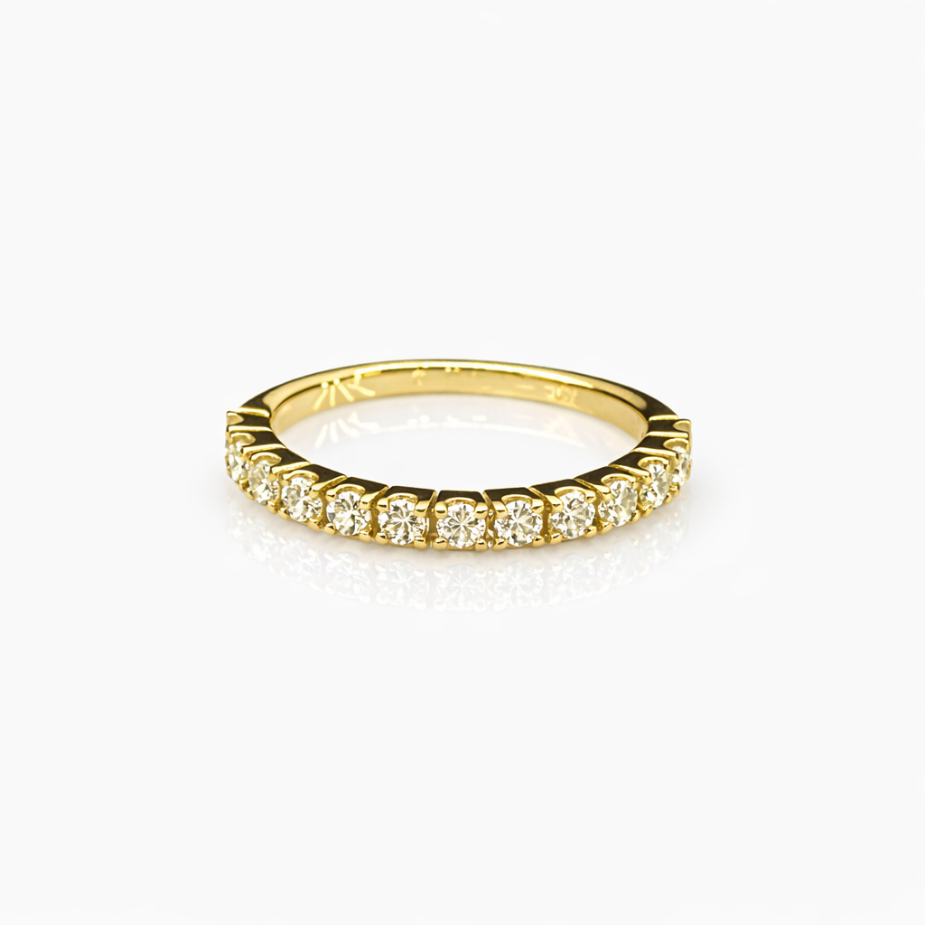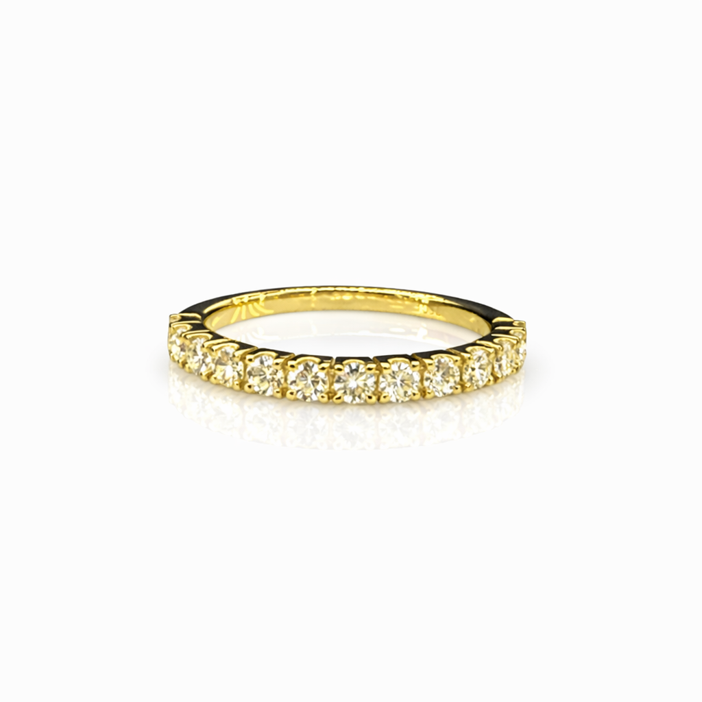 Each diamond is individually secured in a traditional 4-claw setting, allowing maximum light exposure for enhanced brilliance while ensuring long-term security. The diamonds are evenly spaced across the top of the band, creating a continuous line of sparkle that sits comfortably on the finger.