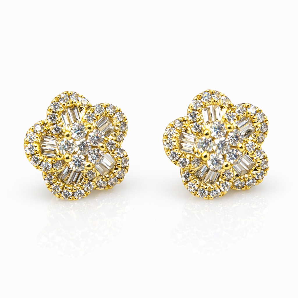 Make a statement with these brilliant 18ct yellow gold diamond flower cluster stud earrings, designed to sparkle from every angle. Each stud features a beautiful floral cluster made with a combination of round brilliant-cut diamonds and sleek baguette-cut diamonds, creating a radiant, multi-dimensional shine that looks luxurious on the ear.