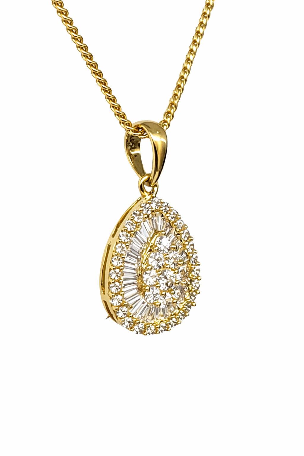 Crafted in luxurious 18ct yellow gold, this elegant teardrop-shaped diamond pendant showcases refined craftsmanship and timeless brilliance. Designed to sit beautifully on the neckline, the pendant features a striking combination of round brilliant-cut and baguette-cut natural diamonds, arranged to maximise sparkle and depth.