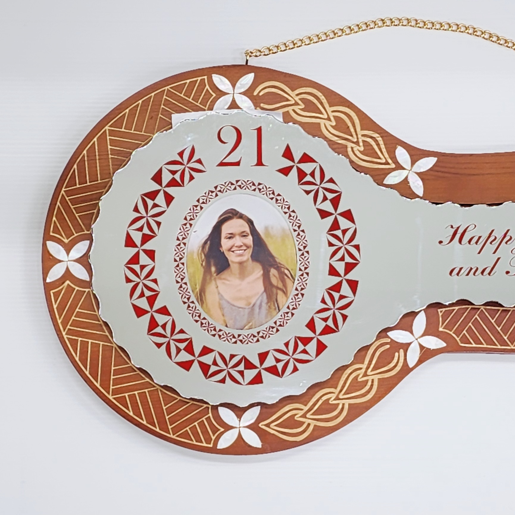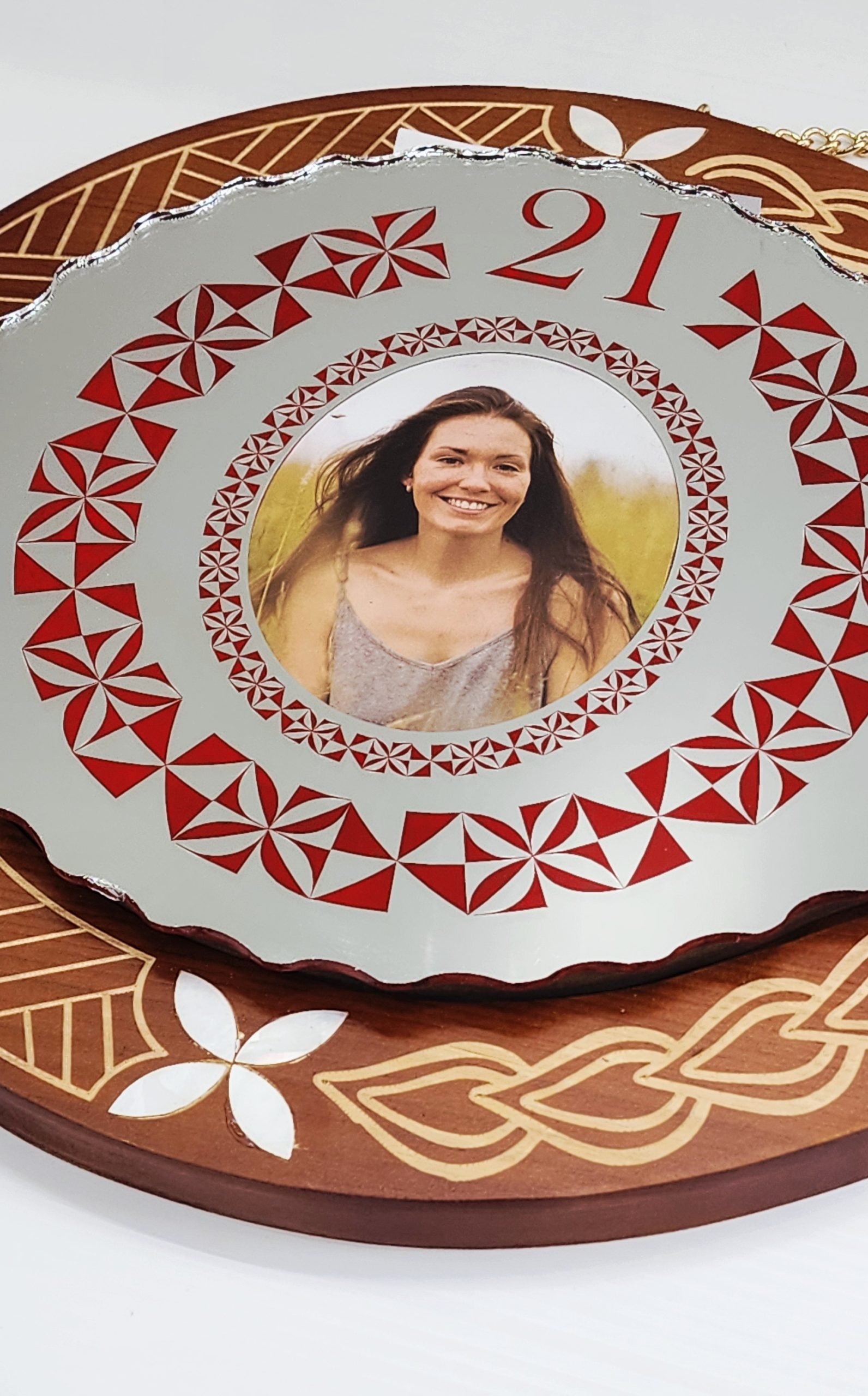 To the left of the mirror insert, there is an oval photo slot, beautifully framed with red Tongan patterns and the number “21” printed above it — making it ideal for commemorating a 21st birthday.