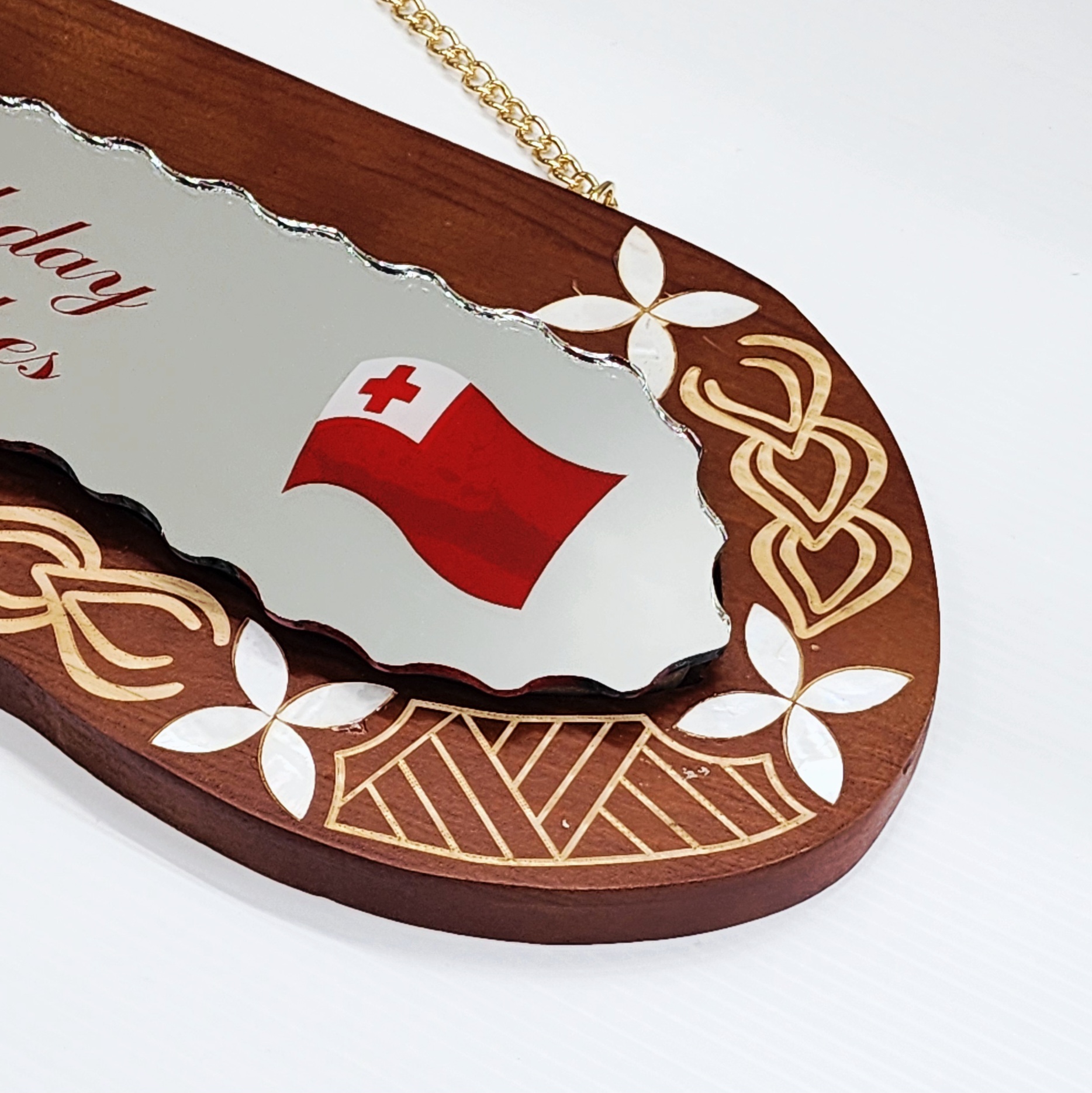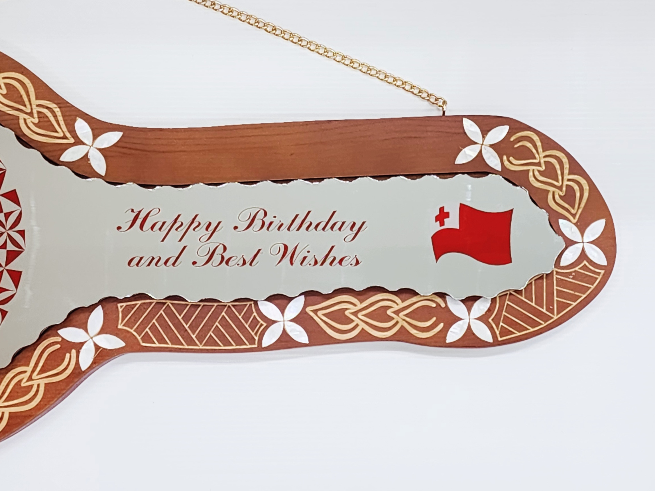Celebrate a special milestone with this uniquely crafted wooden birthday key, featuring rich brown shading and elegant cultural details. The centrepiece is a mirror insert decorated with traditional Tongan designs. On the right-hand side of the mirror, the message “Happy Birthday and Best Wishes!” is printed in bold red, alongside the Tongan flag, symbolising cultural pride and celebration.