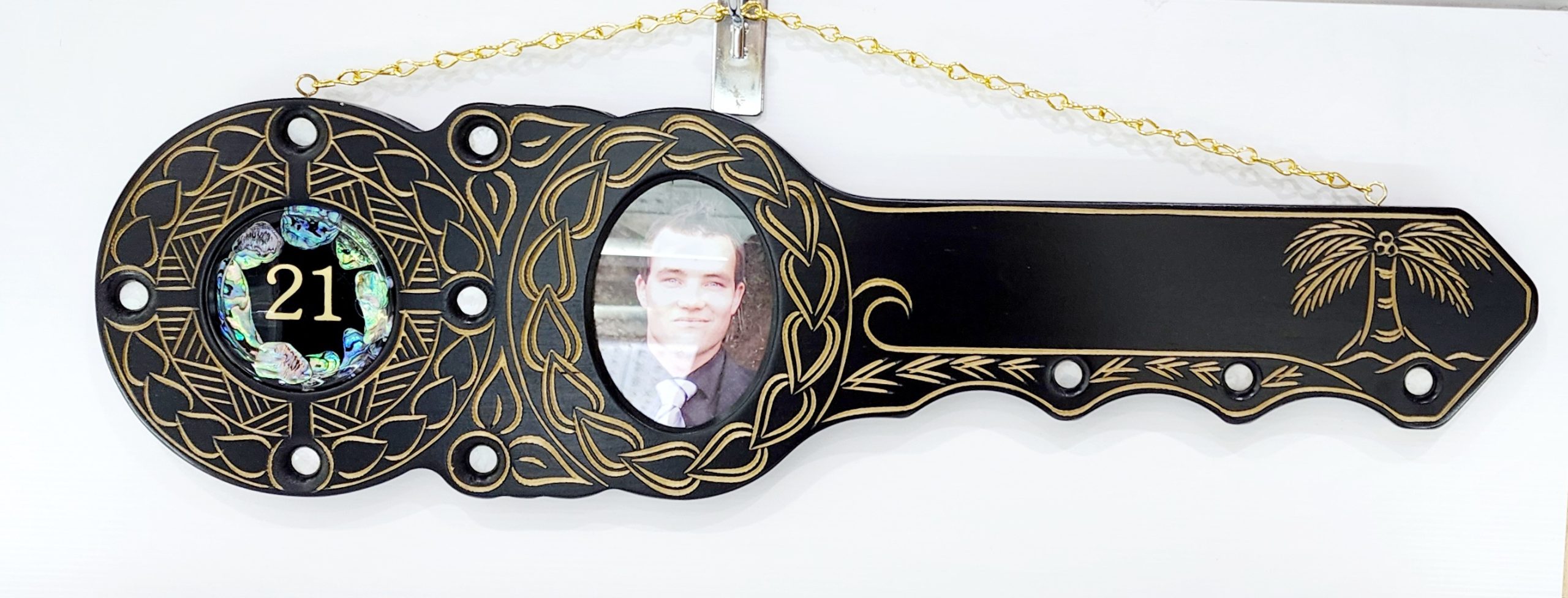 21st Hand Carved Island Design Key with 21 Paua Shell Disc Insert