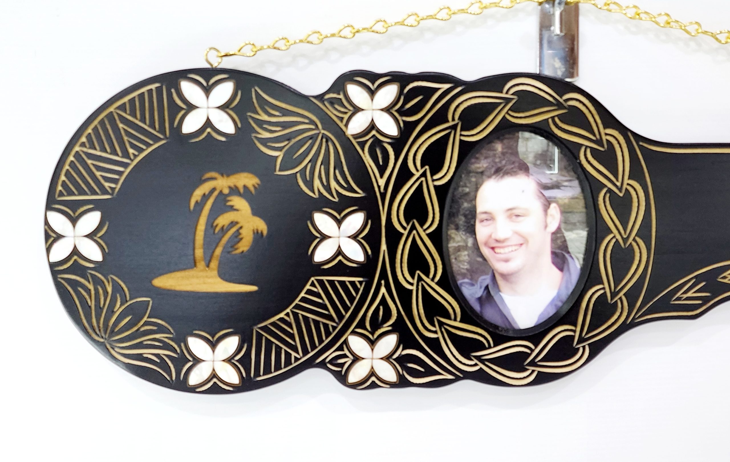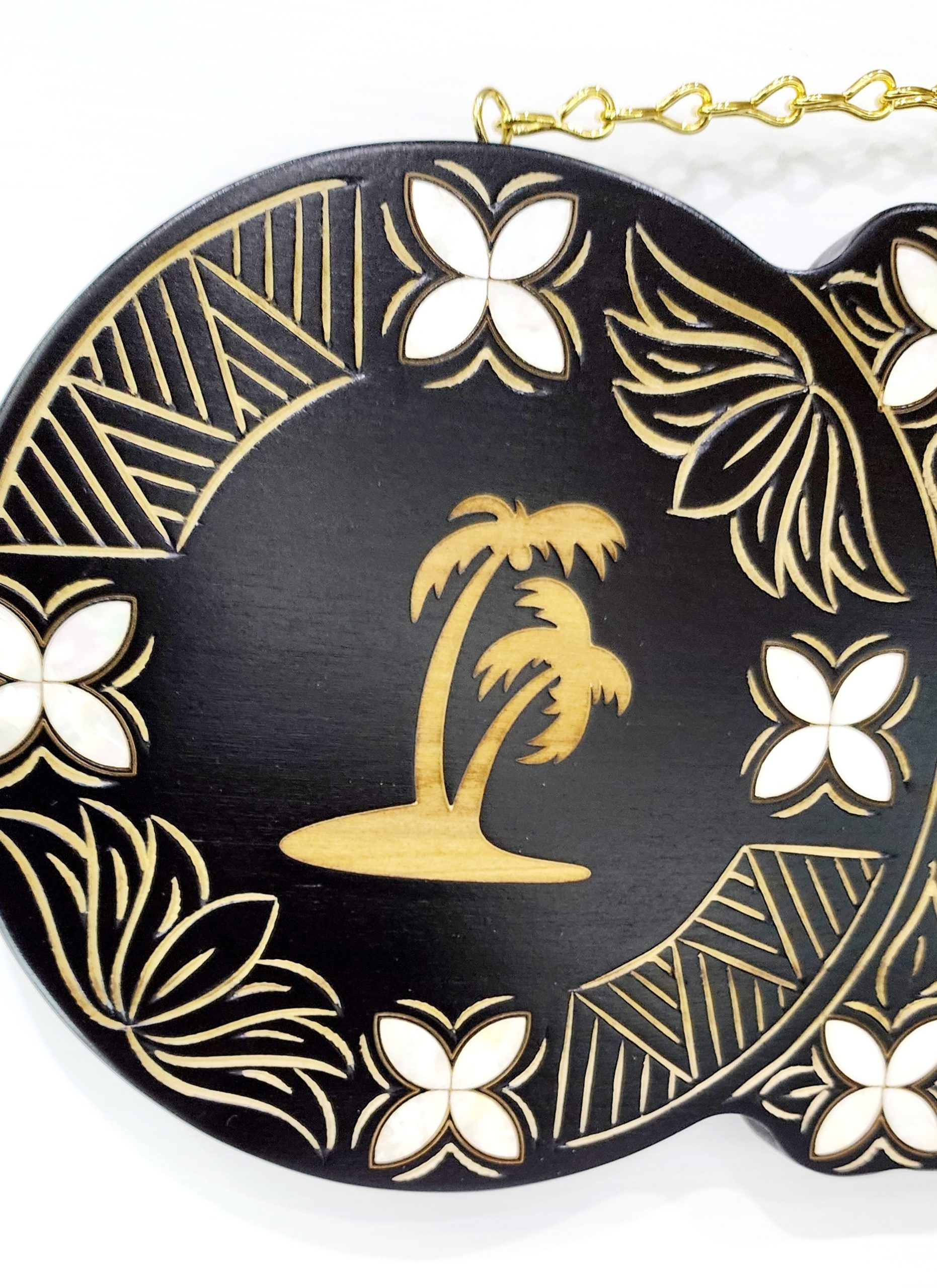 The key has got 6x Flower Petal Design & 3x Round Disk inlays made out of white mother of pearl shell around the key with laser engraved palm tree design on the left hand side of the key.