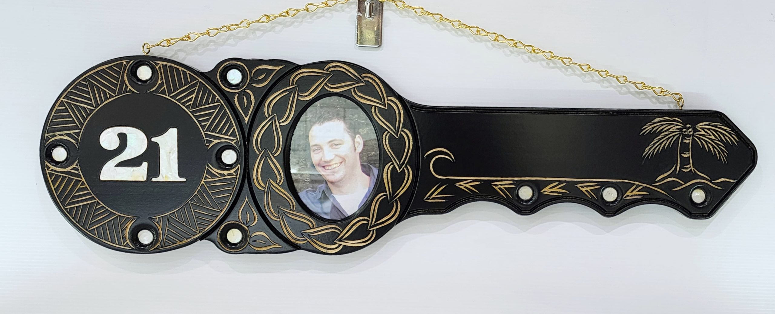 21st Hand Carved Island Design Key with Mother of Pearl “21” Inlay