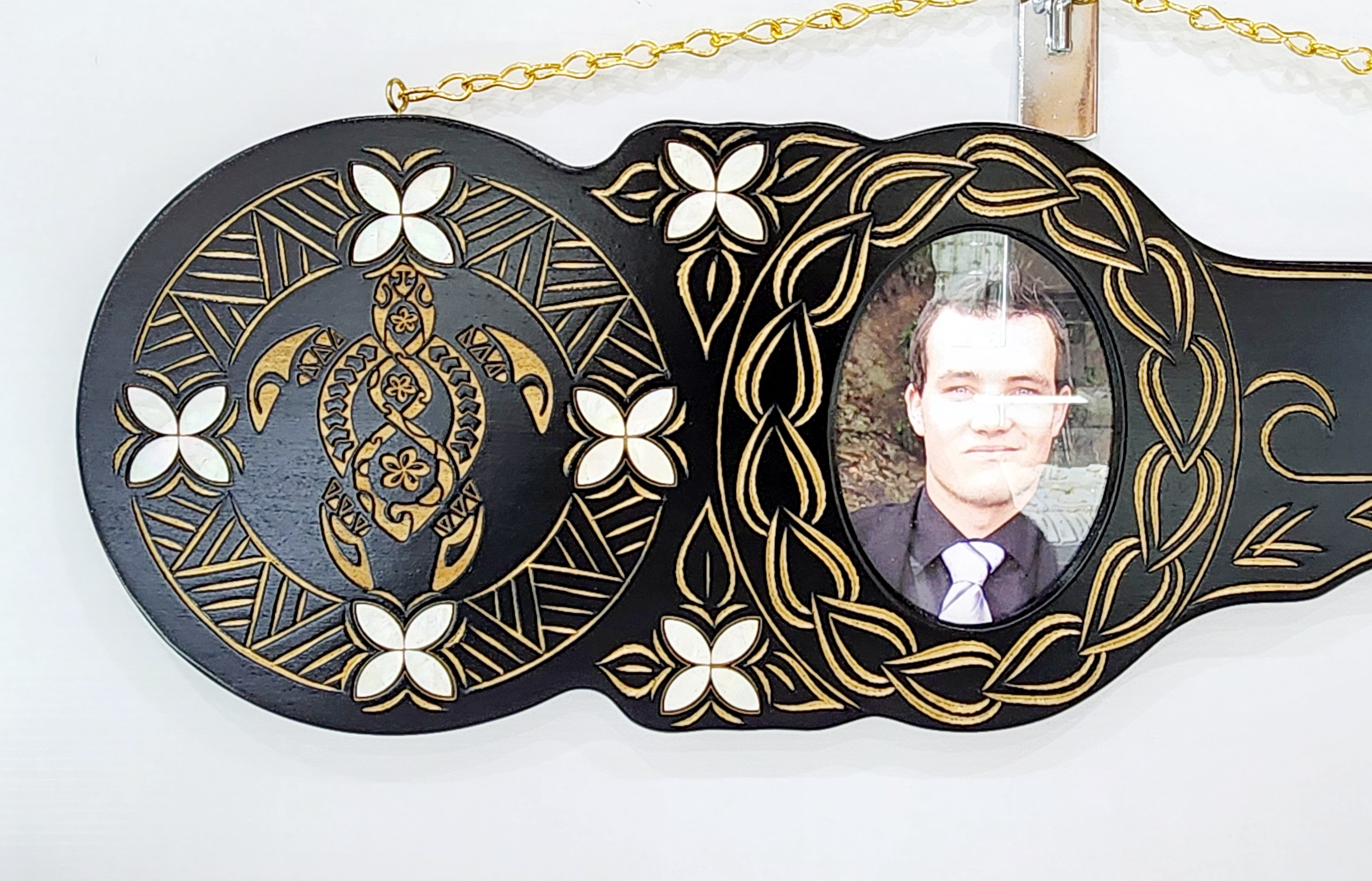 The key has got 6x Flower Petal Design & 3x Round Disk inlays made out of white mother of pearl shell around the key with laser engraved polynesian tattoo design Hui turtle triple twist on the left hand side of the key.