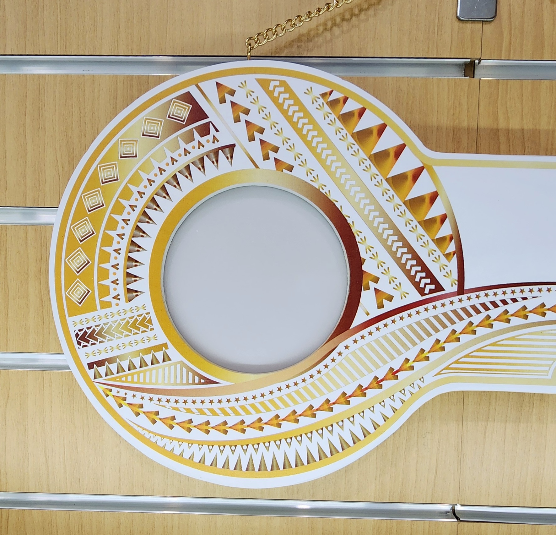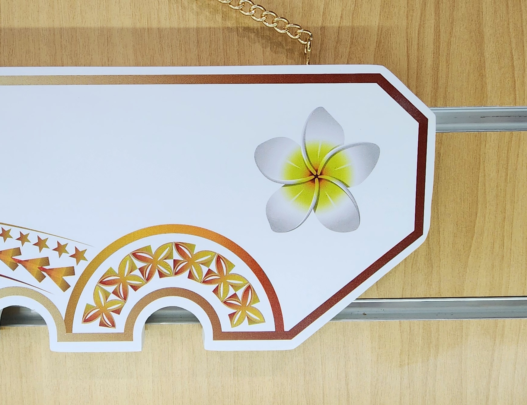 This birthday key is made out of solid timber with white base colour. On top of the white colour there is Golden Red Theme UV printed island patterns with white frangipani flower on the far right hand side. The stand has also Golden Red colour theme border to match the key. The key comes with a golden colour chain ready to hang on the wall.