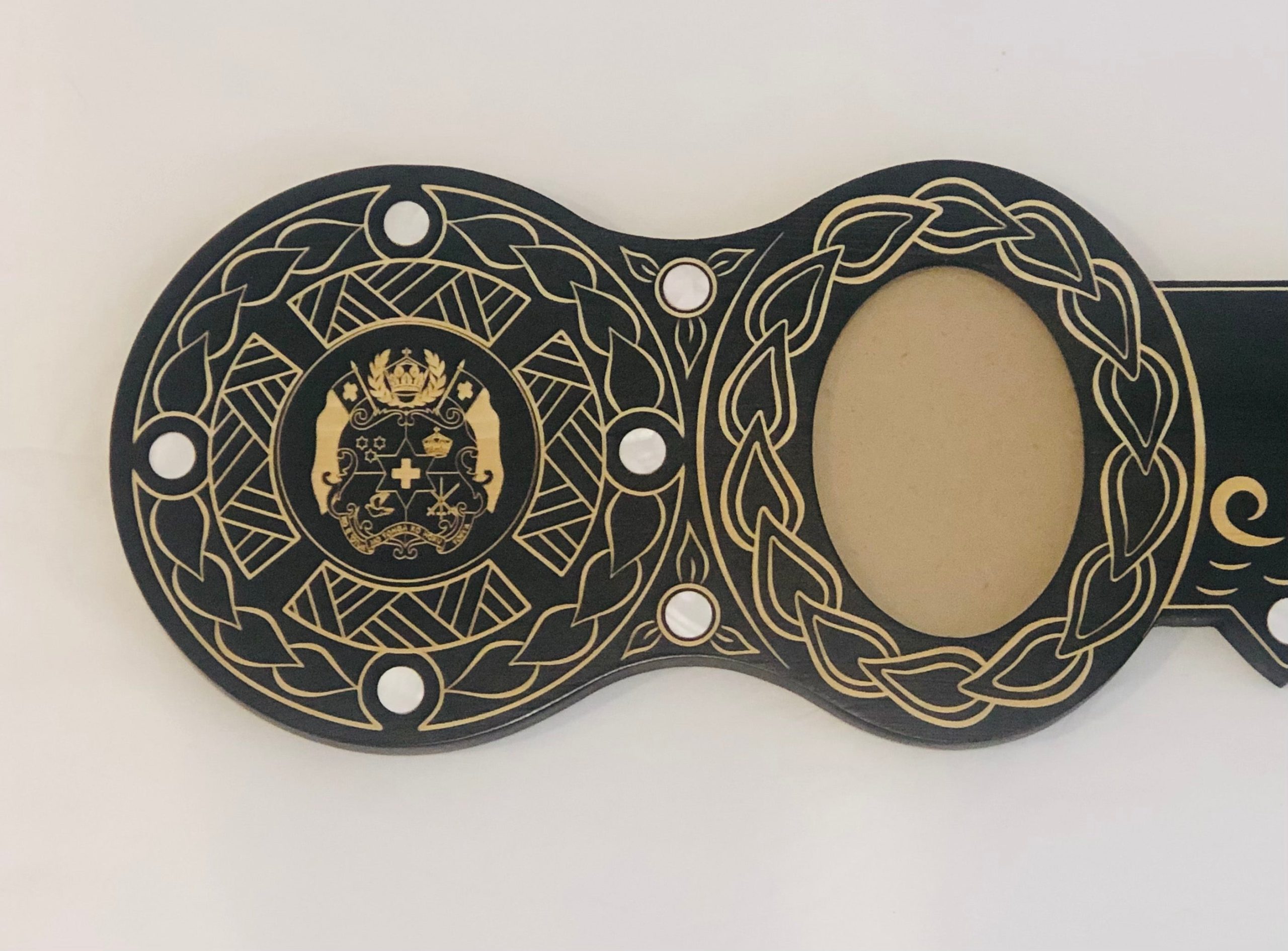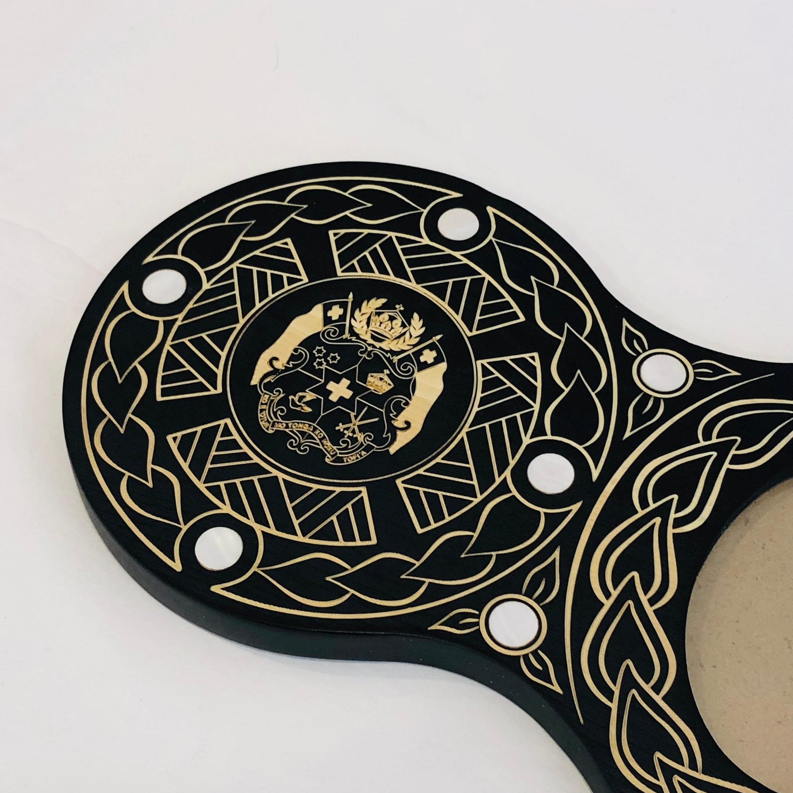 This birthday?key is made out of solid timber with fully laser Engraved?island patterns around the whole key and Coat of arms of Tonga in the middle of the circle on the far left side.