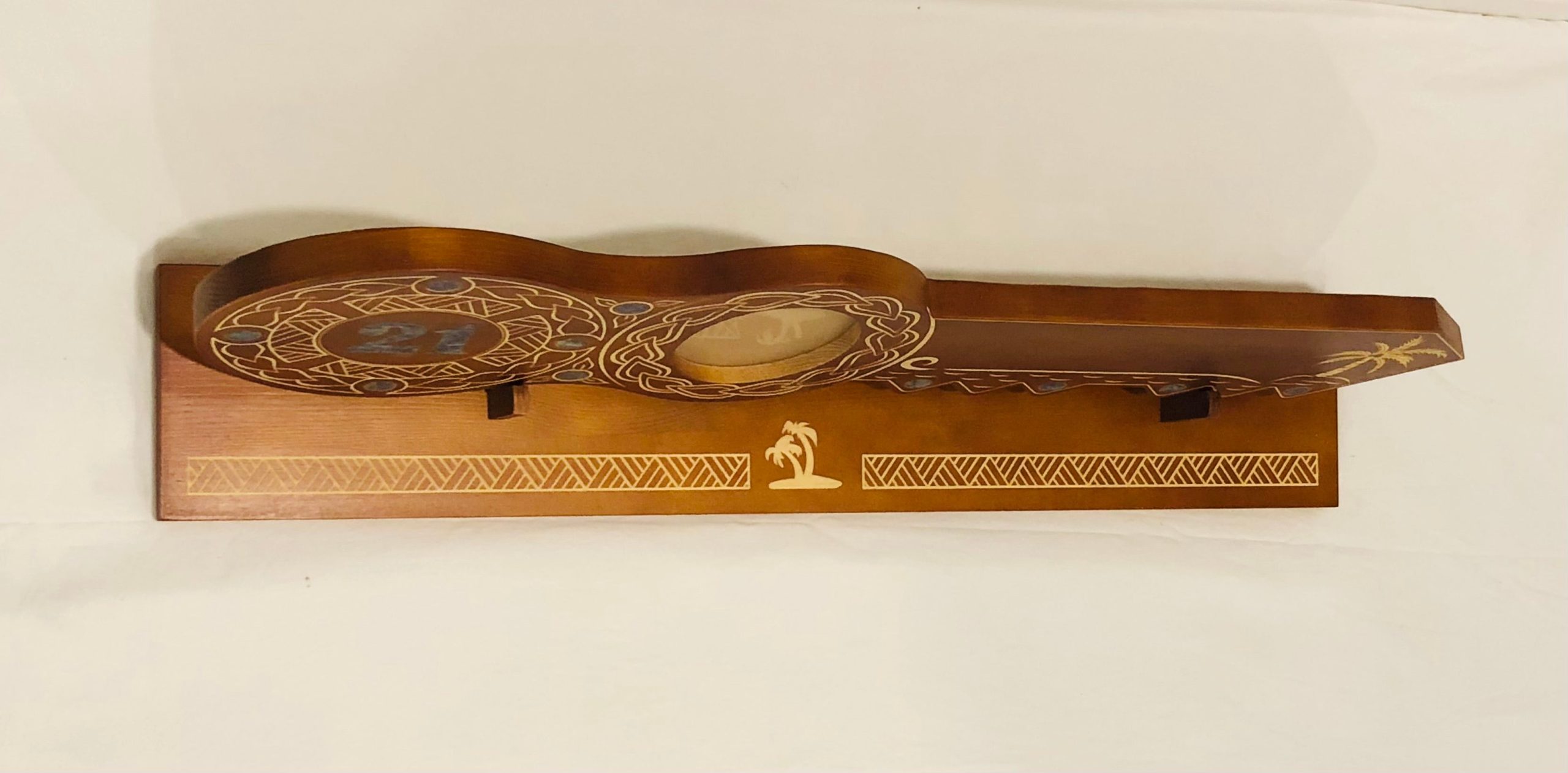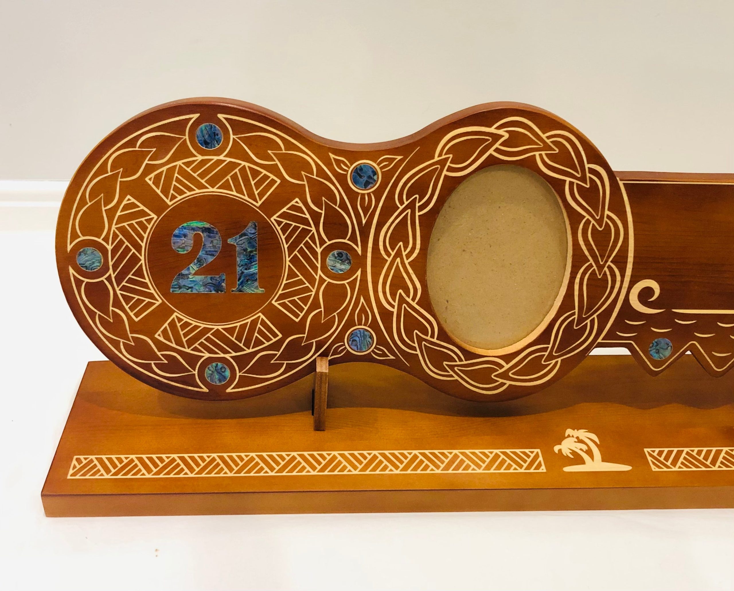21st Island Design Key with Laser Engraved Patterns & “21” Paua Shell Inlay with Round Paua Shell Inlays and Matching Stand – Design 2125 (Stand)