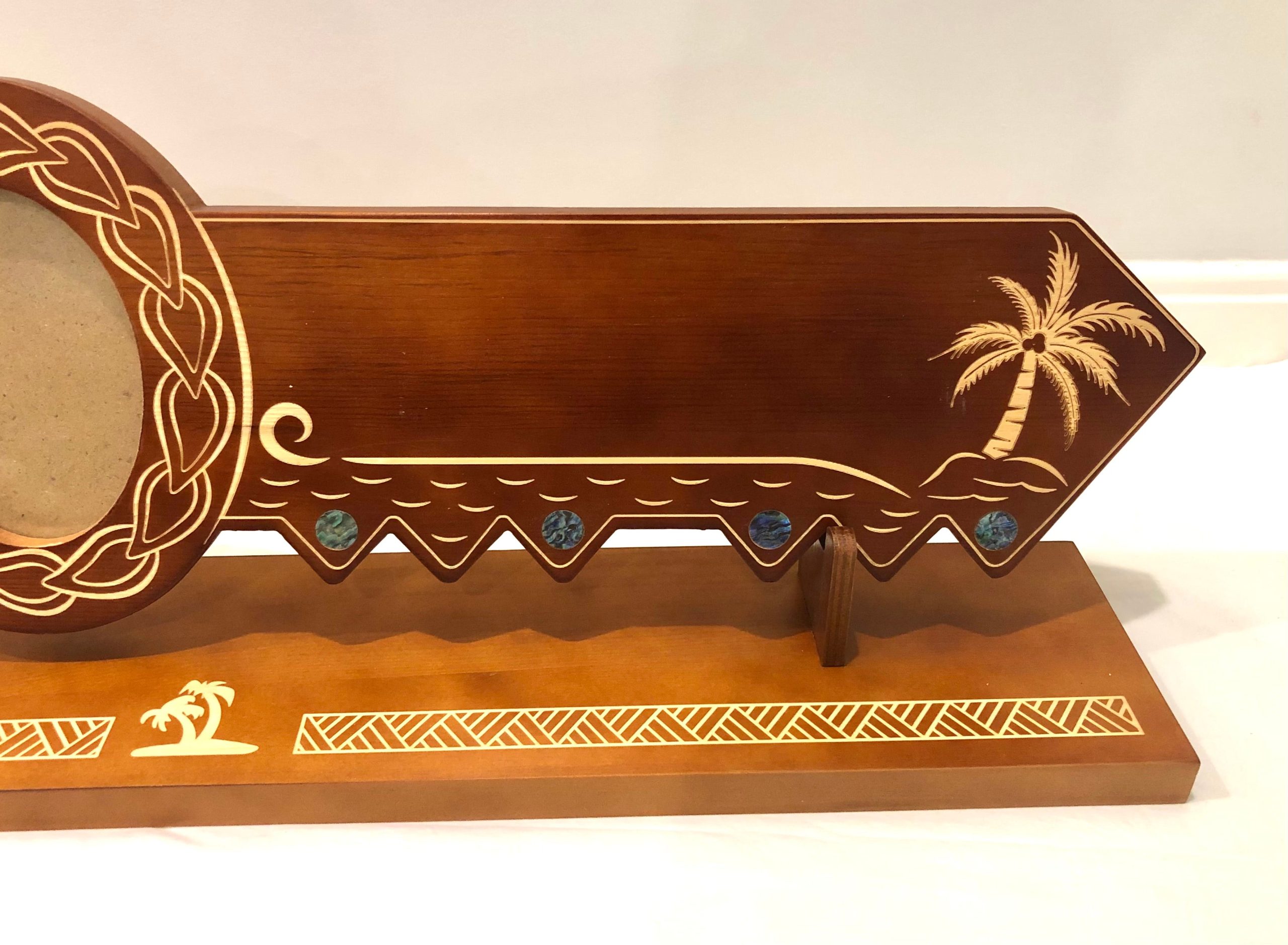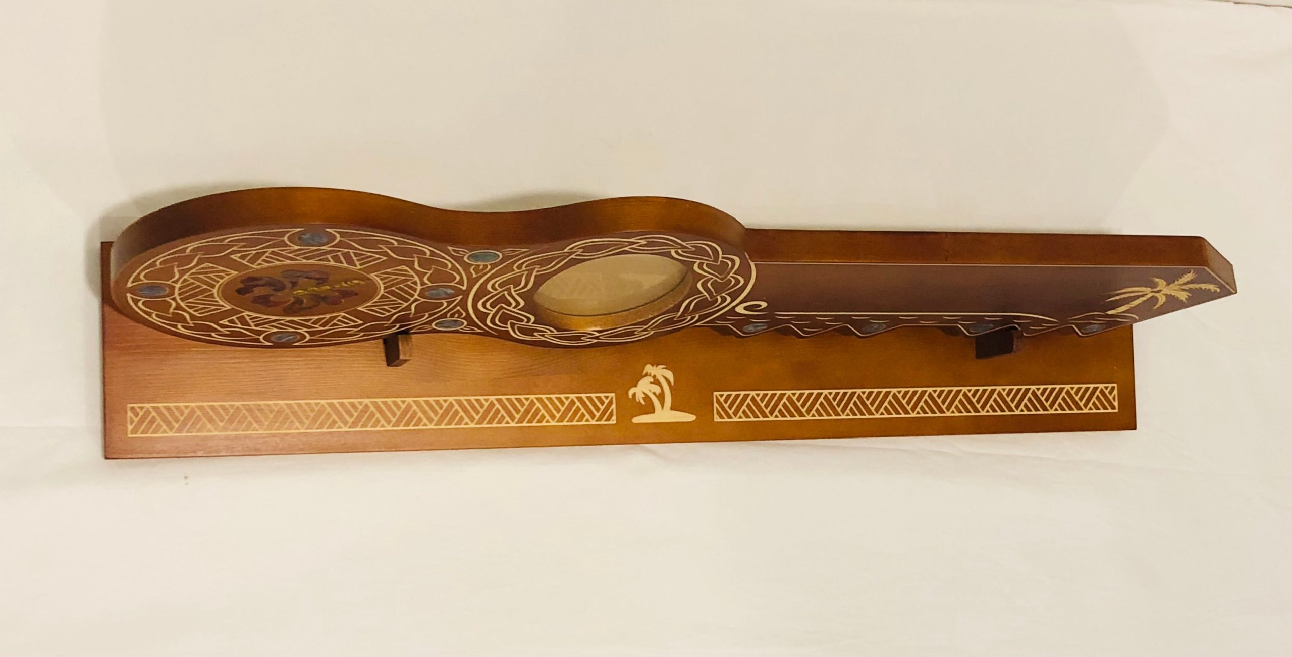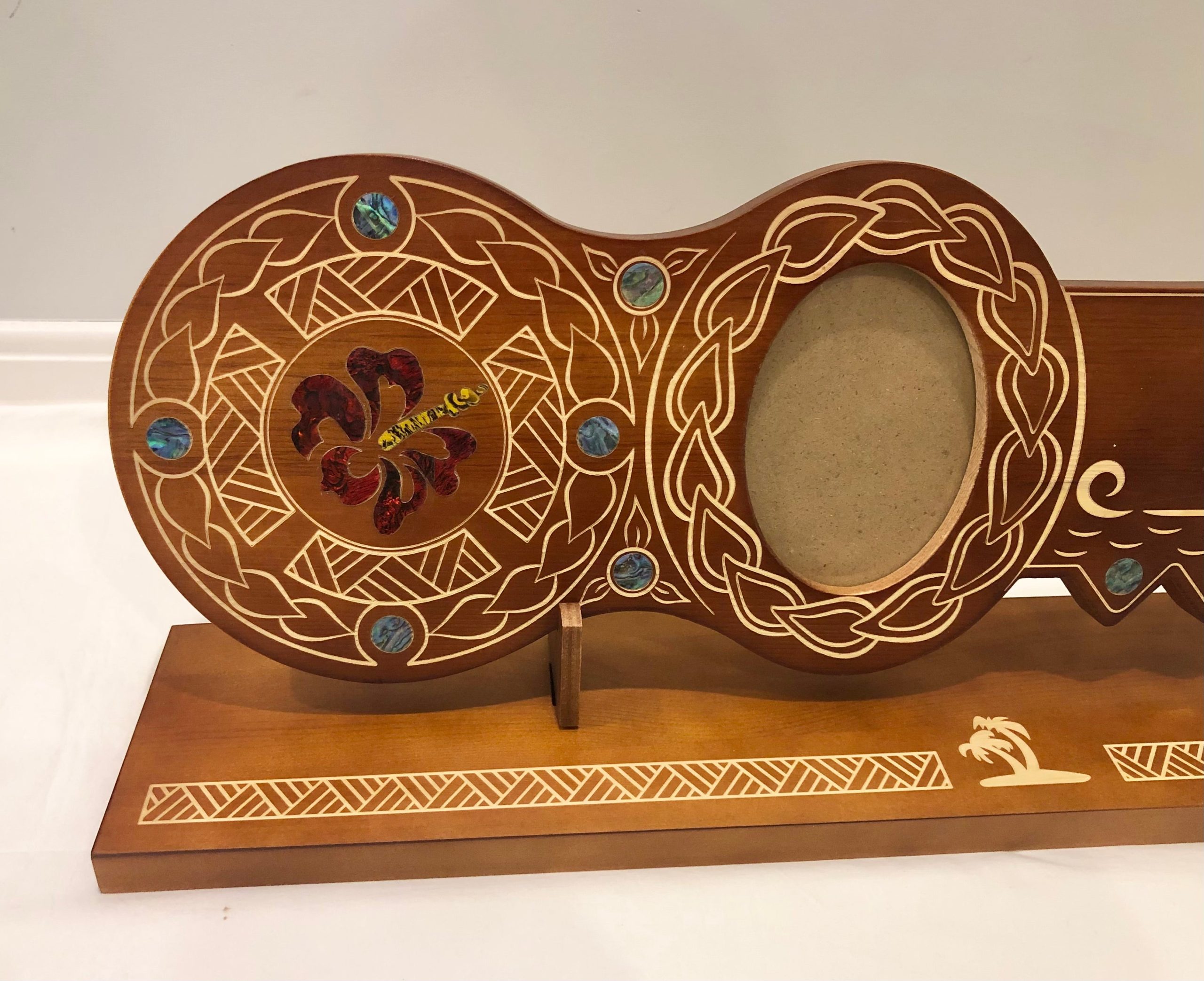21st Island Design Key with Laser Engraved Patterns & Coloured Paua Shell Hibiscus Flower Inlay with Round Paua Shell Disk Inlays and Matching Stand – Design 2126 (Stand)