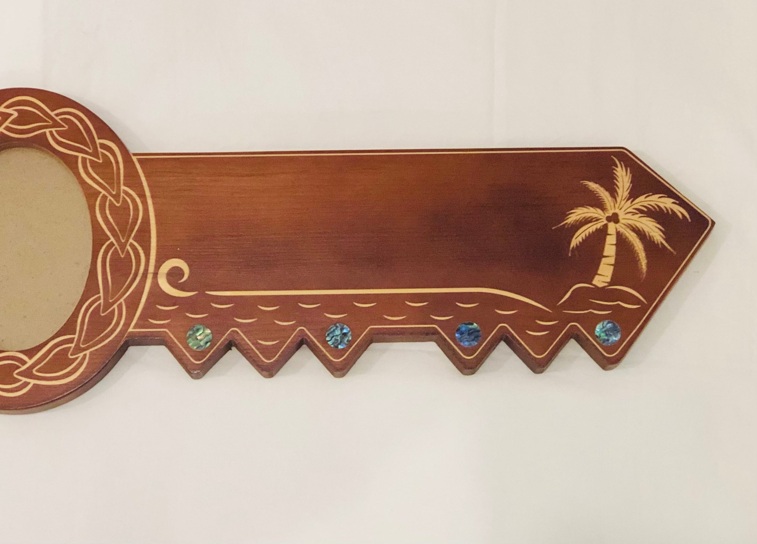 The key has got?coloured paua shell hibiscus flower?inlay in the middle of the circle on the far left with 10x 15mm round?Paua shell disk inlay around the key. There is also a palm tree laser? engraved on the right handside of the key