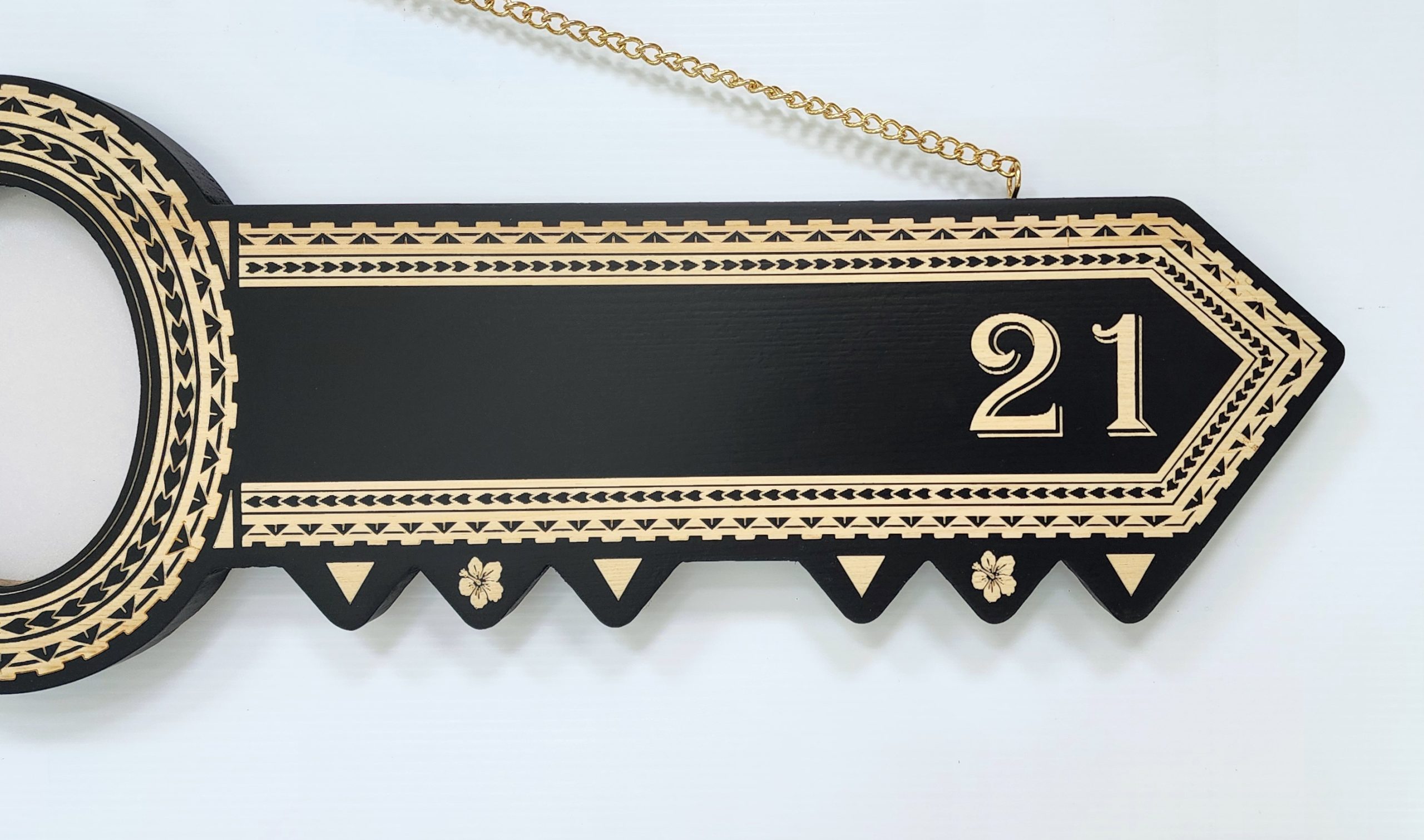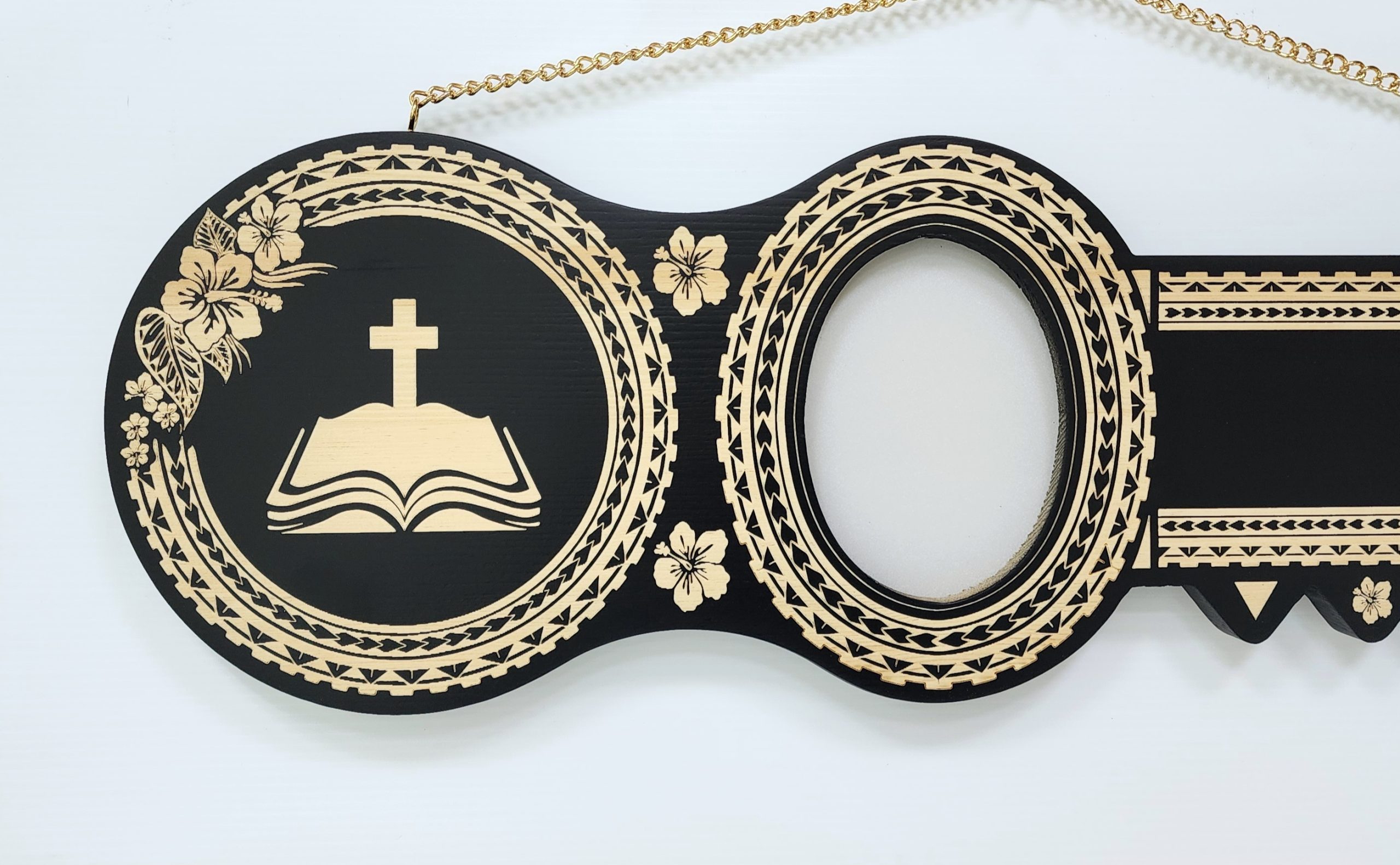 This 21st birthday key is expertly crafted from solid timber and adorned with detailed laser-engraved island-inspired patterns across its entire surface. On the far left, a beautifully engraved Bible with a cross adds a meaningful touch, while the number “21” stands out prominently on the right. The key features an oval-shaped cutout, sized at 90mm x 125mm, designed to display a photo of the birthday celebrant. It also offers a spacious 60mm x 220mm area, perfect for adding a custom engraved message or name