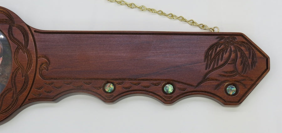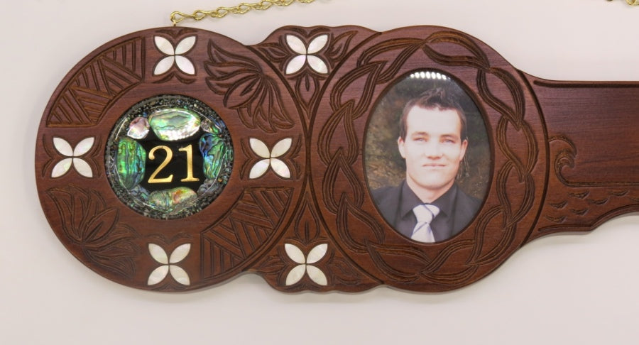 Wooden Carved 21st key island design with 21st Paua disc insert and 3 paua eyes at the bottom of the shaft.