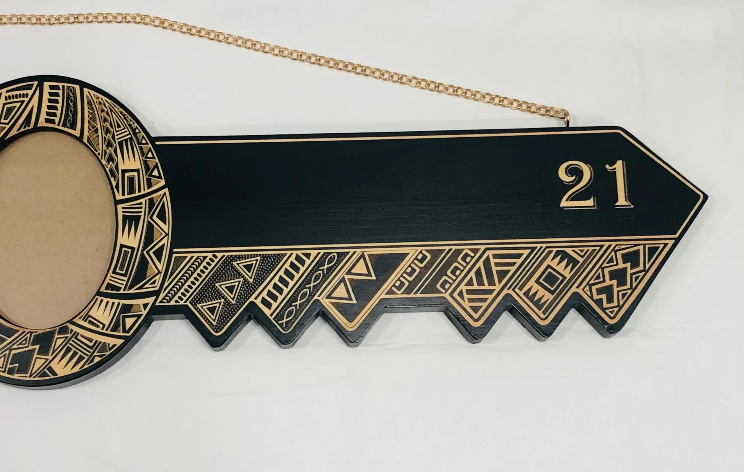 The 21st key is made out of solid timber with fully laser Engraved island tattoo patterns around the whole key.