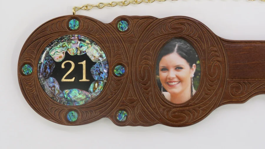 Wooden Carved 21st key Maori design with 21 Paua disc insert and 9 paua eyes insert around the key.