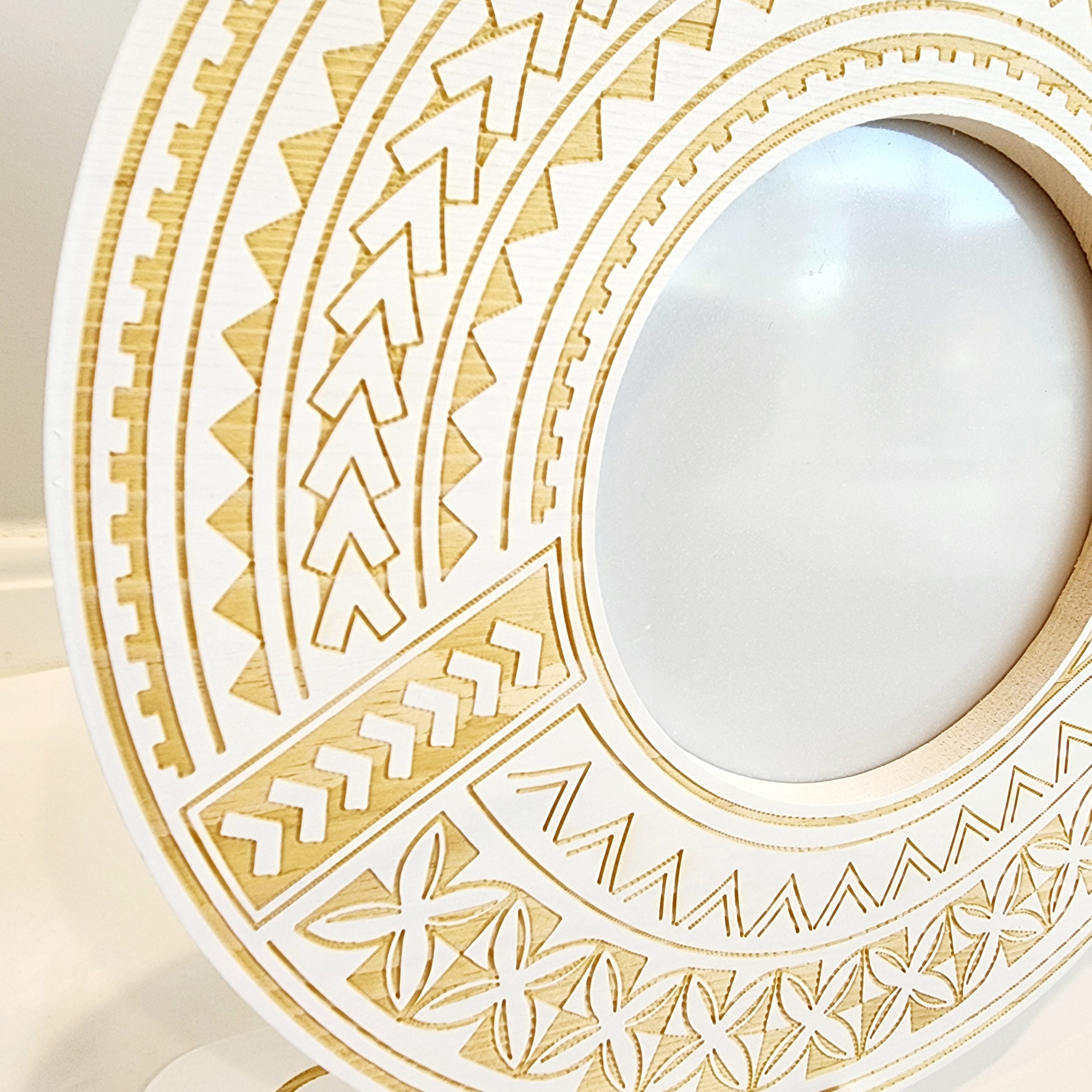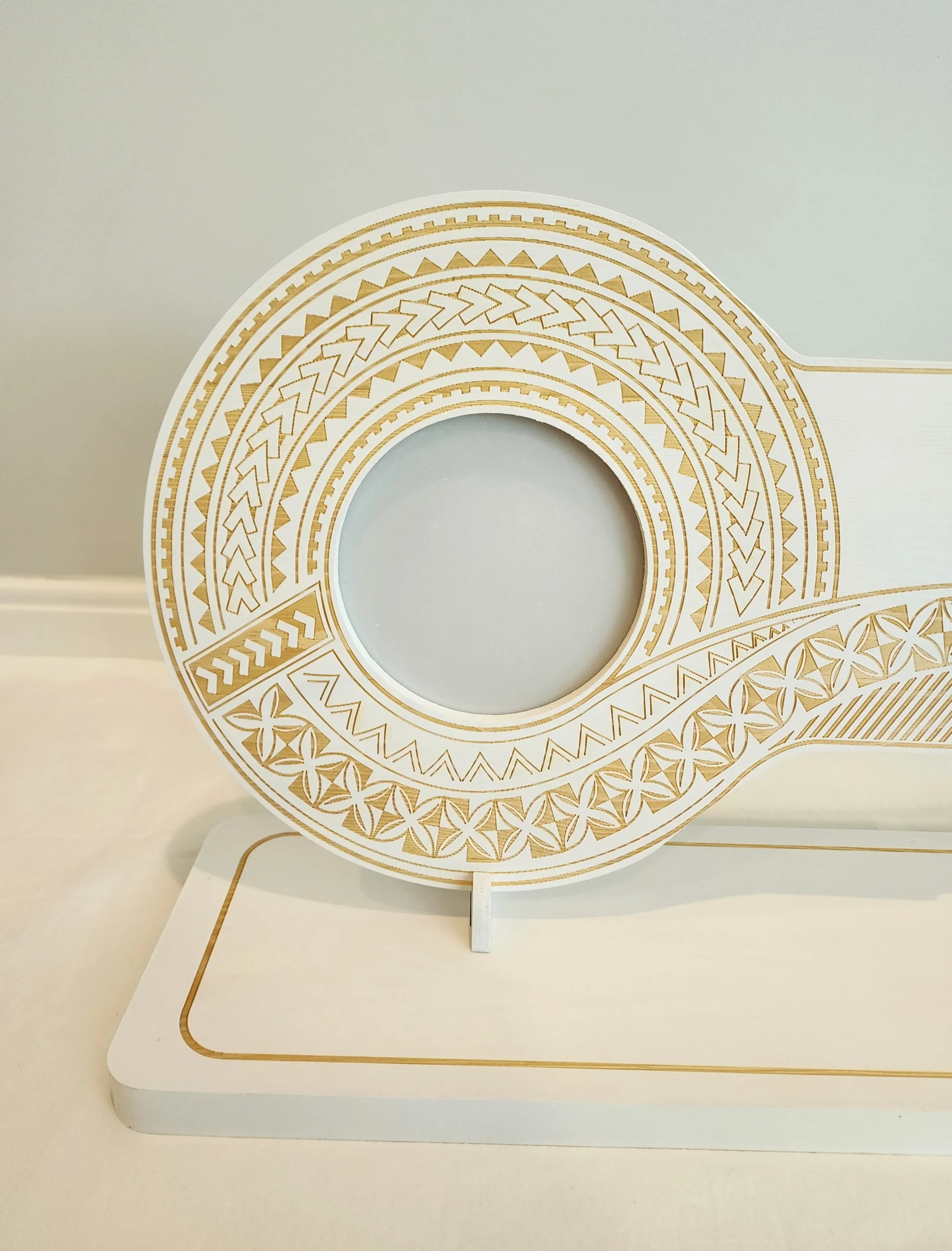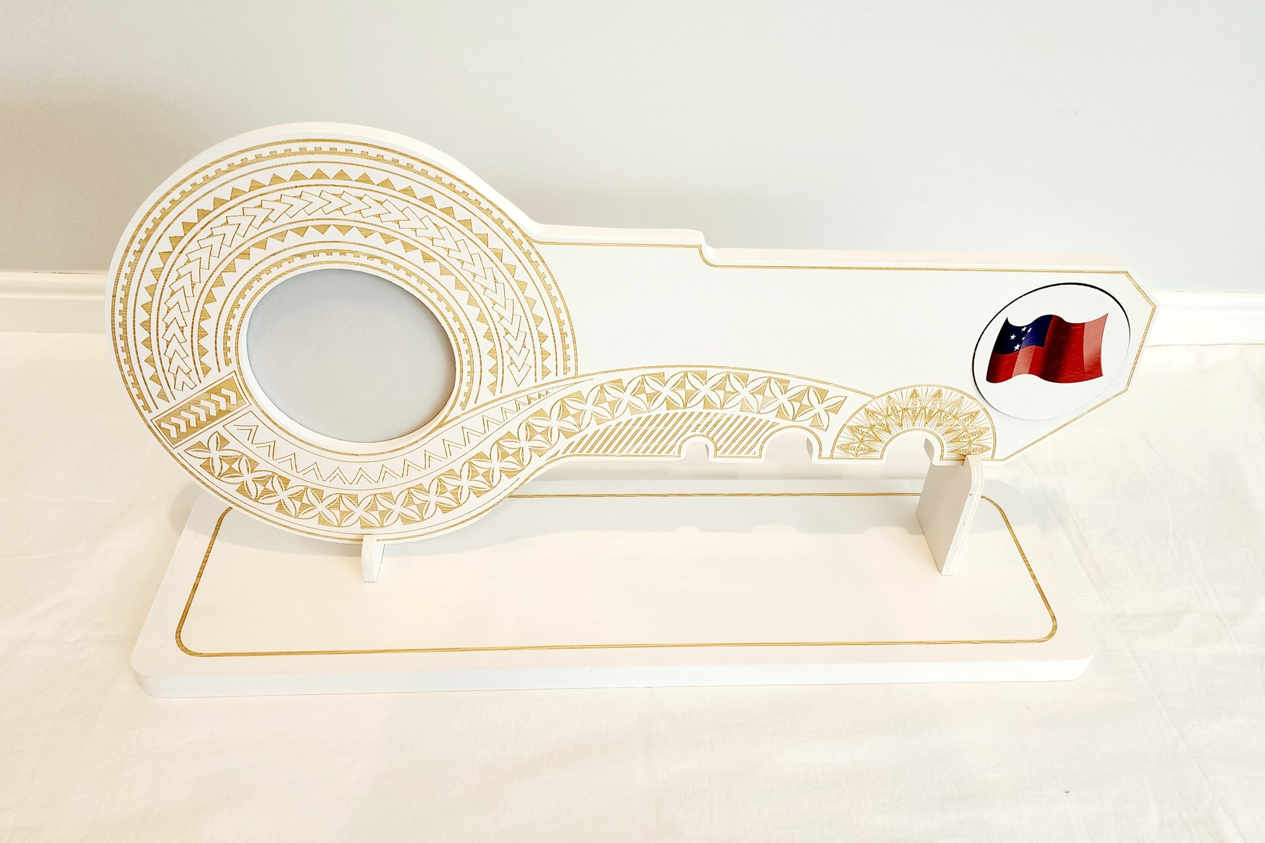 21st White Colour Painted Key with Laser Engraved Island Patterns On The Key and Printed Samoan Flag Disk Insert and Matching Laser Engraved Stand