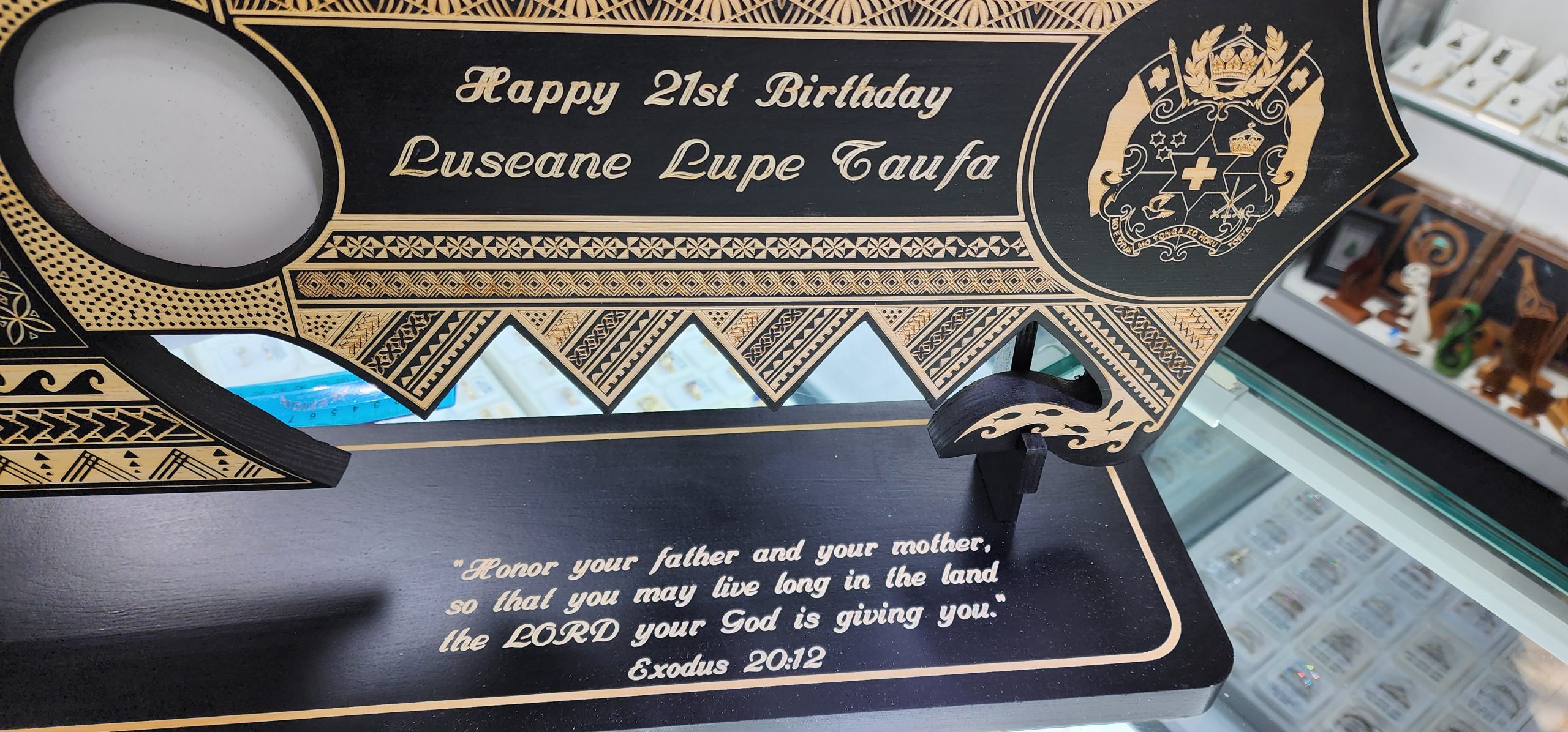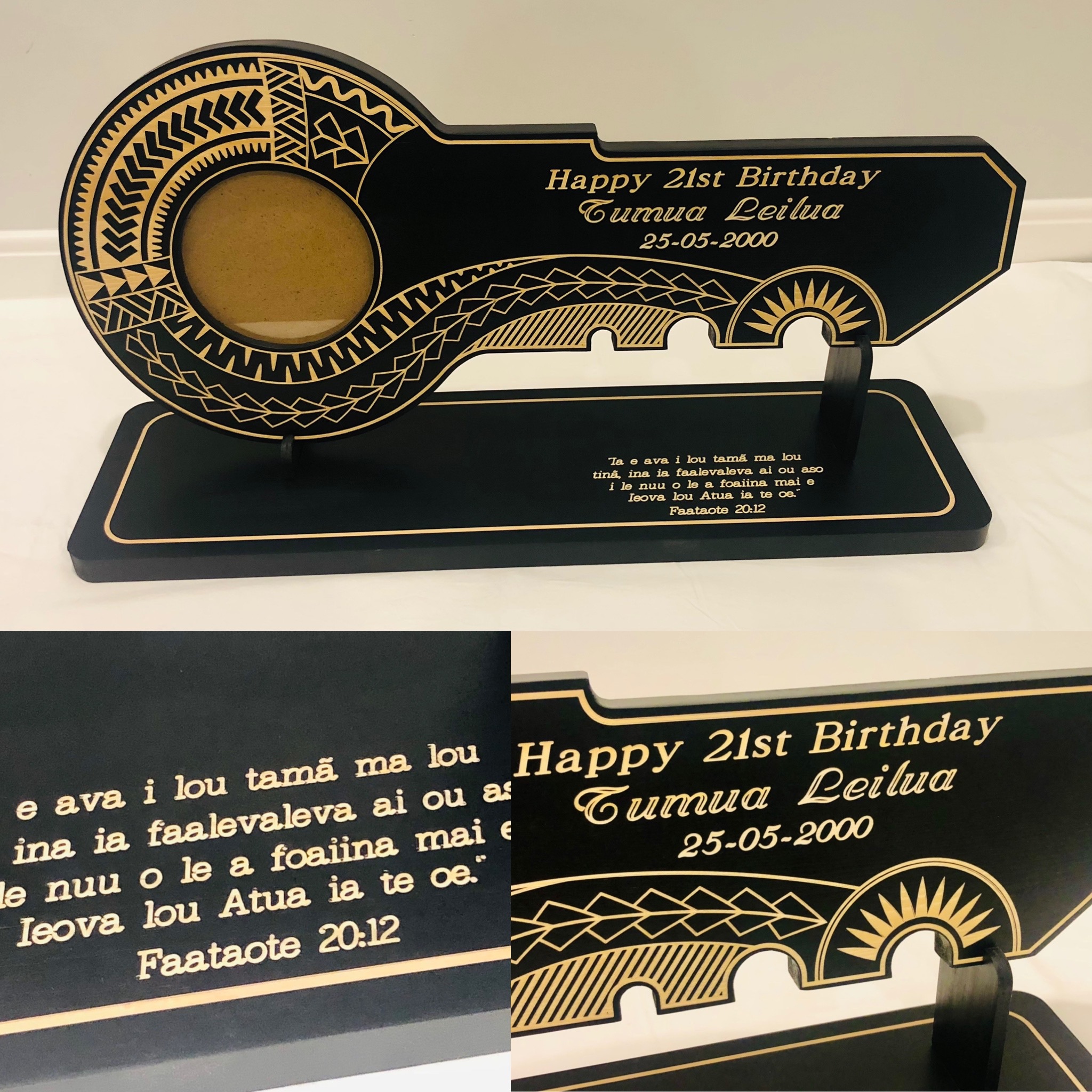 The is key made out of 20mm thick solid wood with island design laser carving around the key with round cutout space for a picture placement in the middle of the key. There is a polynesian tattoo design hui turtle triple twist laser engraved on the top side of number “2”. The?black colour?shade may vary due to the natural wood variations.