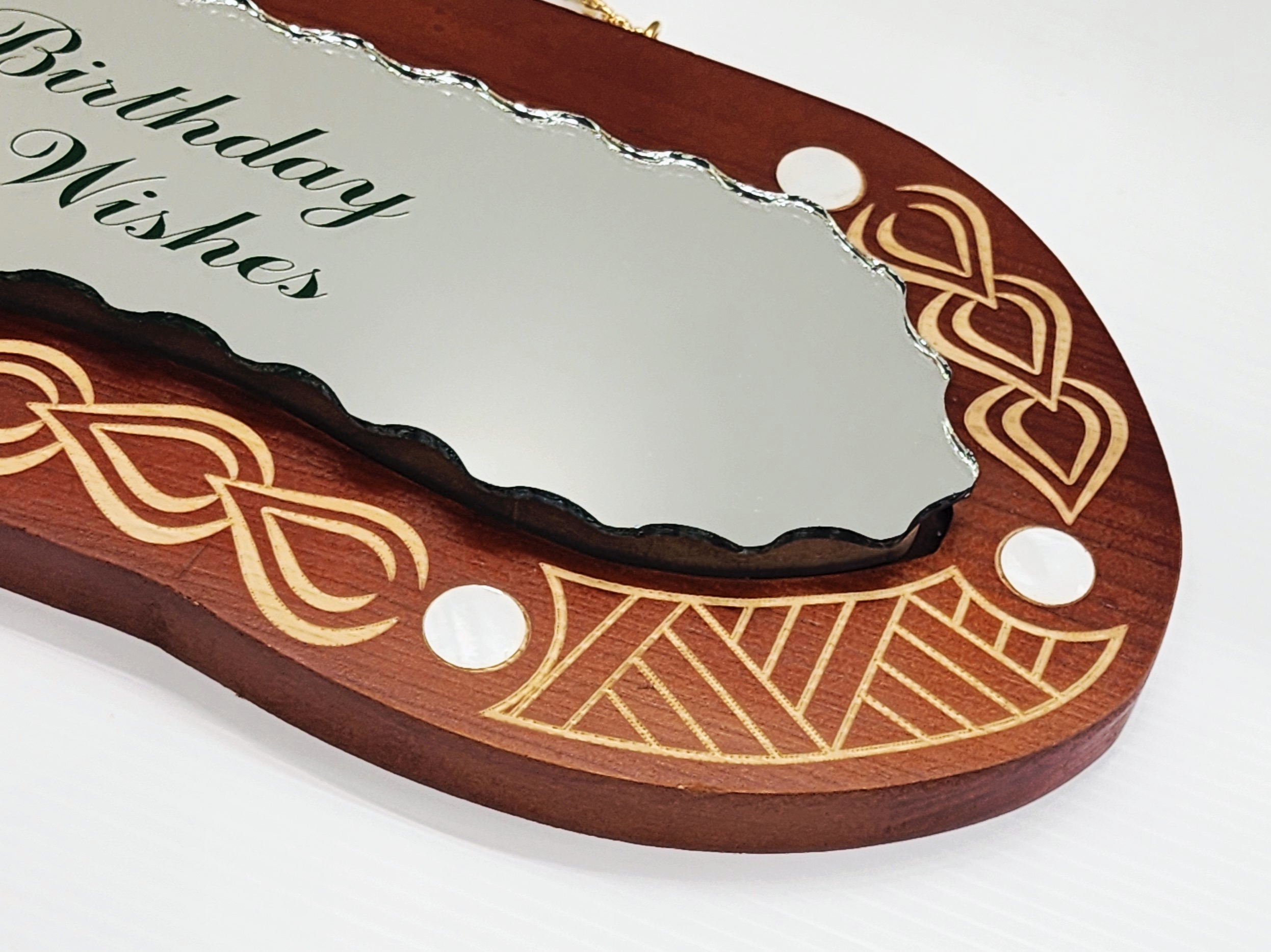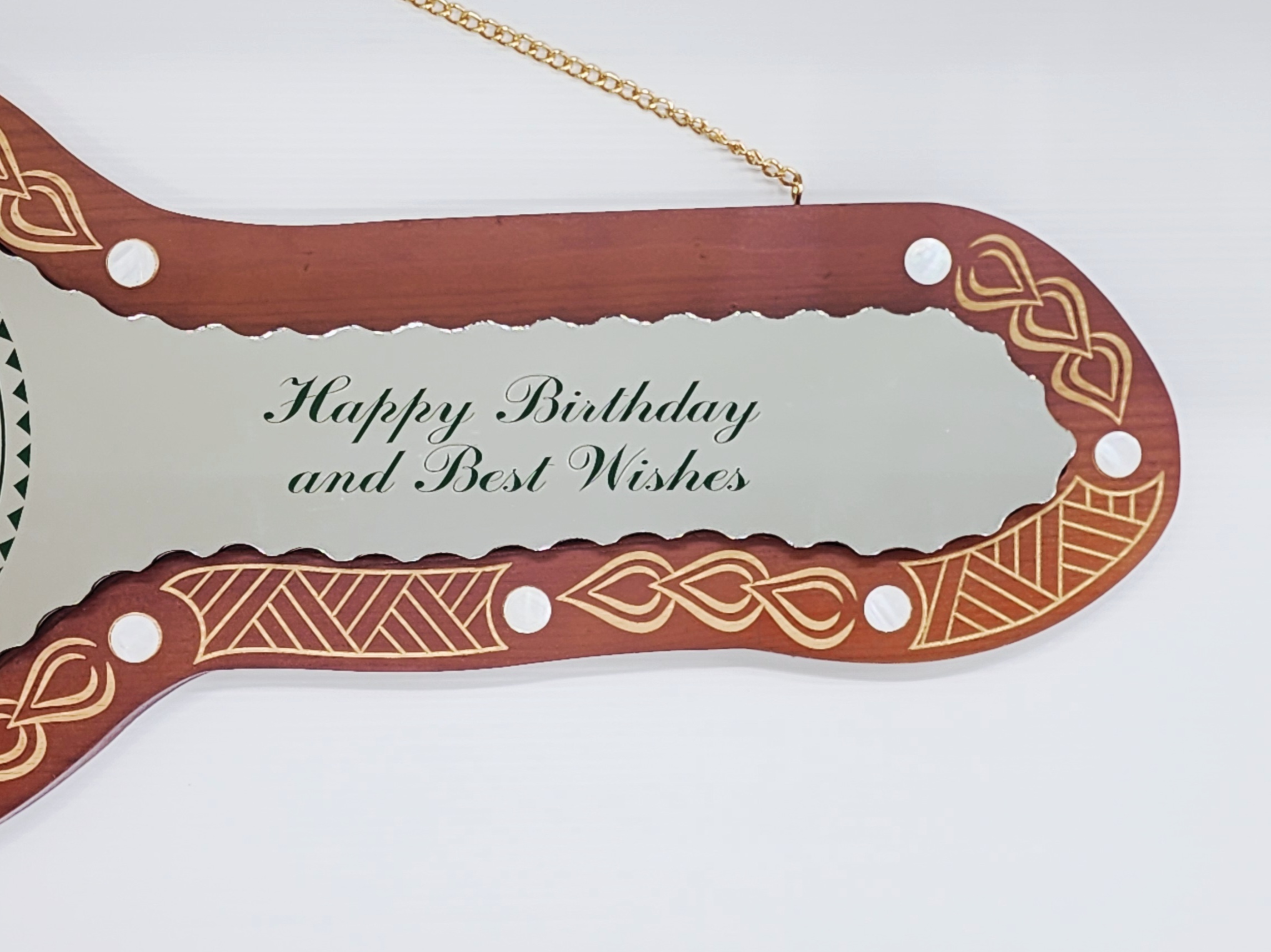 Above the mirror section is a space reserved for a customizable gold plaque, perfect for engraving a heartfelt message and the recipient’s name. The key also includes a gold-finish chain for hanging display, making it both a memorable keepsake and a striking decorative piece.