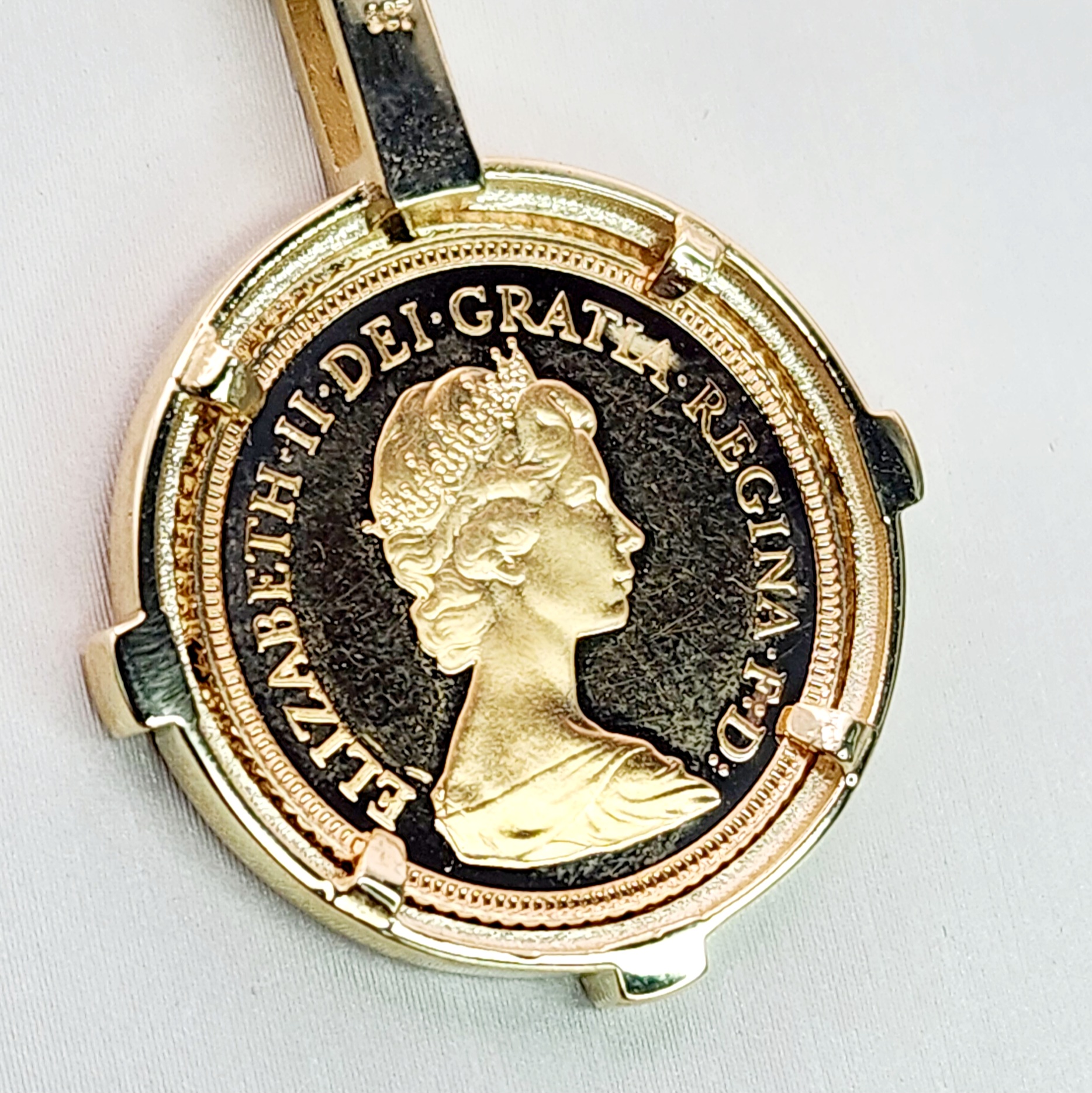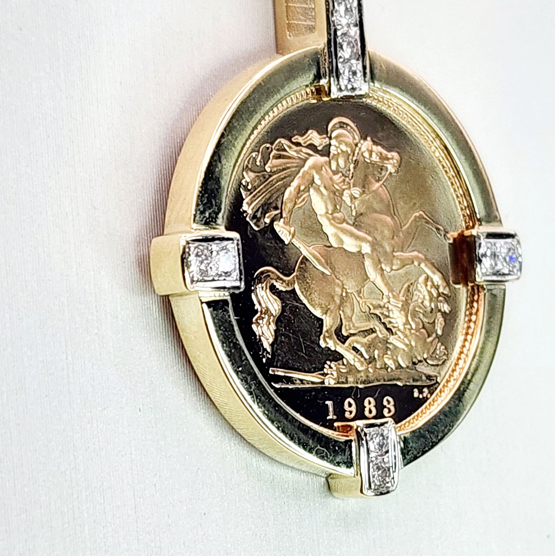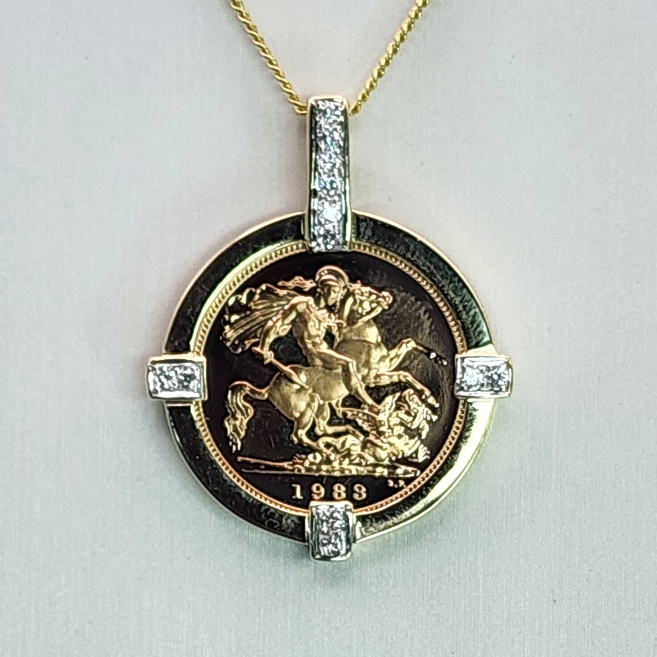 This pendant is made in 9ct yellow gold mount with 0.17ct diamond setting with 22ct yellow gold 1983 Half Sovereign Coin. Total pendant weight 7.02 grams