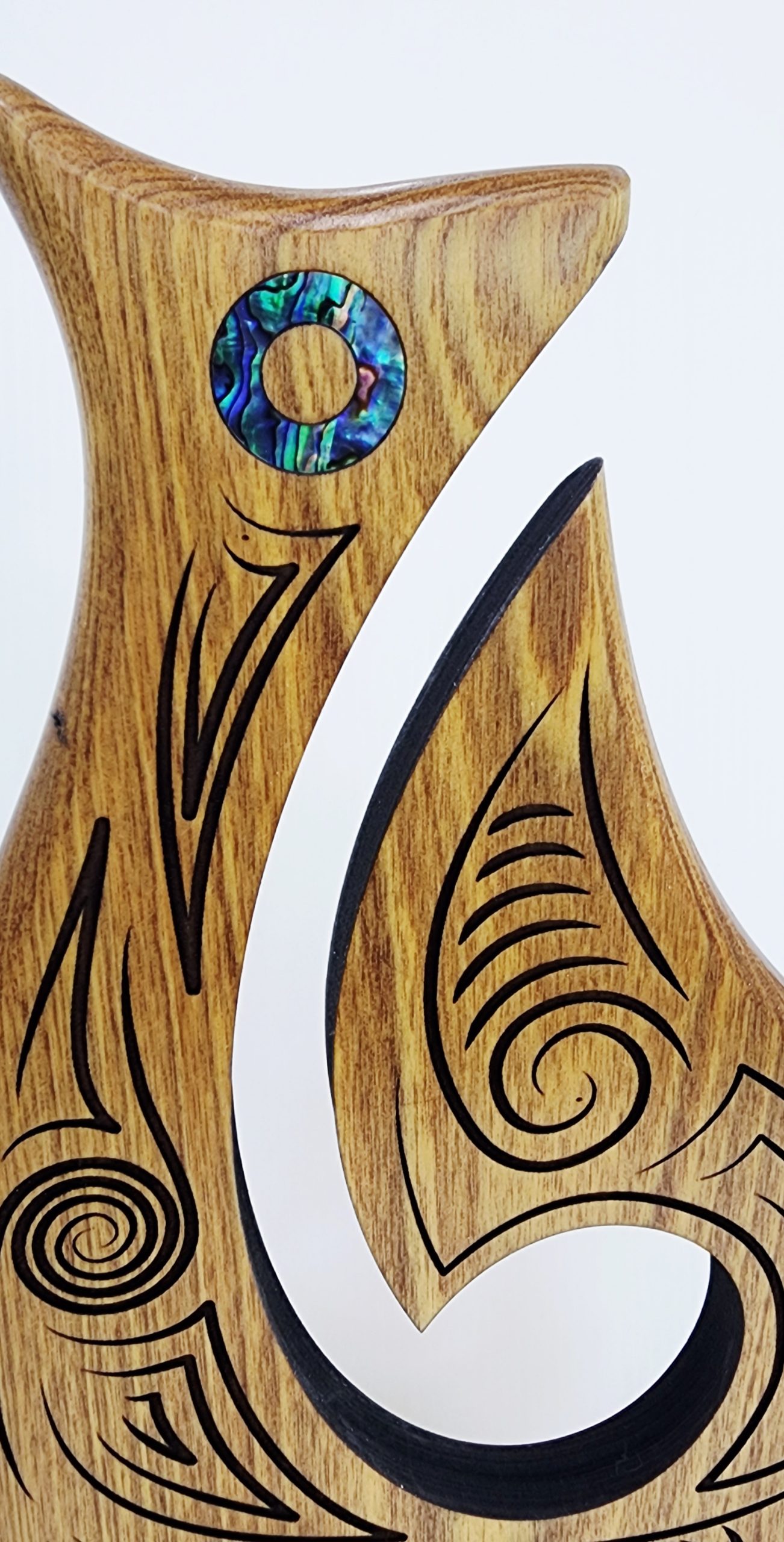 Intricately detailed with surface carvings, this fish hook sculpture is further enhanced by the shimmering inlay of genuine New Zealand pāua shell, adding colour, depth, and a distinctive Kiwi touch.