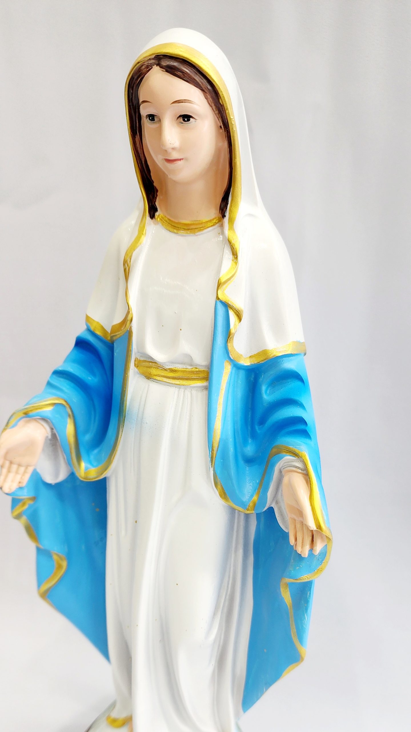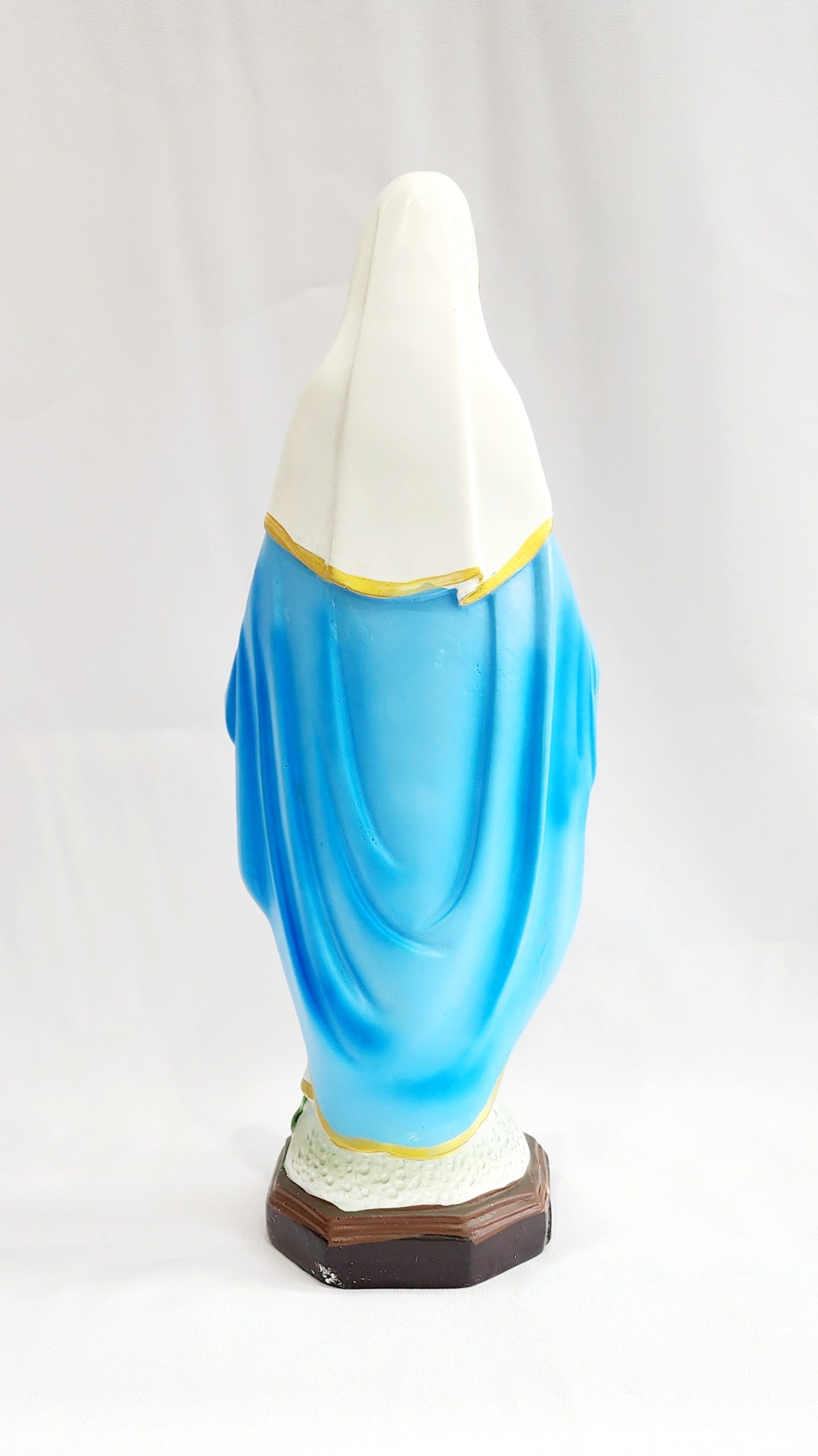 In this classic-style statue, the graceful Virgin Mary stands upon the earth, triumphantly crushing a snake under her foot. Adorned in a white veil, a flowing dress, and a light blue cloak, she exudes beauty, humility, and boundless joy. Hand-painted with meticulous care, her traditional garments emanate a sense of peace and hope. Welcome the Blessed Virgin into your hearts and homes, as her presence brings forth a delightful addition to any space.
