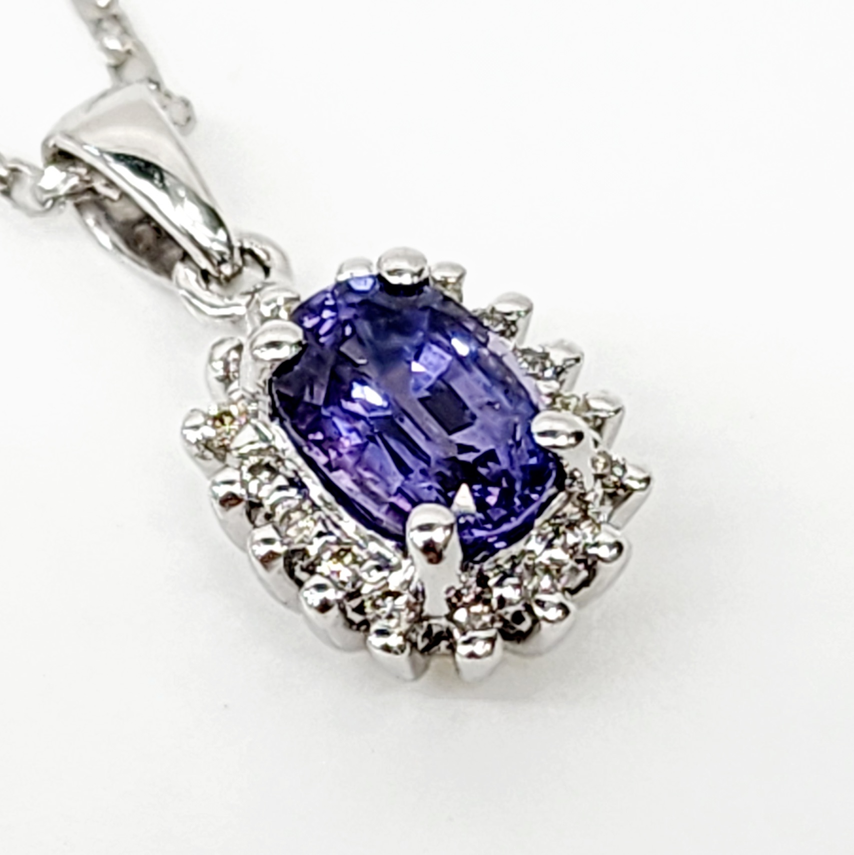 A beautiful, ceylon sapphire gemstone, set in a halo on 0.10ct diamonds. Cast on a 9k white gold. The natural oval sapphire has a carat weight 1.06ct.