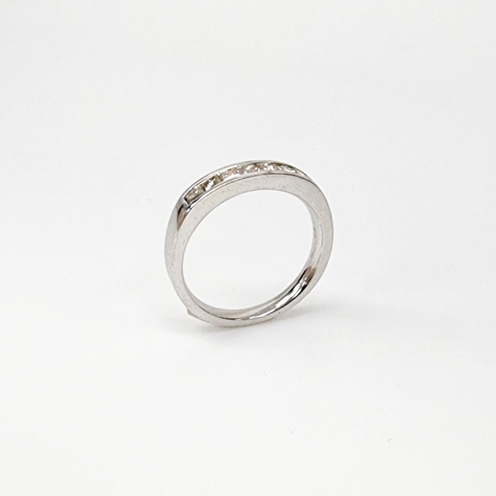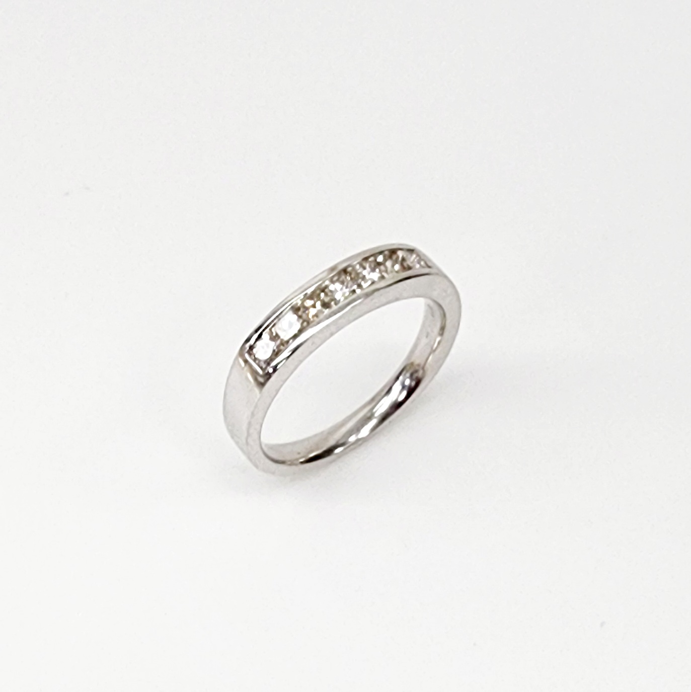 This elegant wedding ring is crafted from 9ct white gold and features a total of 7 meticulously set princess-cut diamonds, with a combined weight of 0.50 carats. The diamonds are set in a unique rubover setting, where the metal gently encircles and secures each stone, creating a sleek and contemporary appearance. The design highlights the geometric beauty of the princess-cut diamonds, offering a sophisticated and timeless look for your special day.