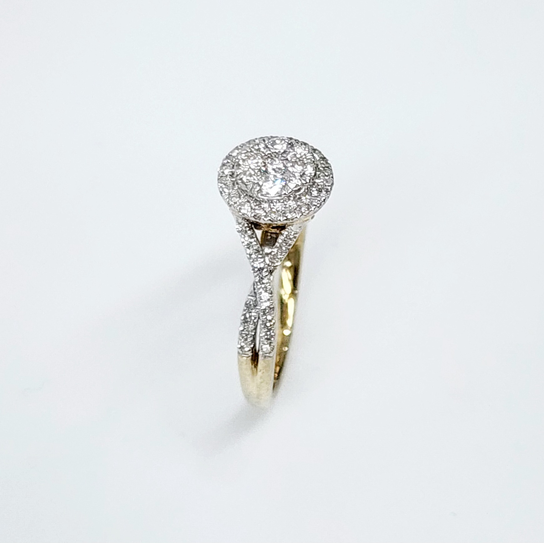 - Halo Setting: The centerpiece of the ring is a round cluster of diamonds, where smaller diamonds encircle a central stone, creating a halo effect. This design amplifies the brilliance of the central diamond, giving the illusion of a larger stone and adding extra shimmer.