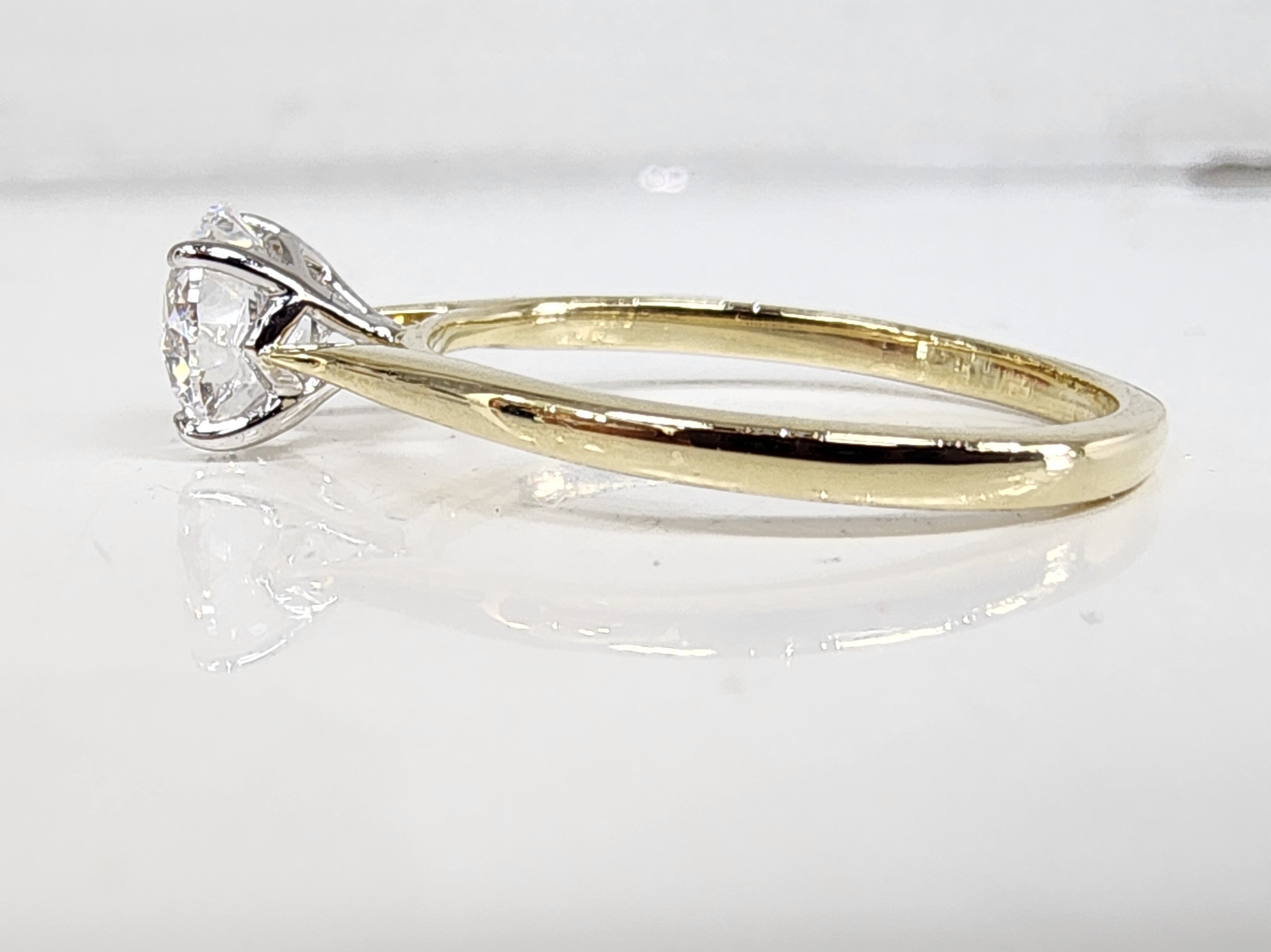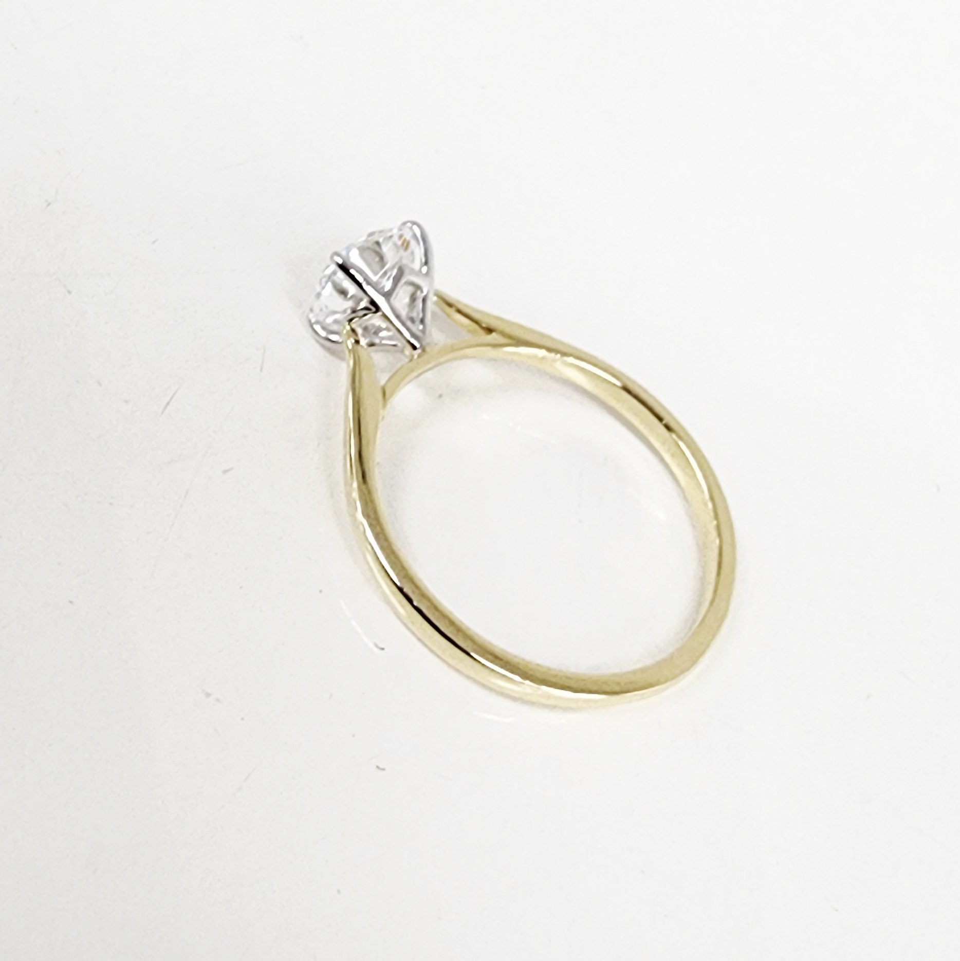 This elegant 9ct yellow gold solitaire engagement ring showcases a brilliant 1.0435ct lab-grown diamond of EF colour and VS clarity. The stunning round-cut diamond is securely held in a classic four-claw white gold setting, designed to maximise brilliance and sparkle from every angle.