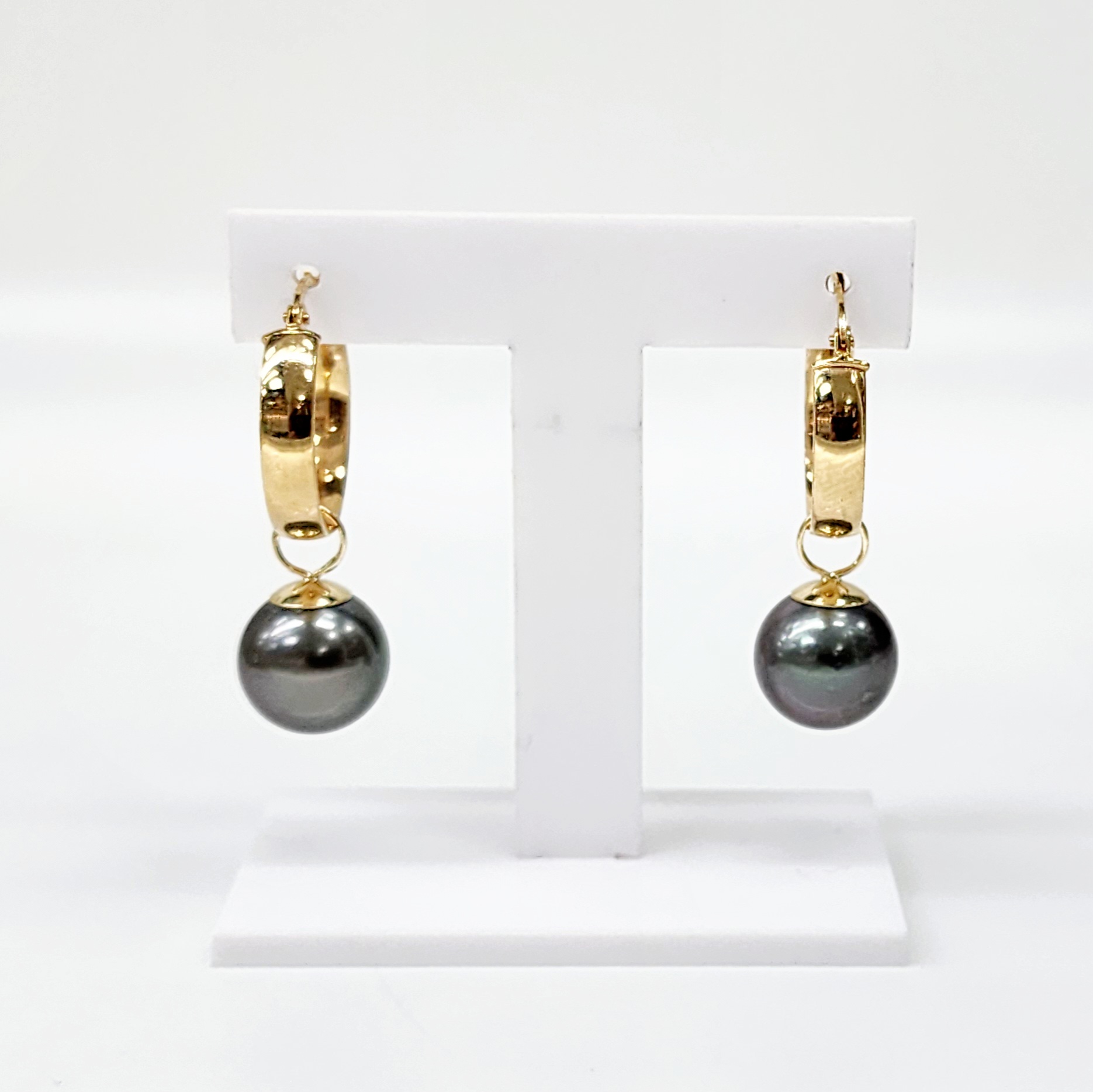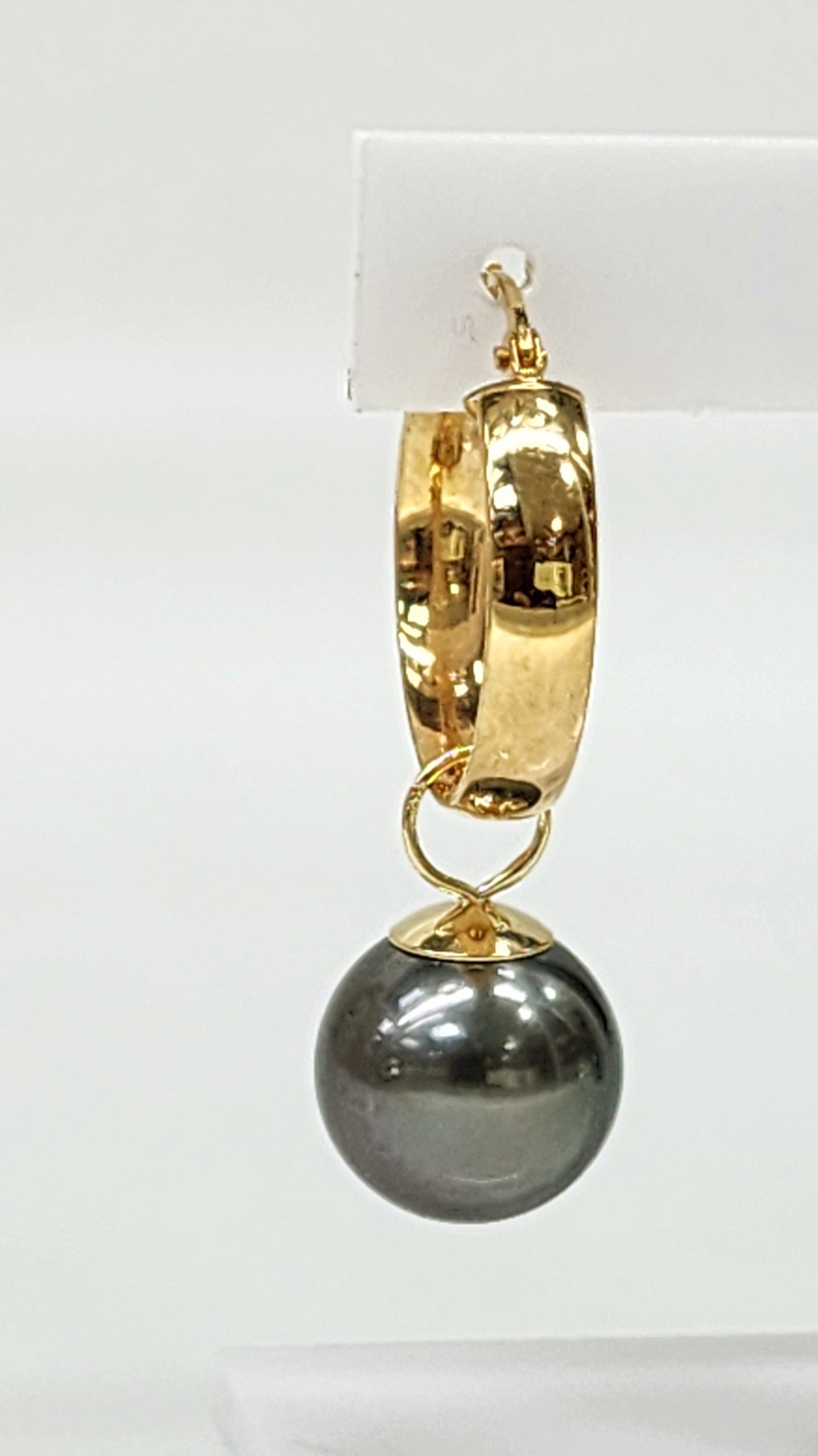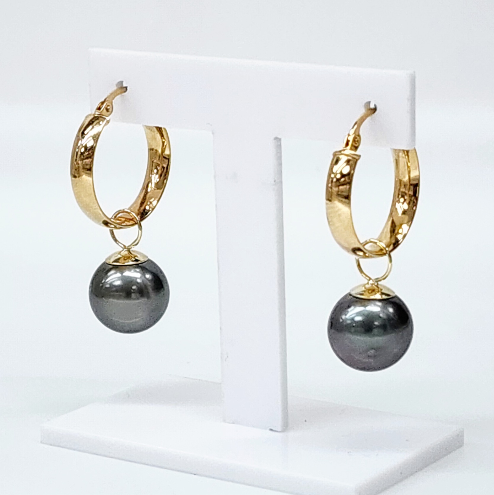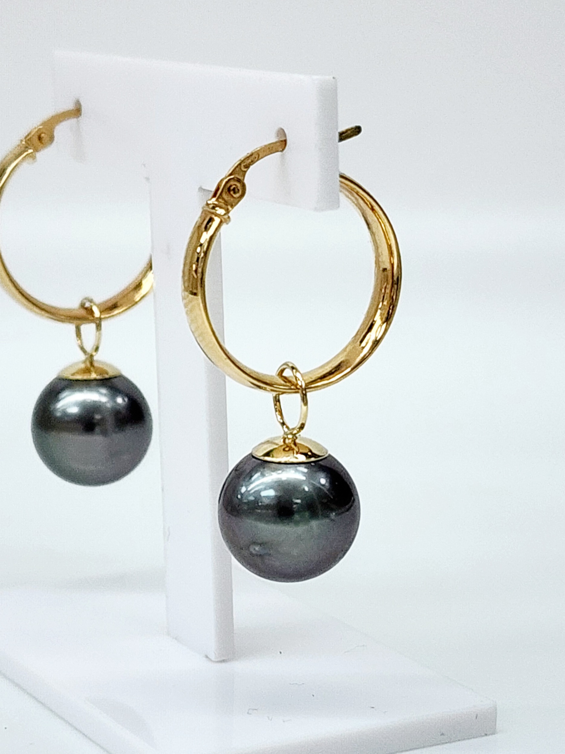 9ct Yellow Gold 11-12mm Round Tahitian Black Pearl Hoop Earrings