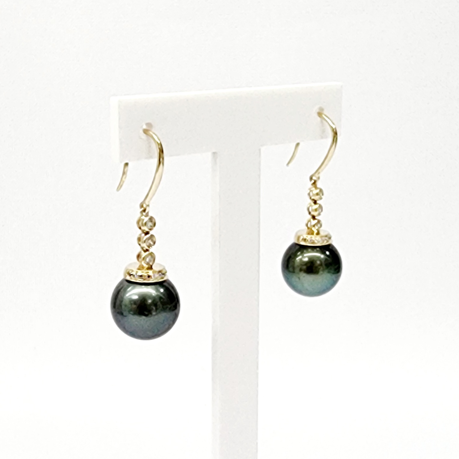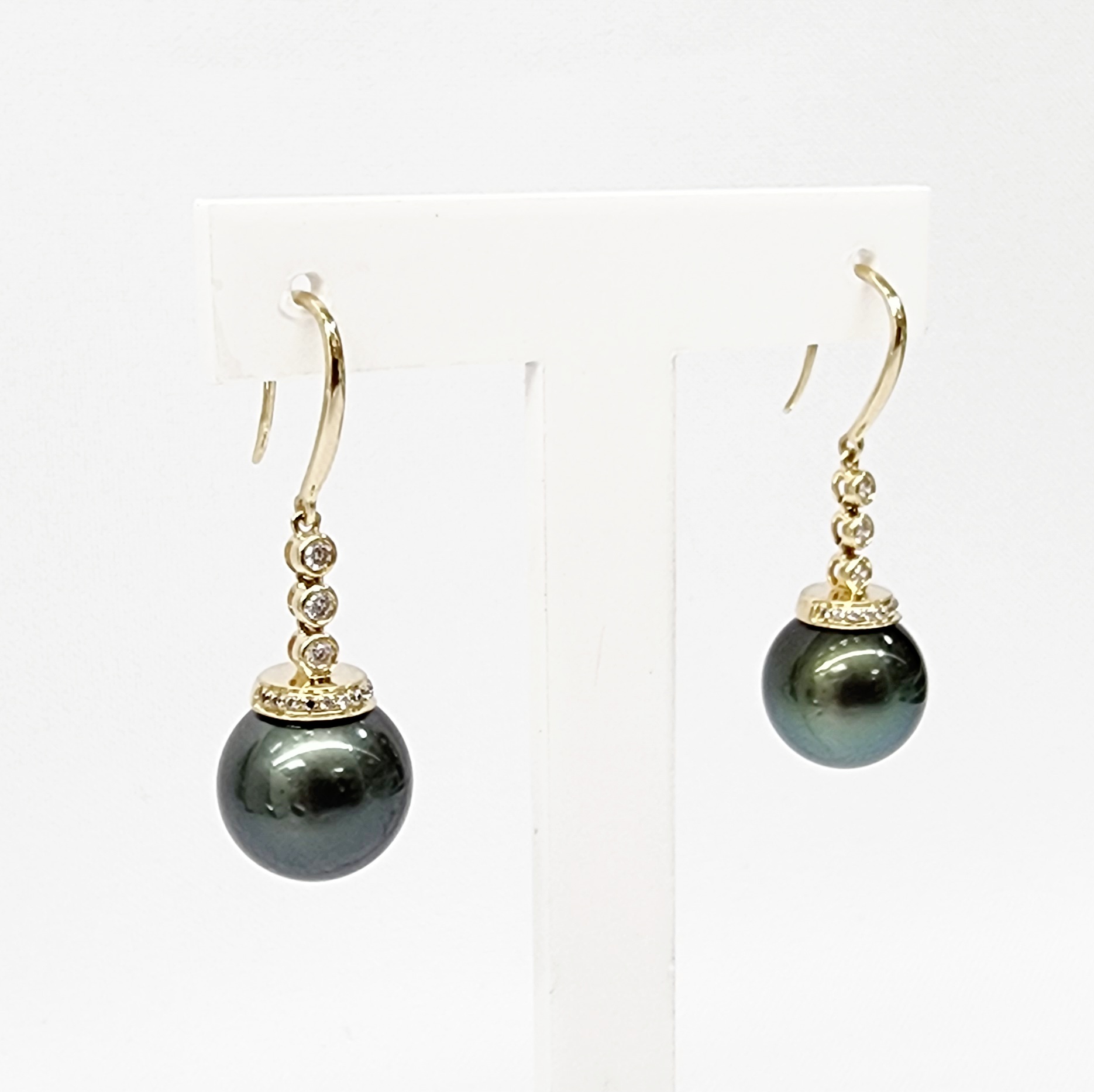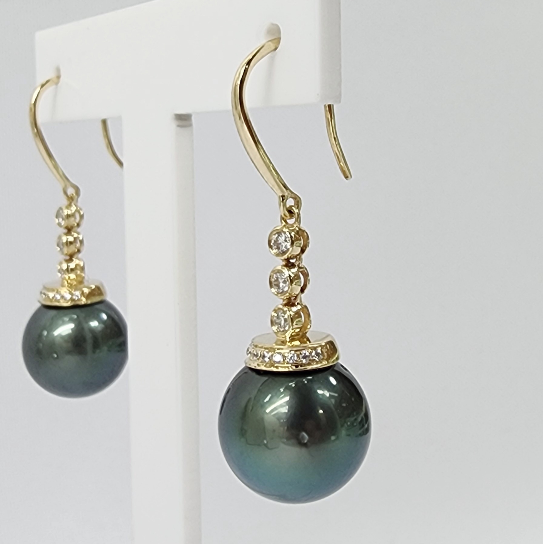 These elegant drop earrings feature a stunning pair of 11mm round Tahitian black pearls, admired for their rich peacock overtones and exceptionally high lustre. The pearls display a deep, captivating colour that shimmers with green, purple, and blue hues under the light, making them a true statement of luxury.