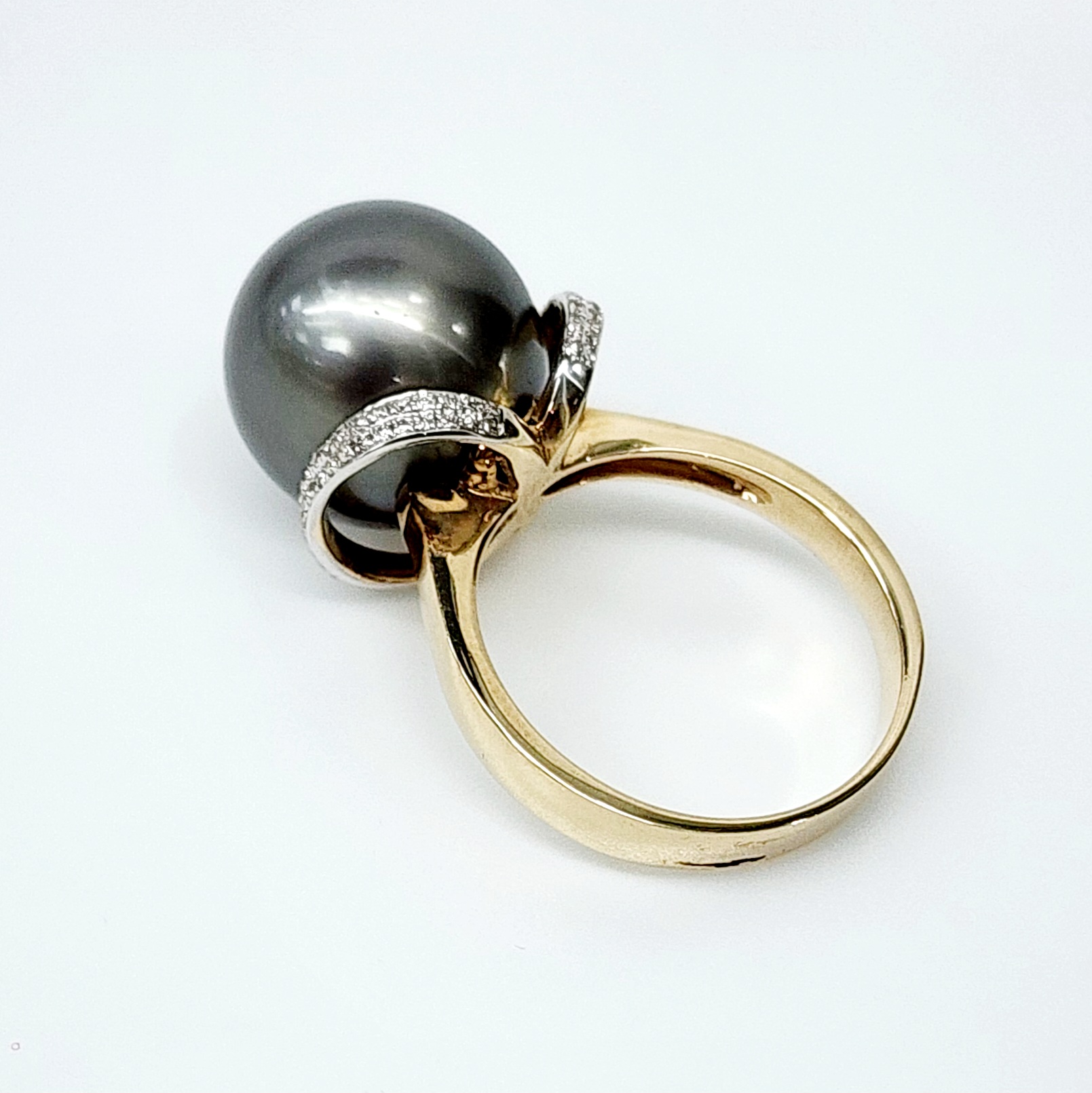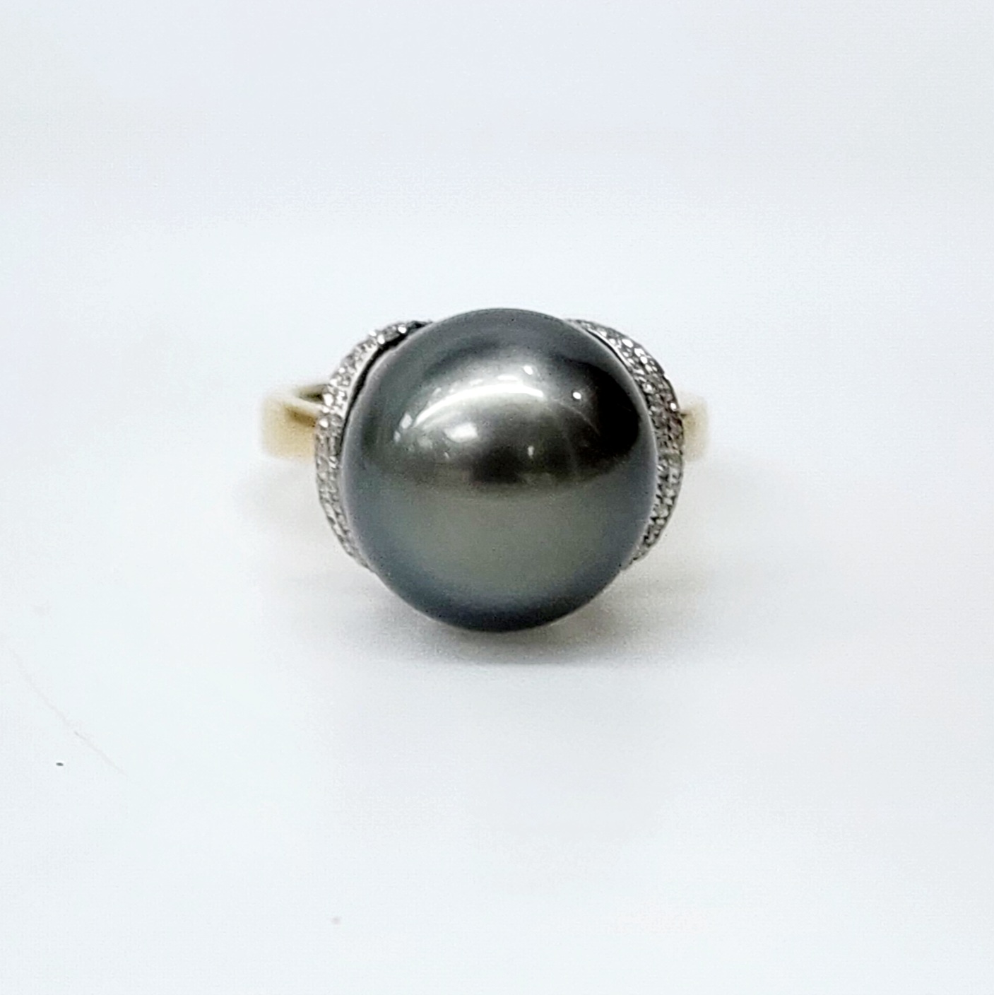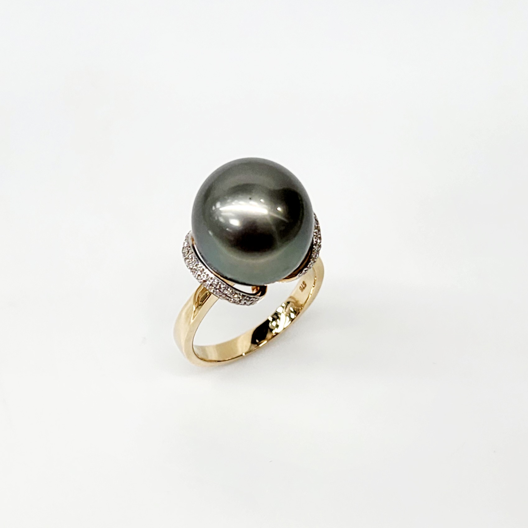 - The combination of the dramatic Tahitian black pearl, the ribbon-like diamond accents, and the rich yellow gold band creates a stunning piece of jewelry. The design blends classic and contemporary elements, making it a timeless addition to any jewelry collection. It’s perfect for adding a touch of elegance and sophistication to any outfit, from casual to formal.