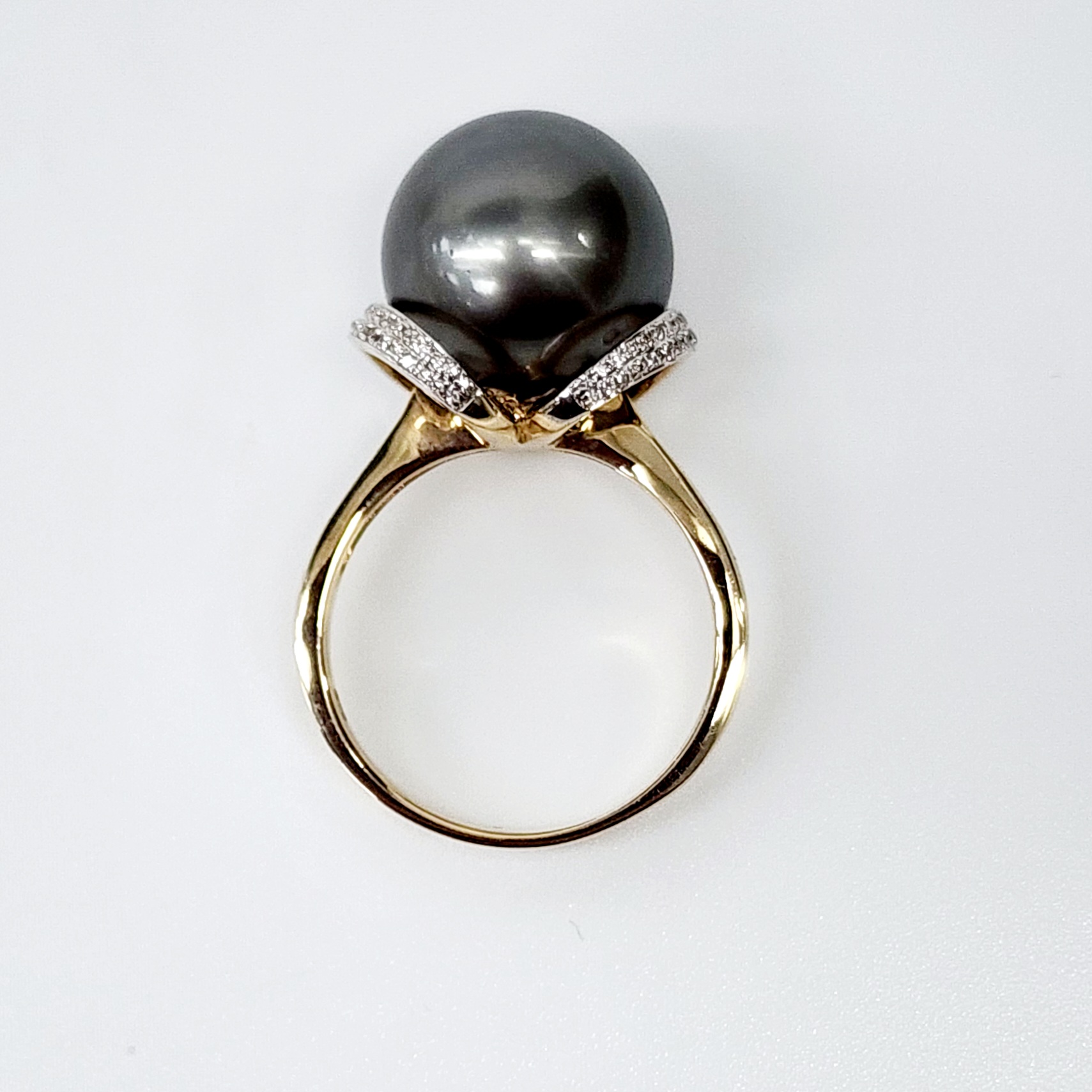 9ct Yellow Gold 14mm Tahitian Black Pearl Ring with Diamond Setting