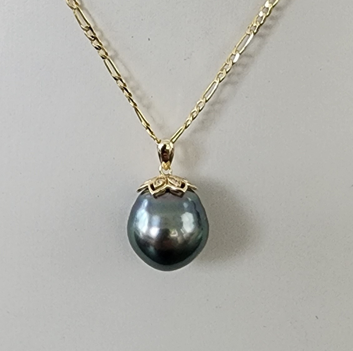 9ct Yellow Gold 14mm Round Teardrop Cook Island Black Pearl with Diamond Set Cap