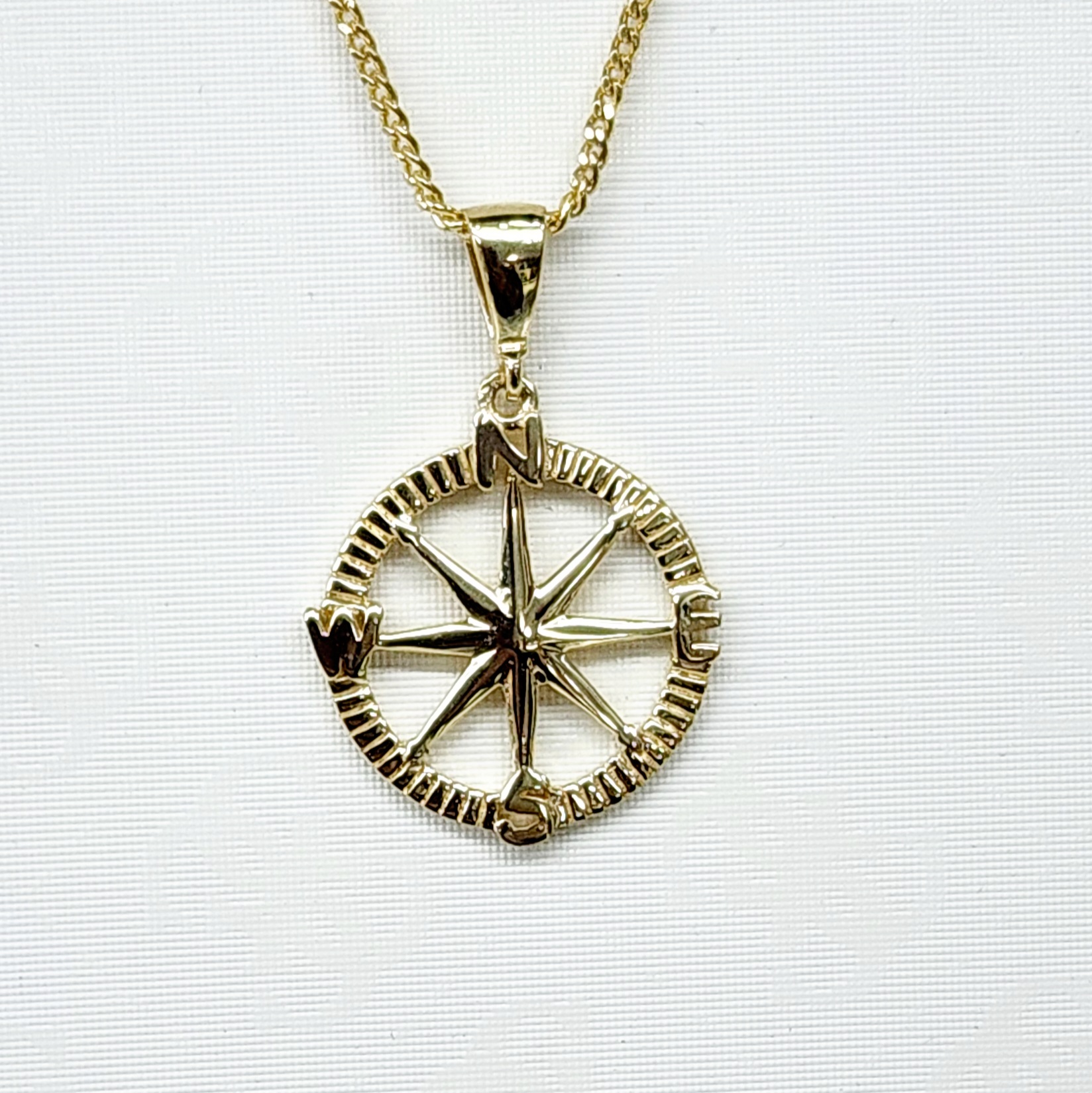 This Stunning North East South West compass pendant has an appealing nautical look,crafted in 9ct yellow gold with one star to make it stand out. A symbol of guidance.