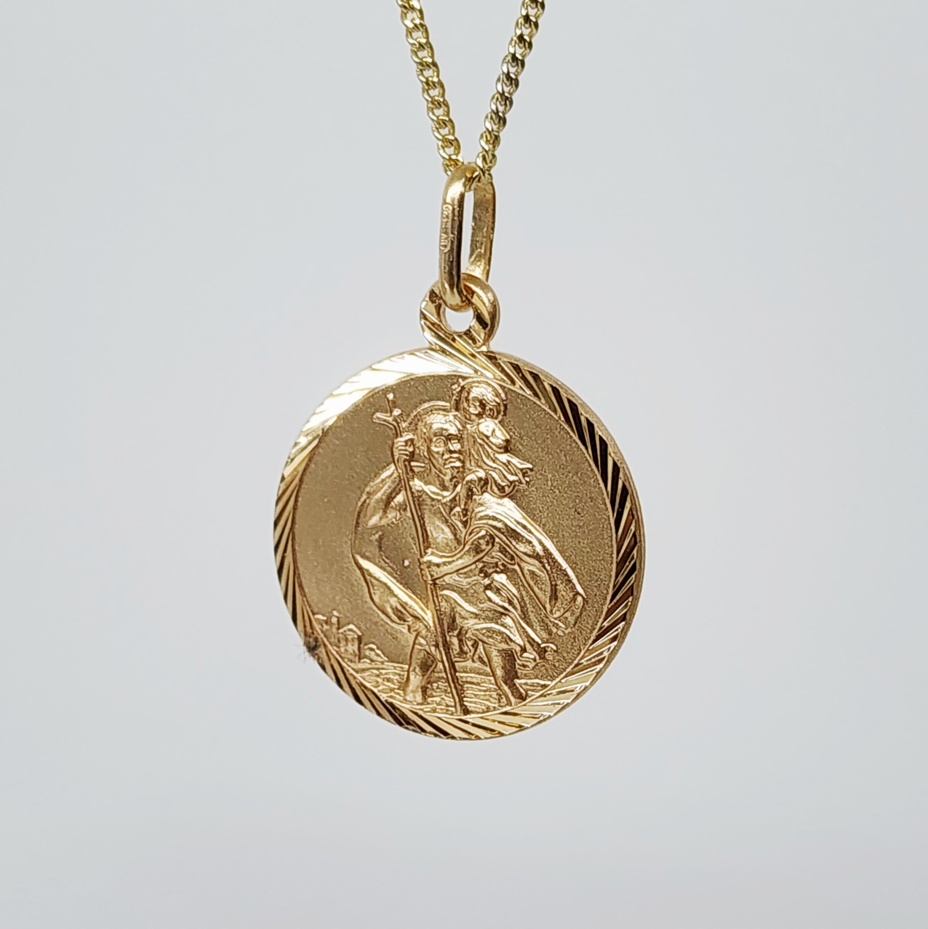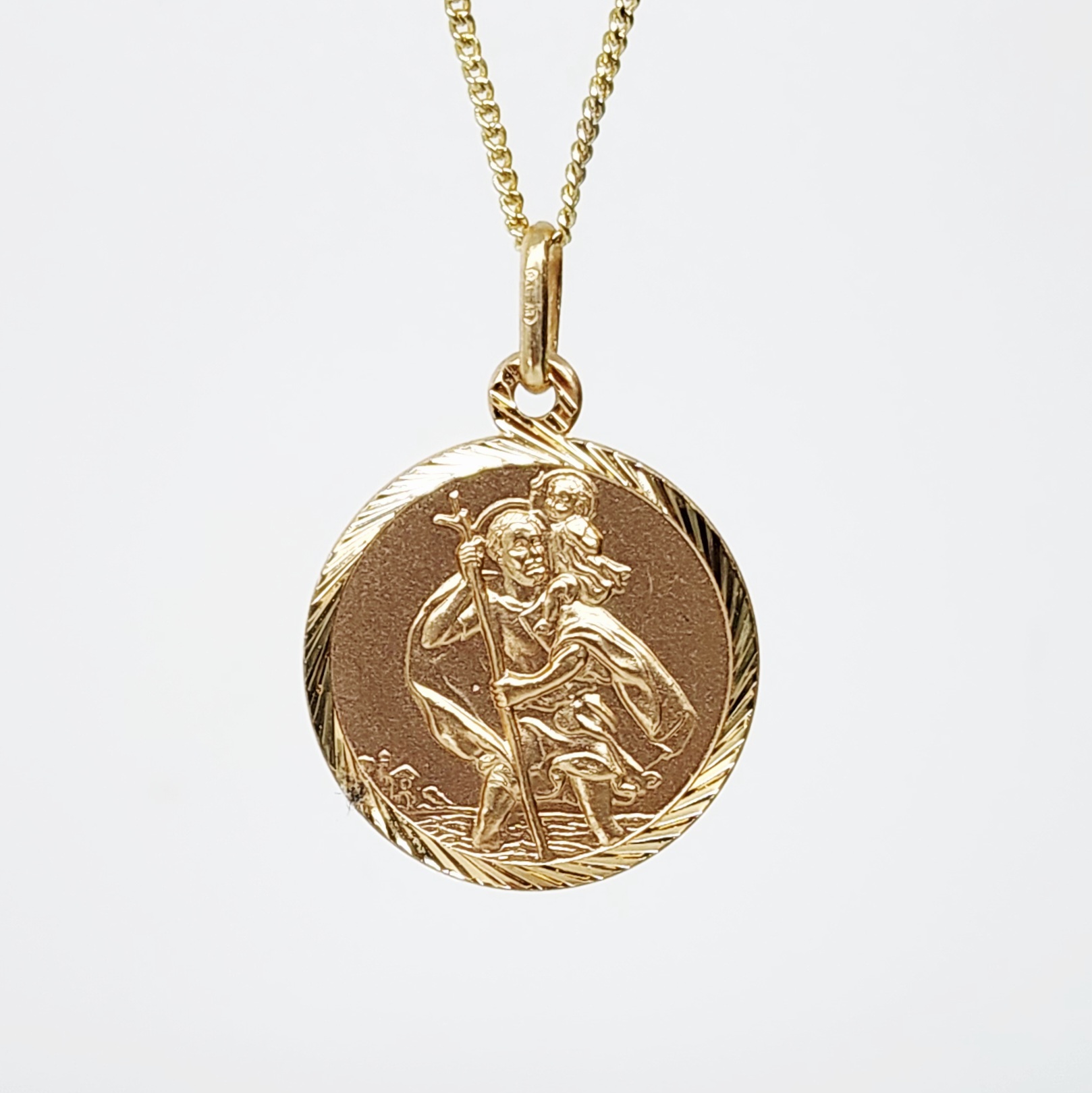 A traditional 9ct gold Saint Christopher pendant with a decorative diamond cut edge border to the front.