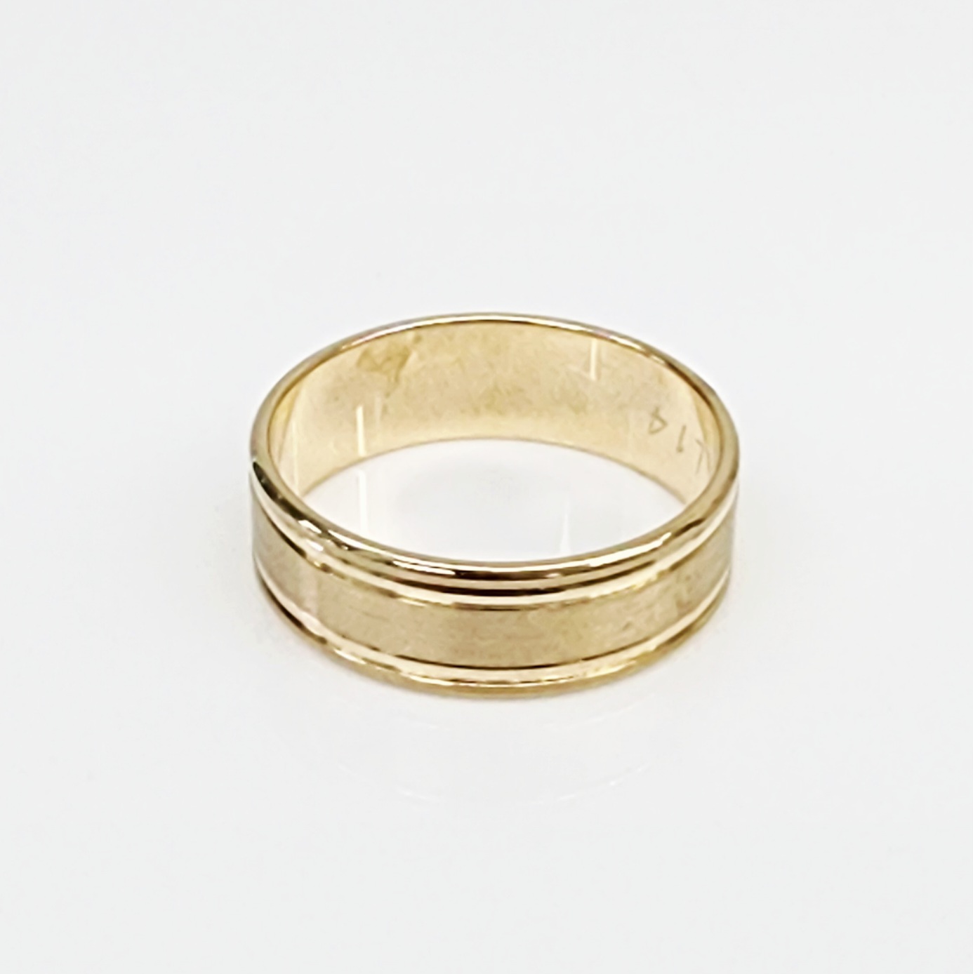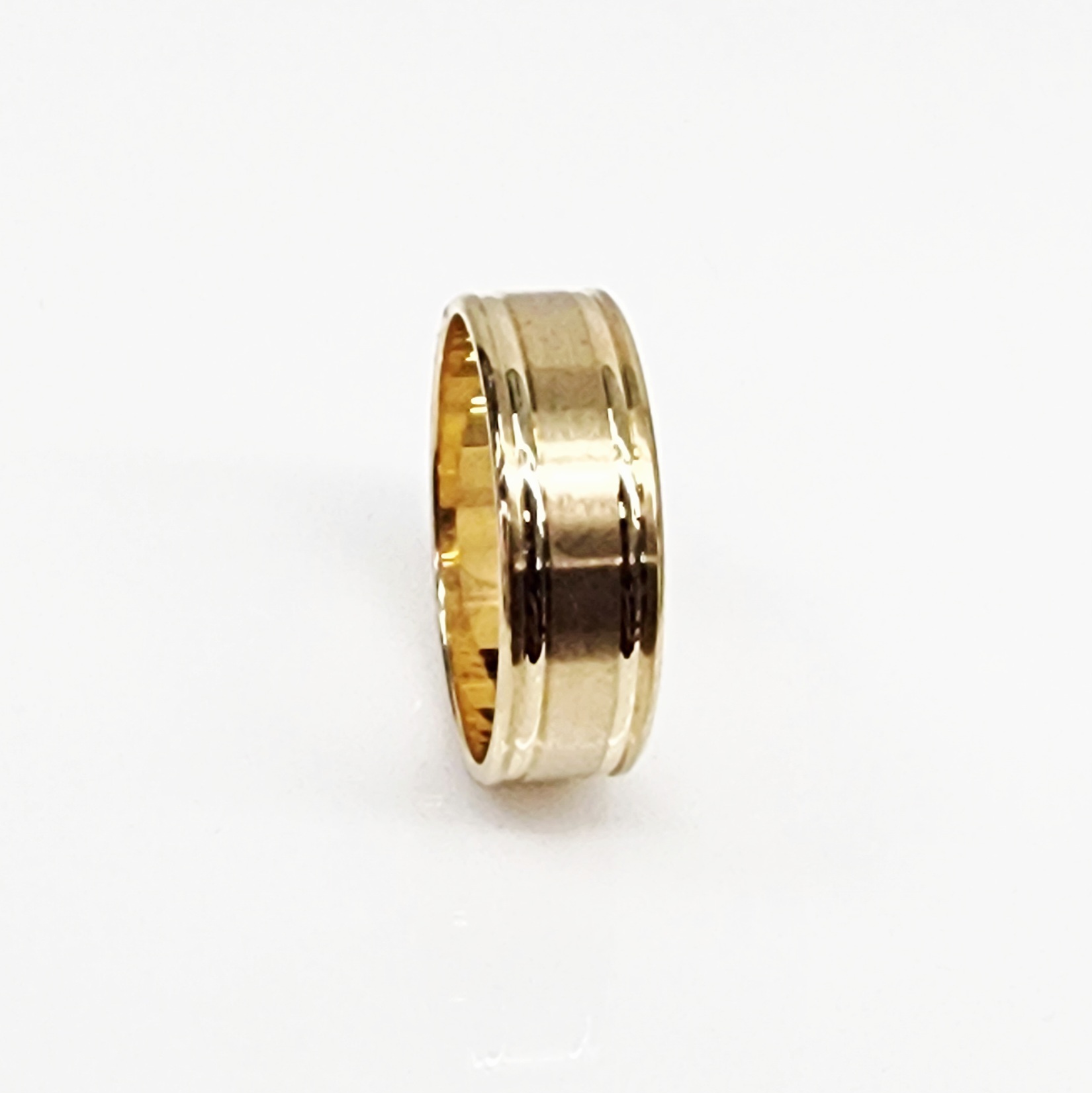 This timeless 9ct yellow gold wedding band features a bold 7mm wide profile with sleek double groove detailing that adds a refined and modern edge. The combination of a satin-finished centre and high-polished edges enhances its elegant contrast and visual depth.