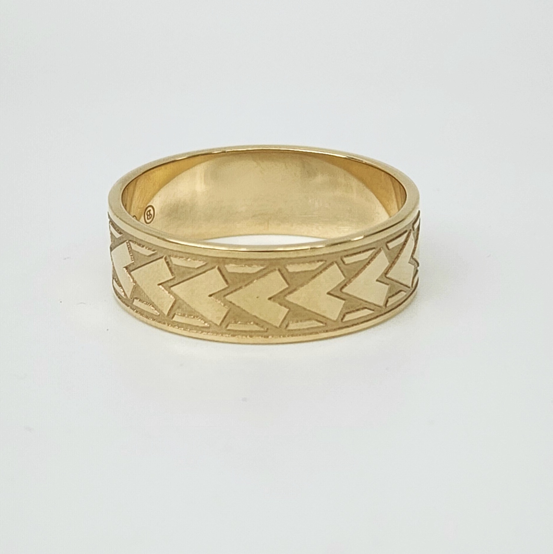 This 9CT Yellow Gold Wedding/Dress Ring is a stunning piece crafted for those who appreciate intricate designs and timeless elegance. The ring is 8mm wide and 1.20mm thick, providing a solid and substantial feel on the finger. Its standout feature is the laser-engraved diamond spear Polynesian design that wraps seamlessly around the band, offering a touch of cultural heritage and artistry. The precision of the laser engraving ensures every detail of the pattern is captured, creating a beautiful and unique texture that makes this ring a perfect choice for both special occasions and everyday wear.