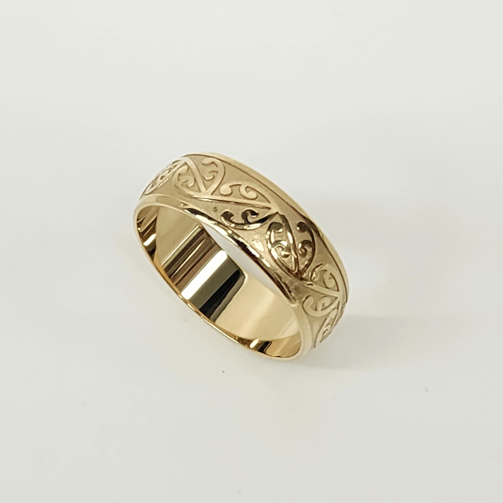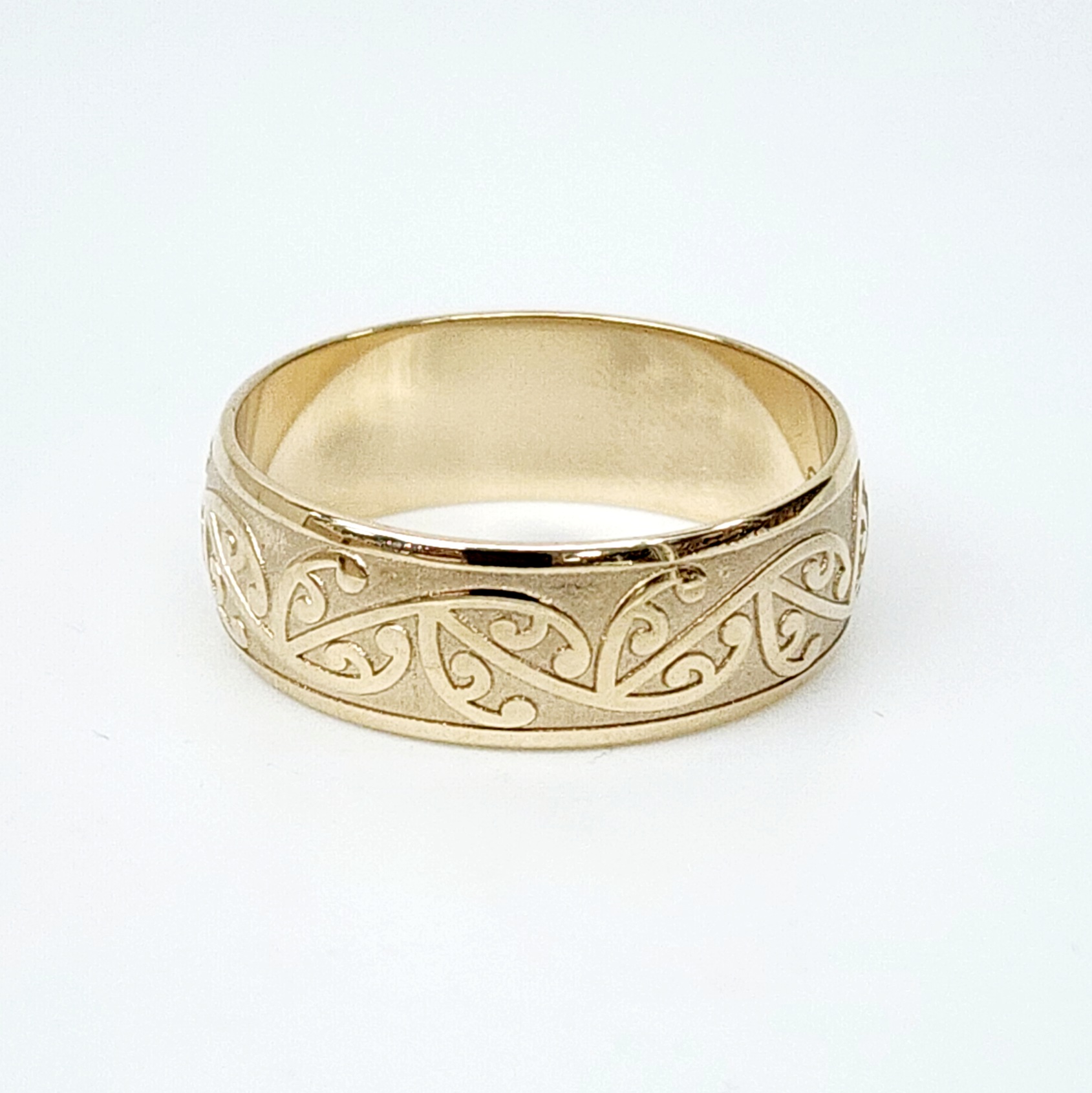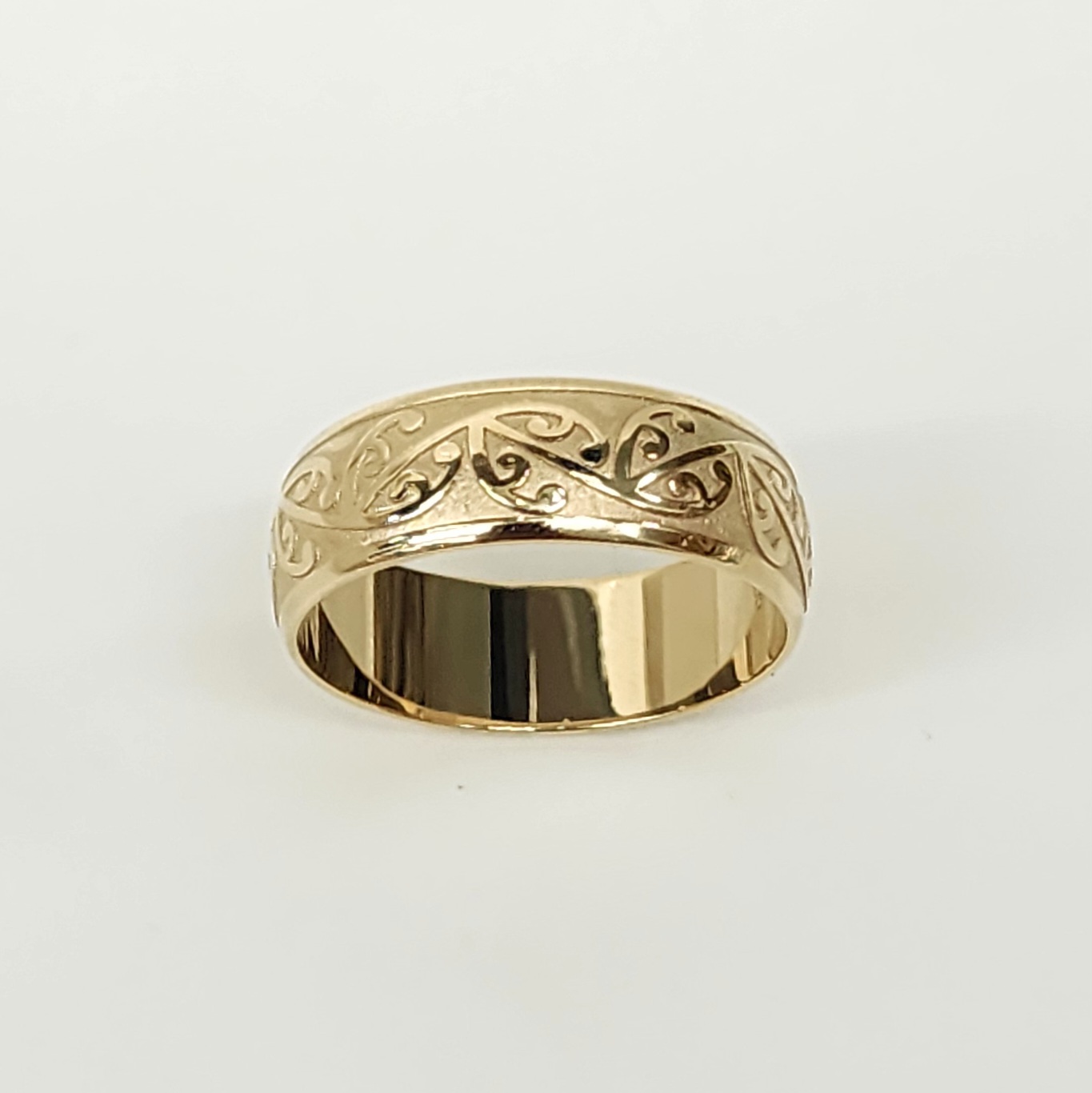 9ct Yellow Gold 8mm Wide Koru Patterned Wedding Ring