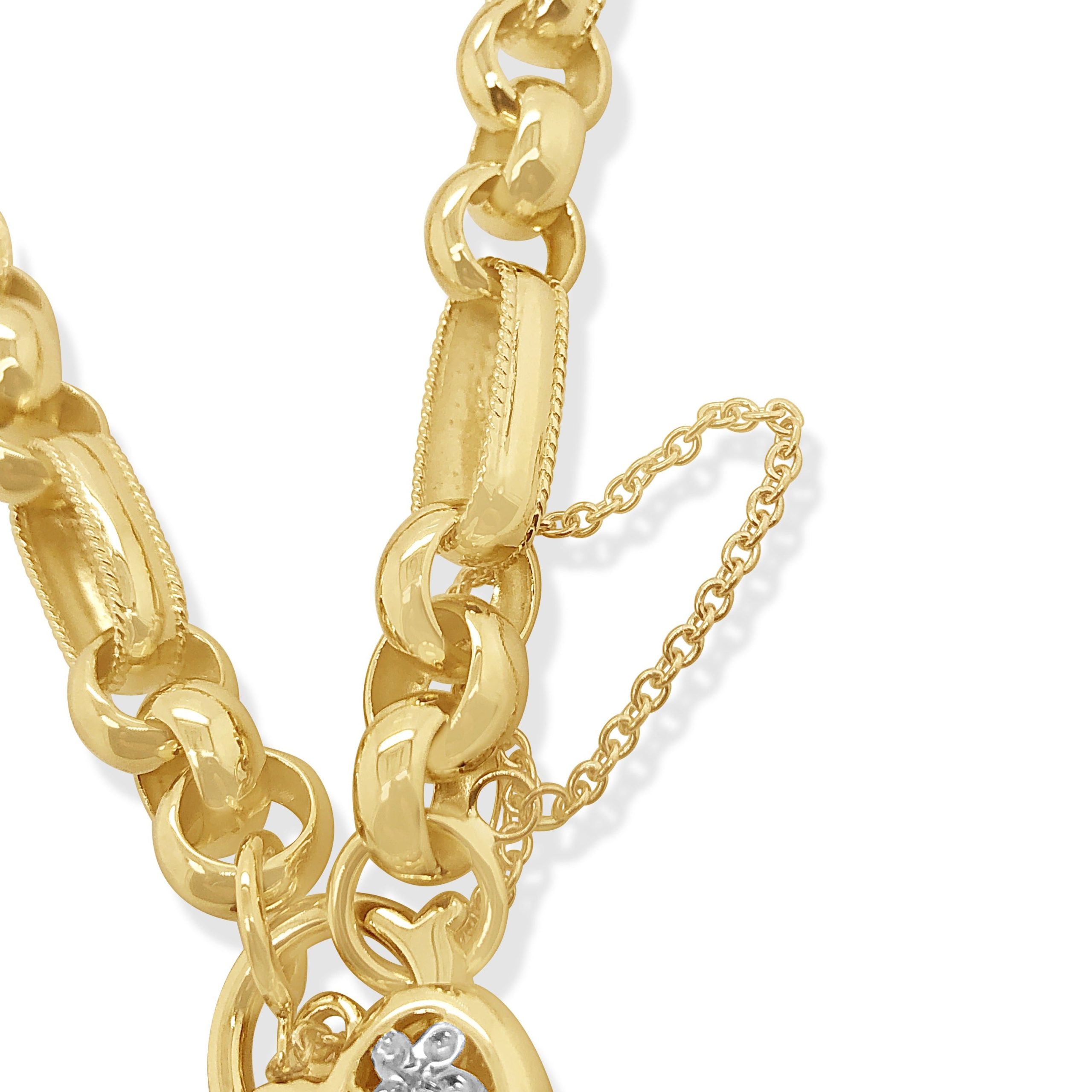 Featuring a classic belcher chain design, this 9ct yellow gold bracelet is finished with a luxurious diamond heart clasp. Measuring 22cm, it adds a touch of elegance and charm to any outfit.