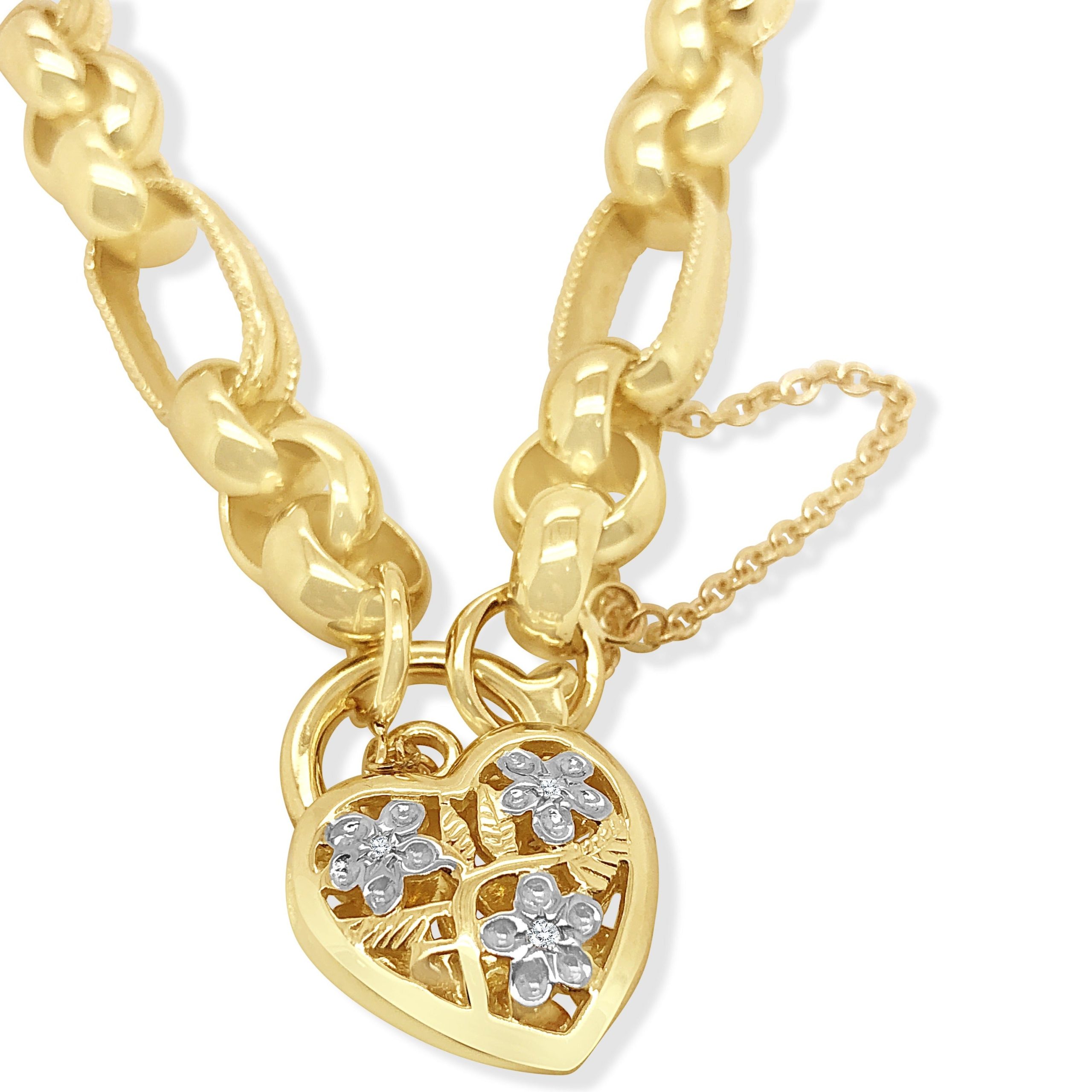 9ct Yellow Gold Belcher Bracelet with Diamond Heart Clasp – 22cm