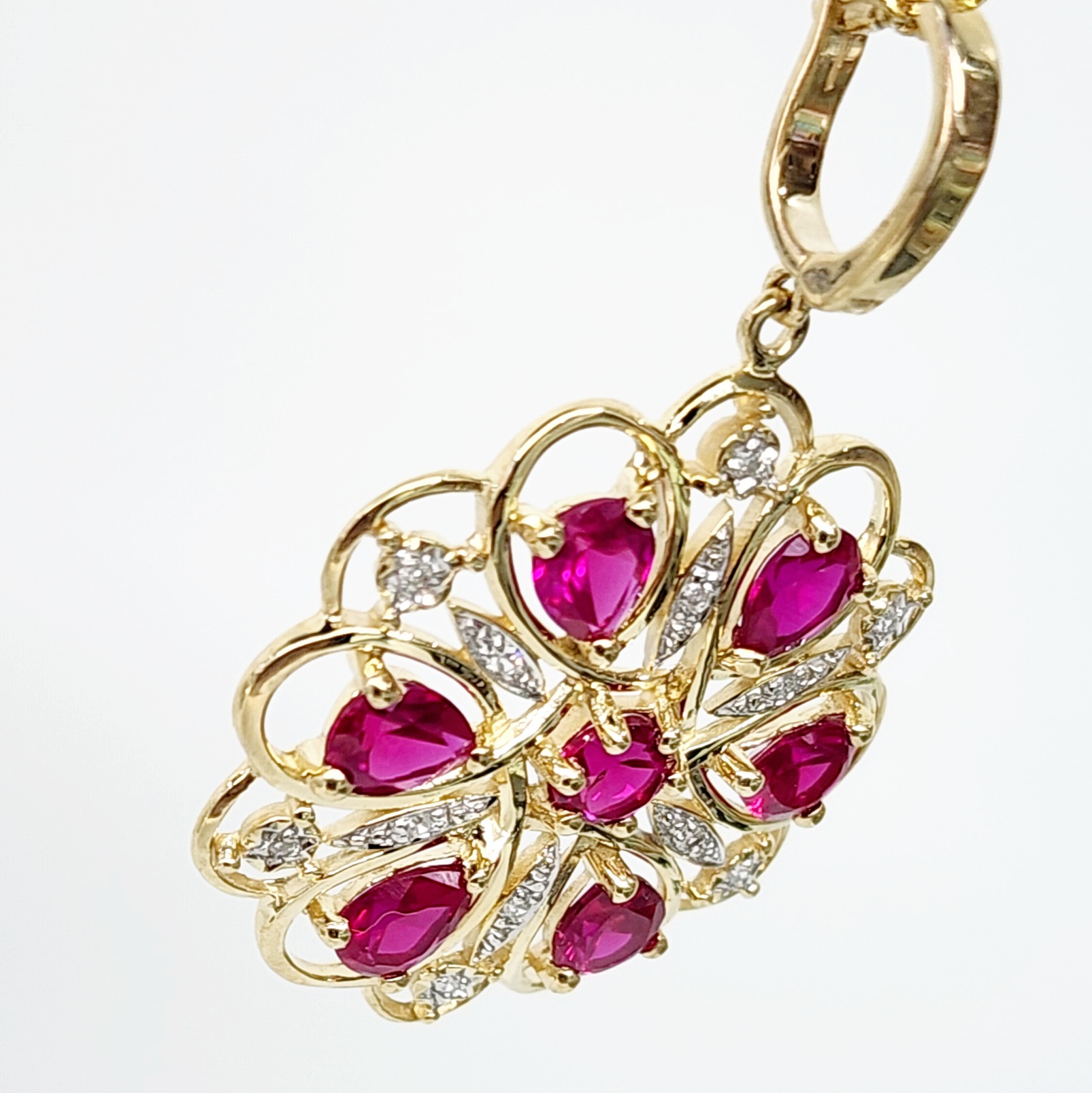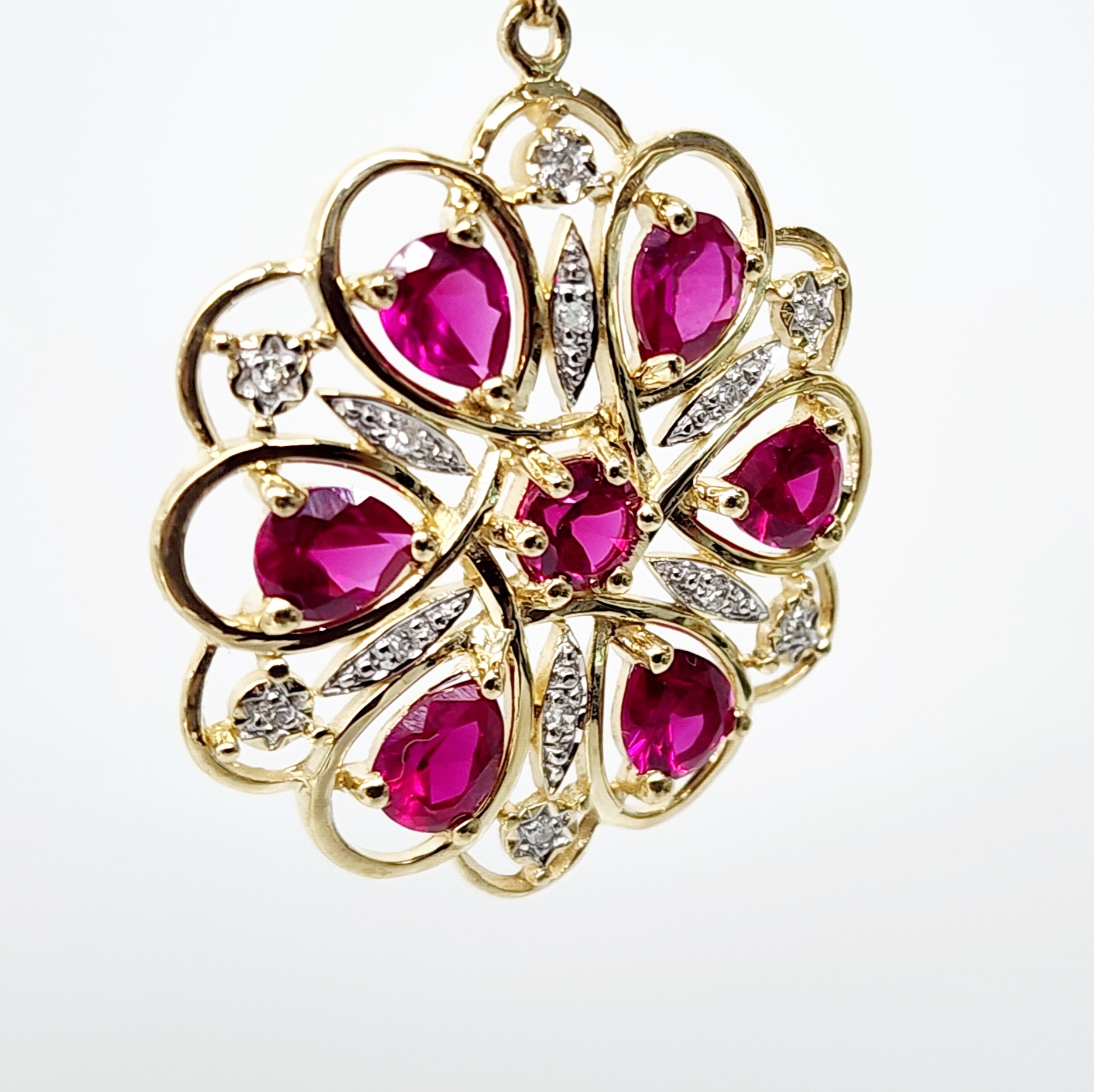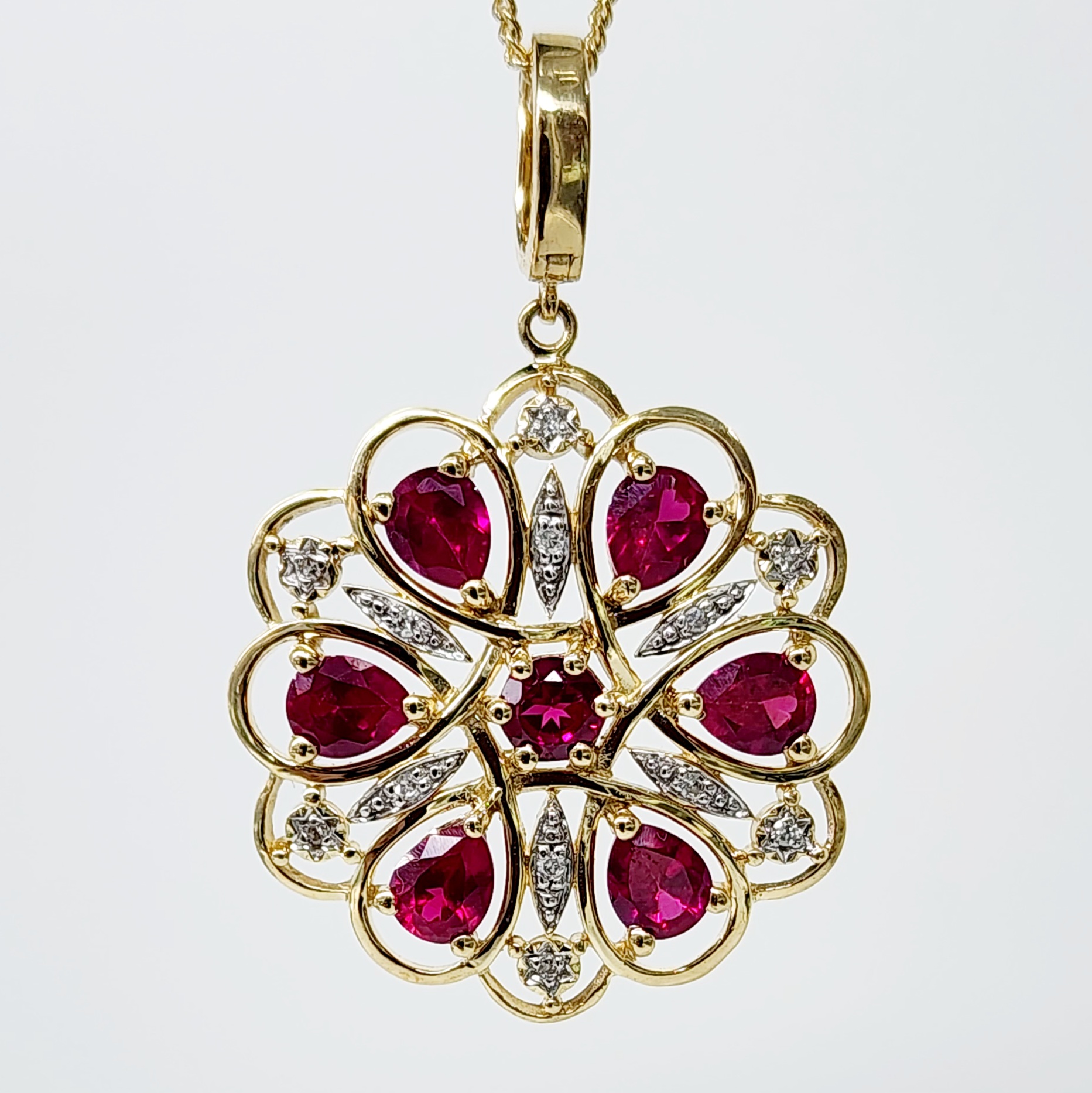 This exquisite pendant showcases a beautiful flower design crafted in 9-carat yellow gold. At its heart lies a vivid created ruby, radiating a deep red hue that symbolizes passion and elegance. The petals are accented with delicate natural diamonds, adding a touch of sparkle and sophistication.