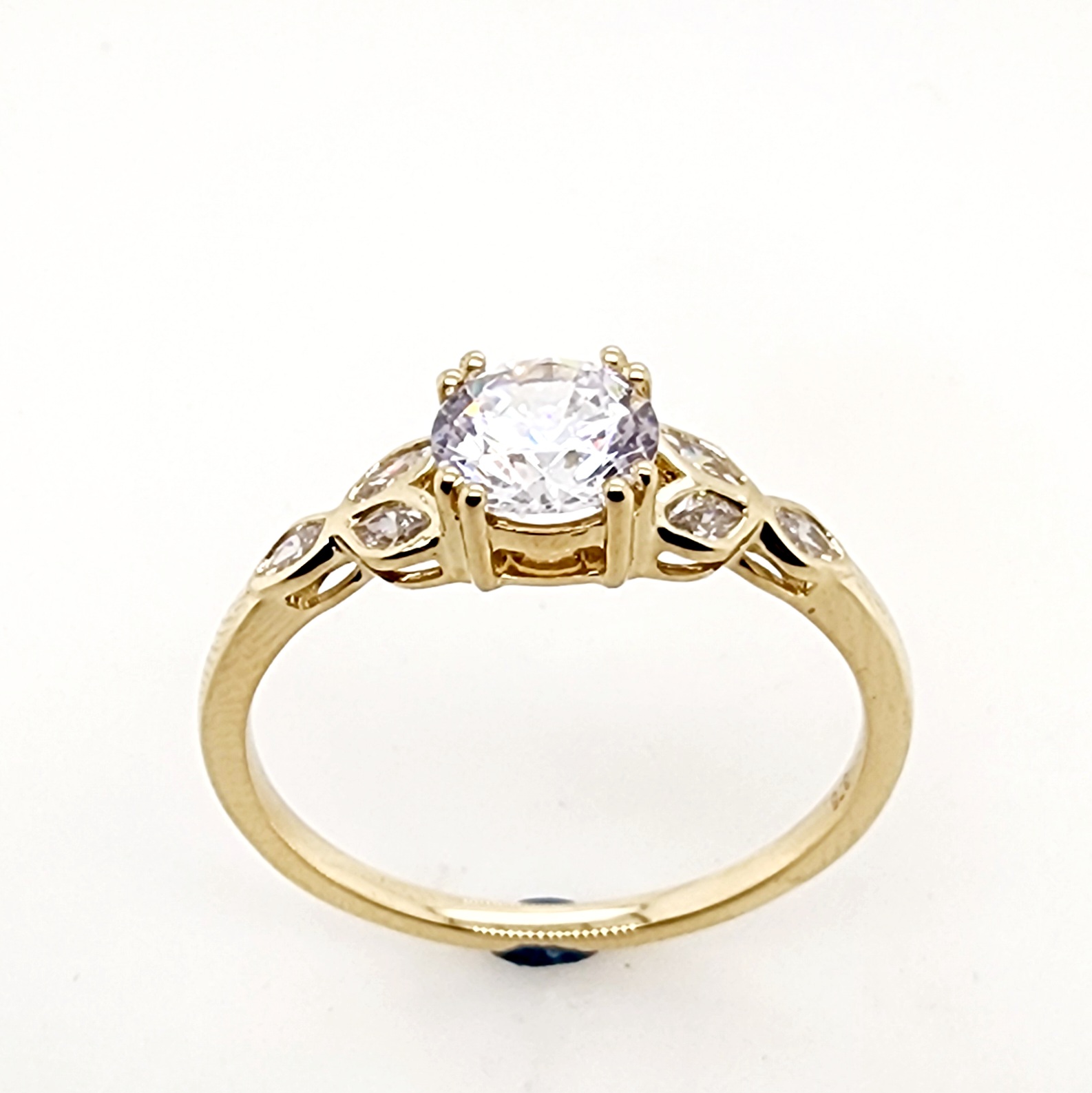 Unique womens engagement ring features a 6.50mm round brilliant cut CZ and 6 oval cut accent CZ’s. The accent CZ’s are rubover set in petal vine settings that flank the center stone. All CZ’s are set in solid 9ct yellow gold high polished mounting. This ring is unique and has the right amount of flash to be worn every day.